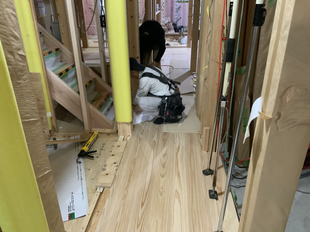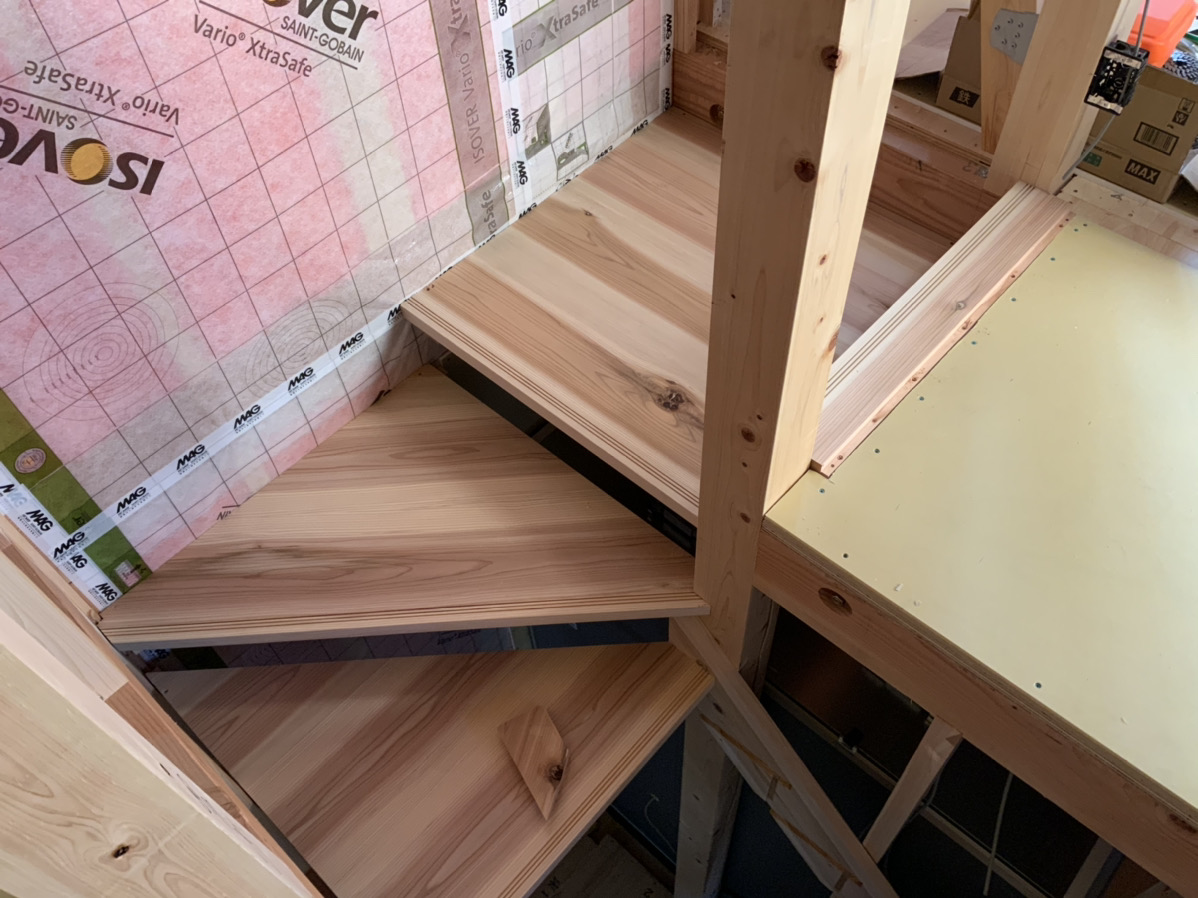 杉材を使用した階段施工が進んでいます。床も同じく杉のフローリングです。