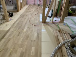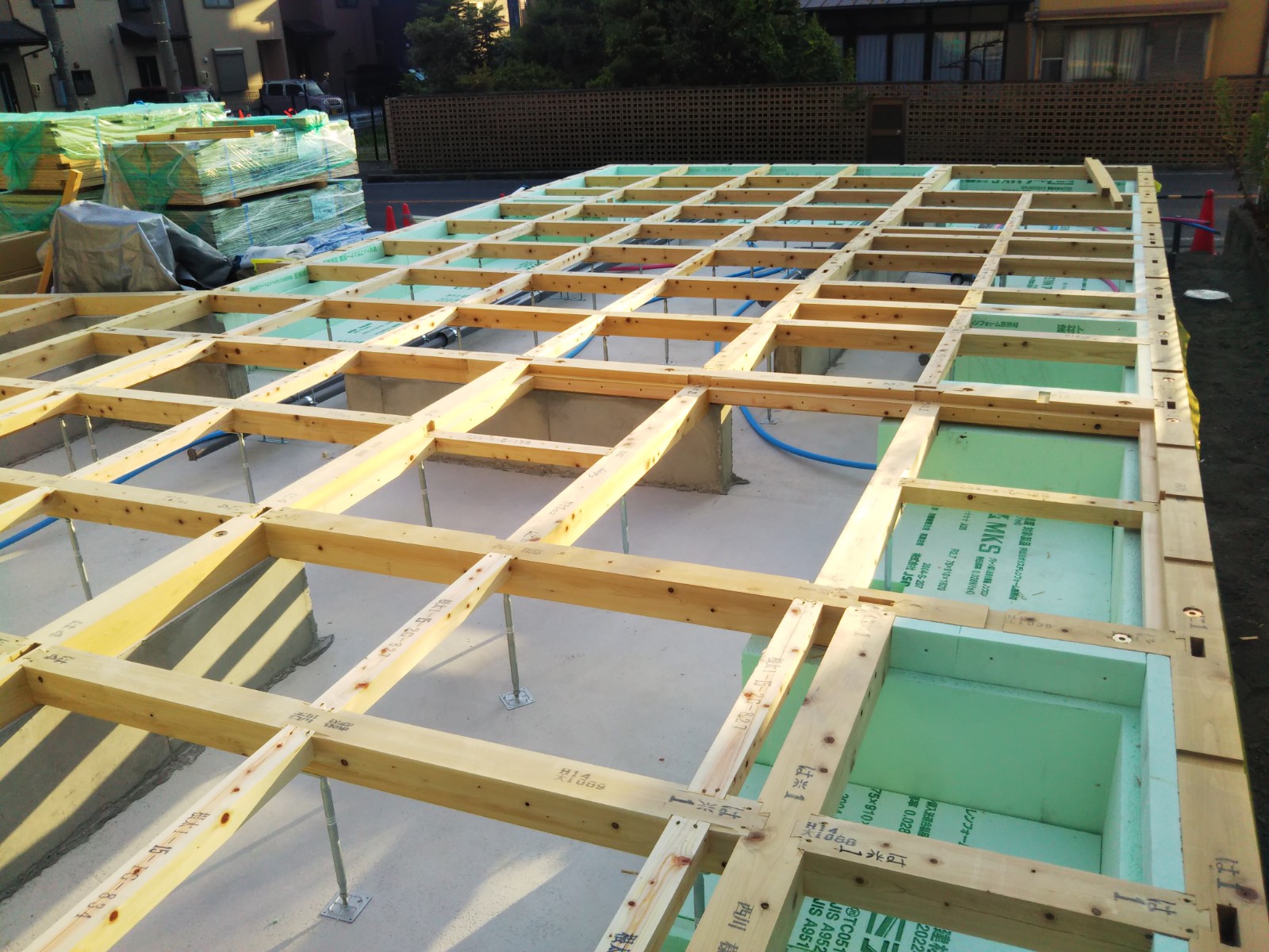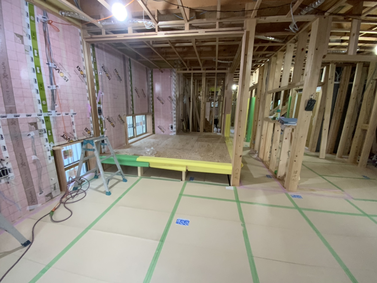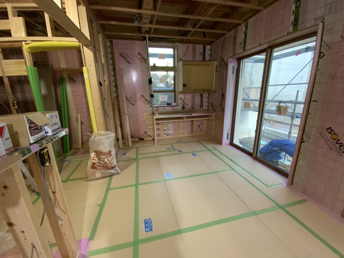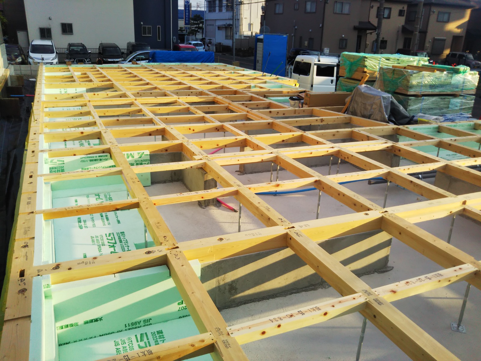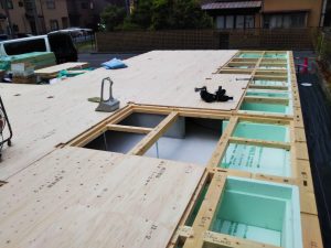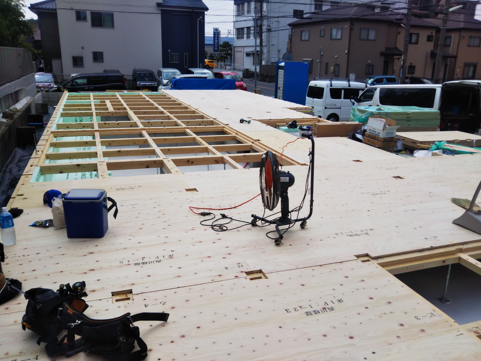 土台伏せの翌日、合床敷きが進んでいます。和室の畳部分は床が少し下がるため合床も下げて敷いていきます。