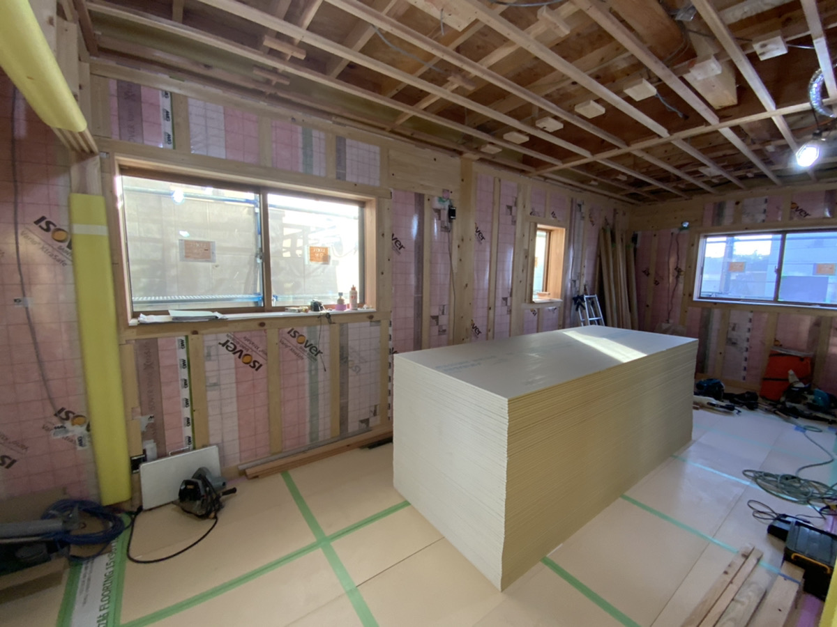 1階には壁用のプラスターボードが搬入され山積みになっています。