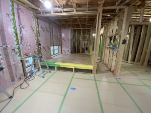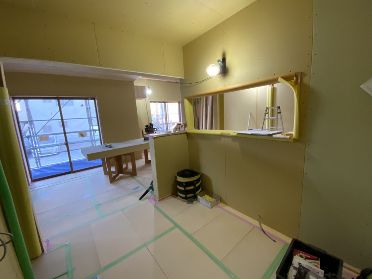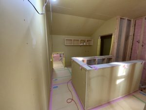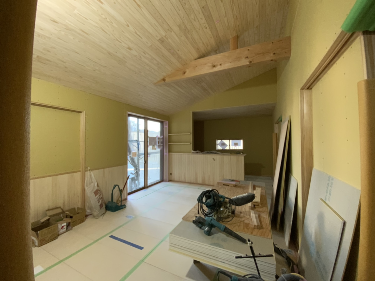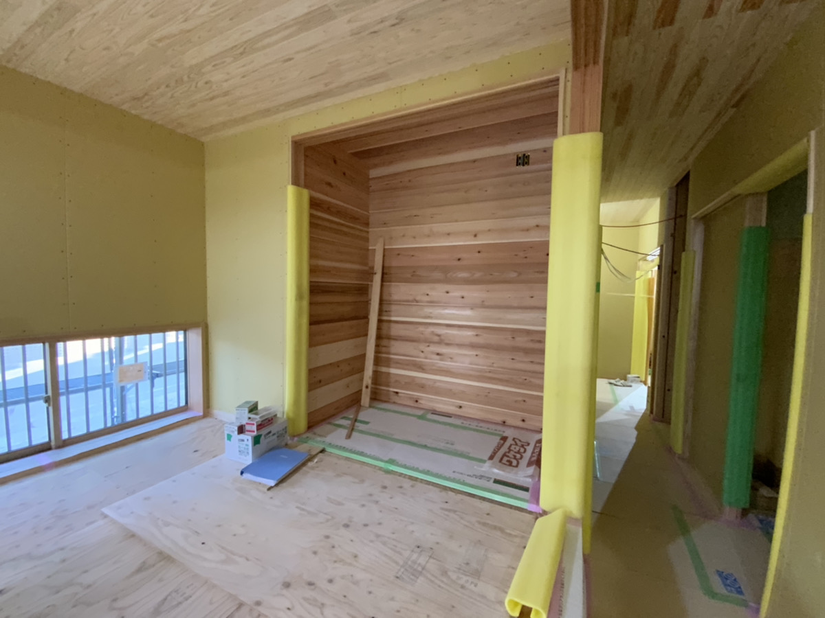 1階壁のプラスターボード施工状況です。腰板や収納の板張りも進んでいます。
