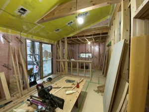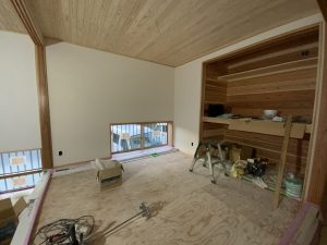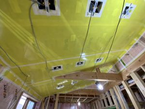 平屋の勾配天井も照明の配線が終わり、このあと杉の羽目板が張られます。