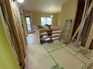 内部はトイレカウンターやカウンターデスクなど造作工事が進んでいます。