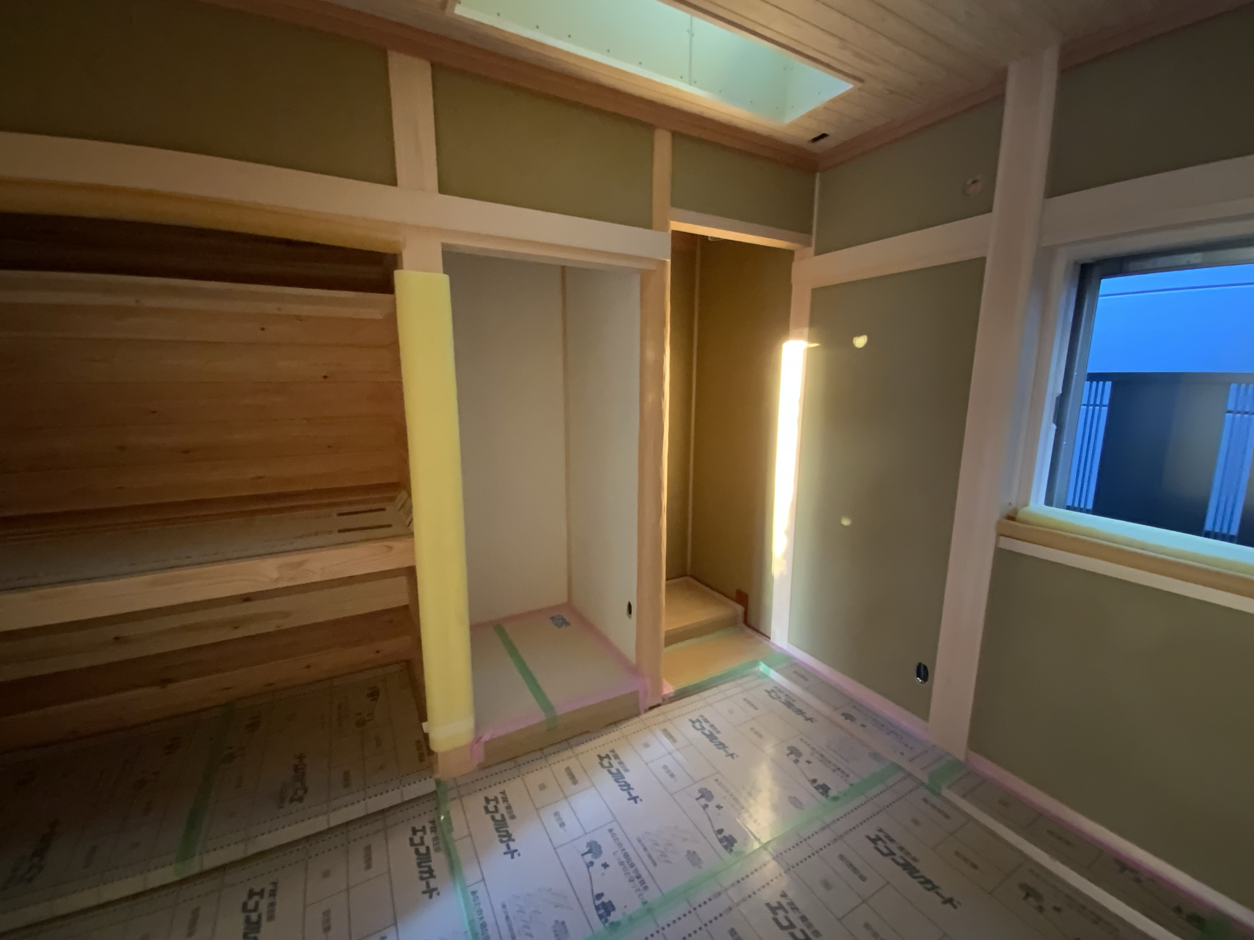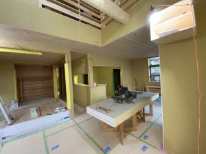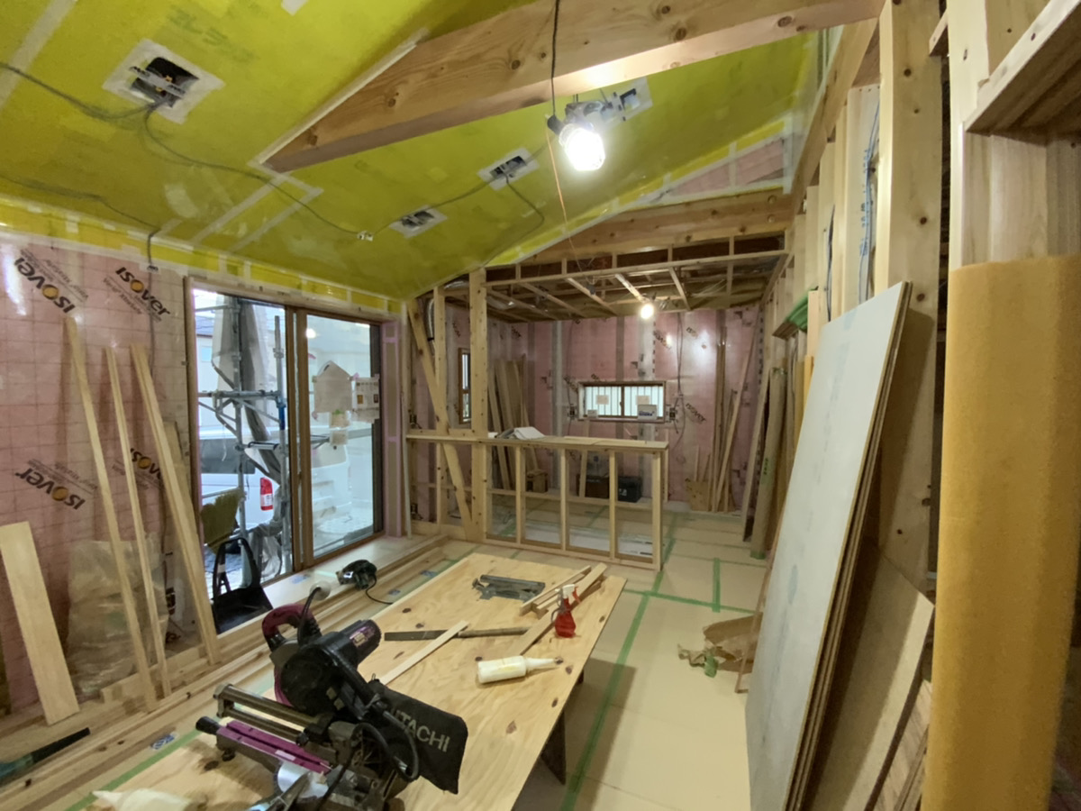 月末の見学会に向けて照明取付工事、製作建具・家具工事などの作業がどんどん進んでいきます。