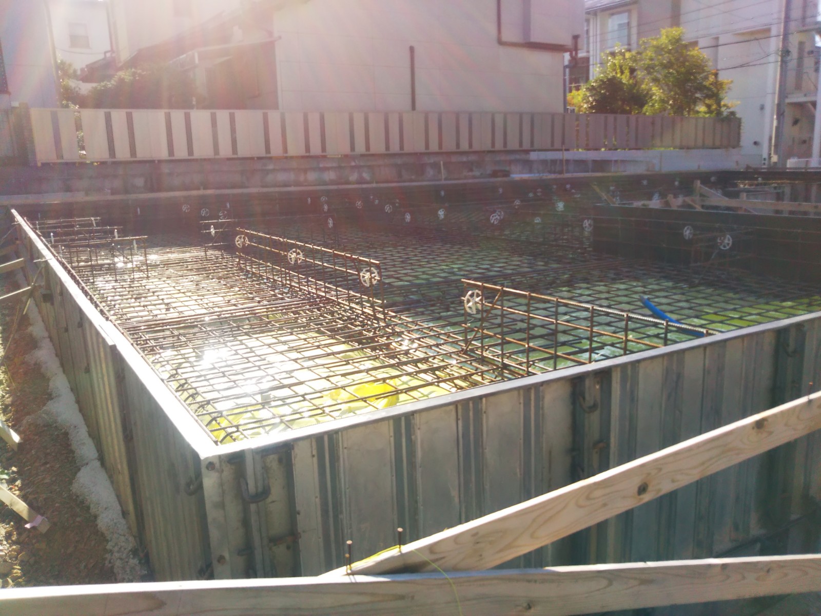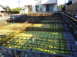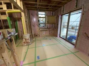 土台伏せが完了しました。後ろに控えている合床を敷き、来週の上棟日まで雨に濡れないよう養生します。