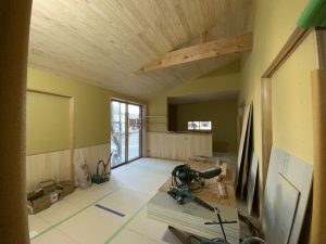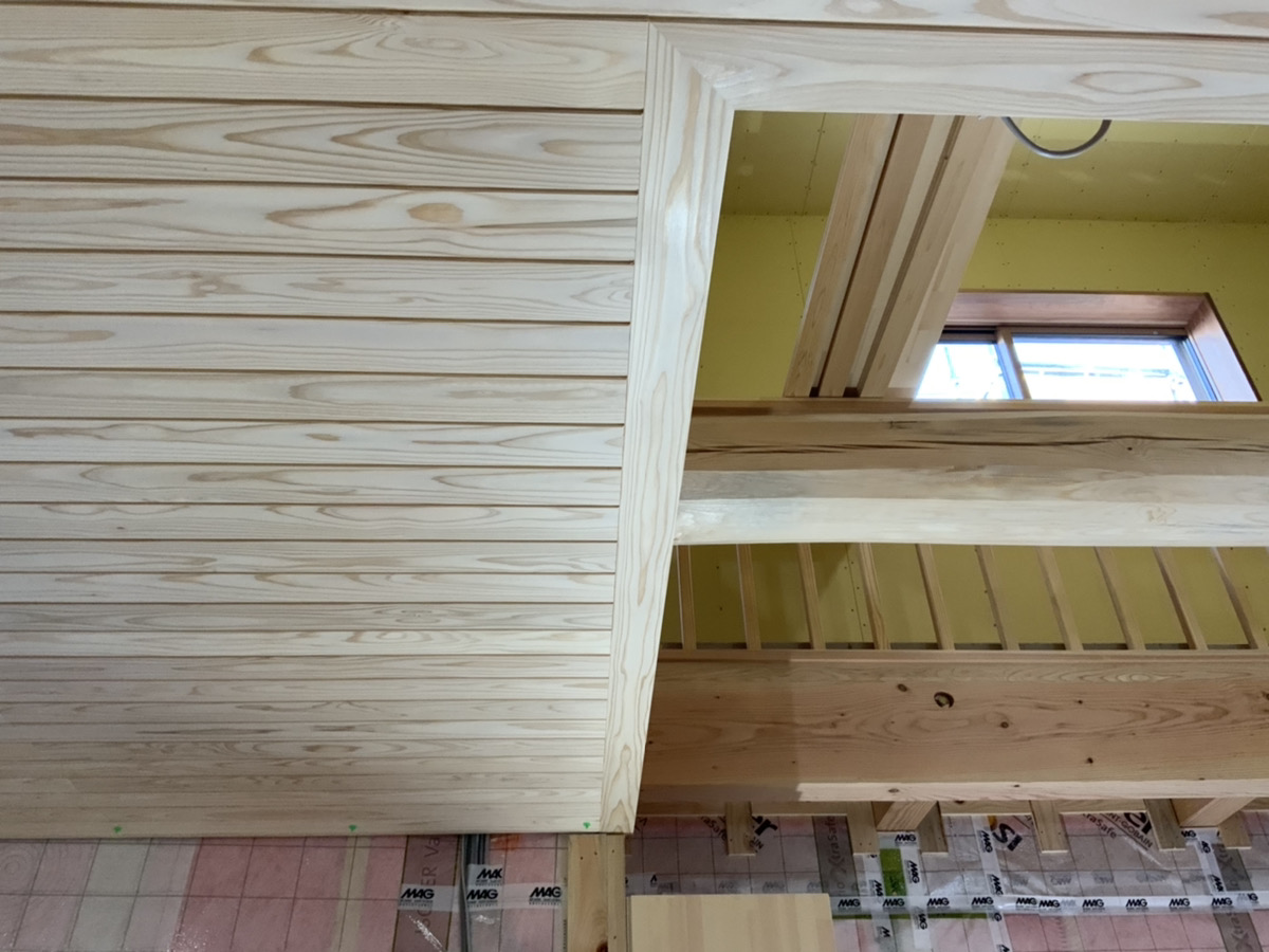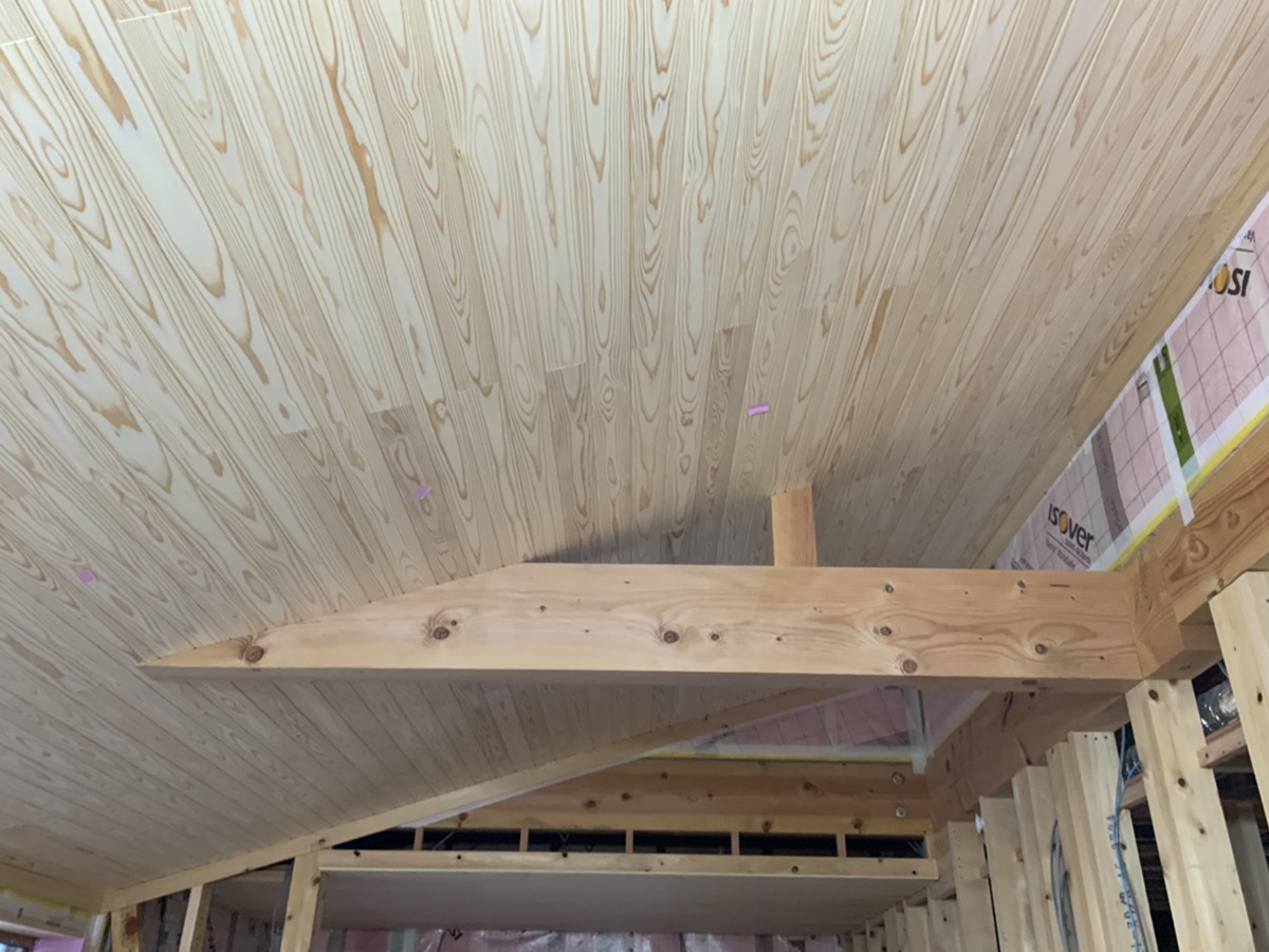 天井に杉板が張られました。白味の優しい色合いなのでお部屋が明るくなりそうです。