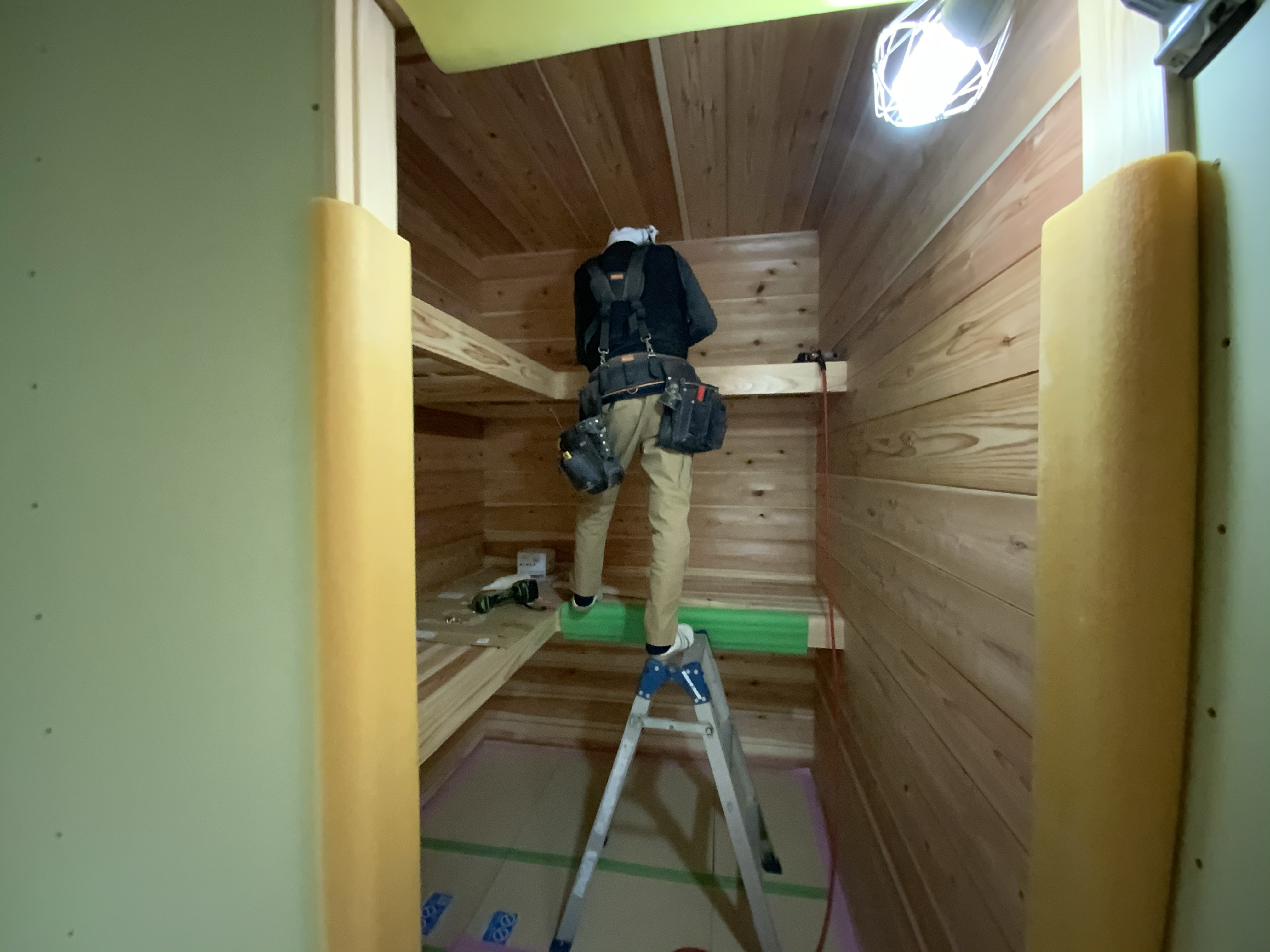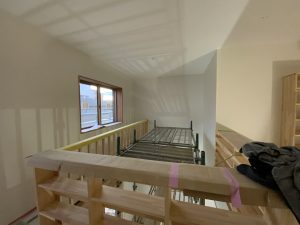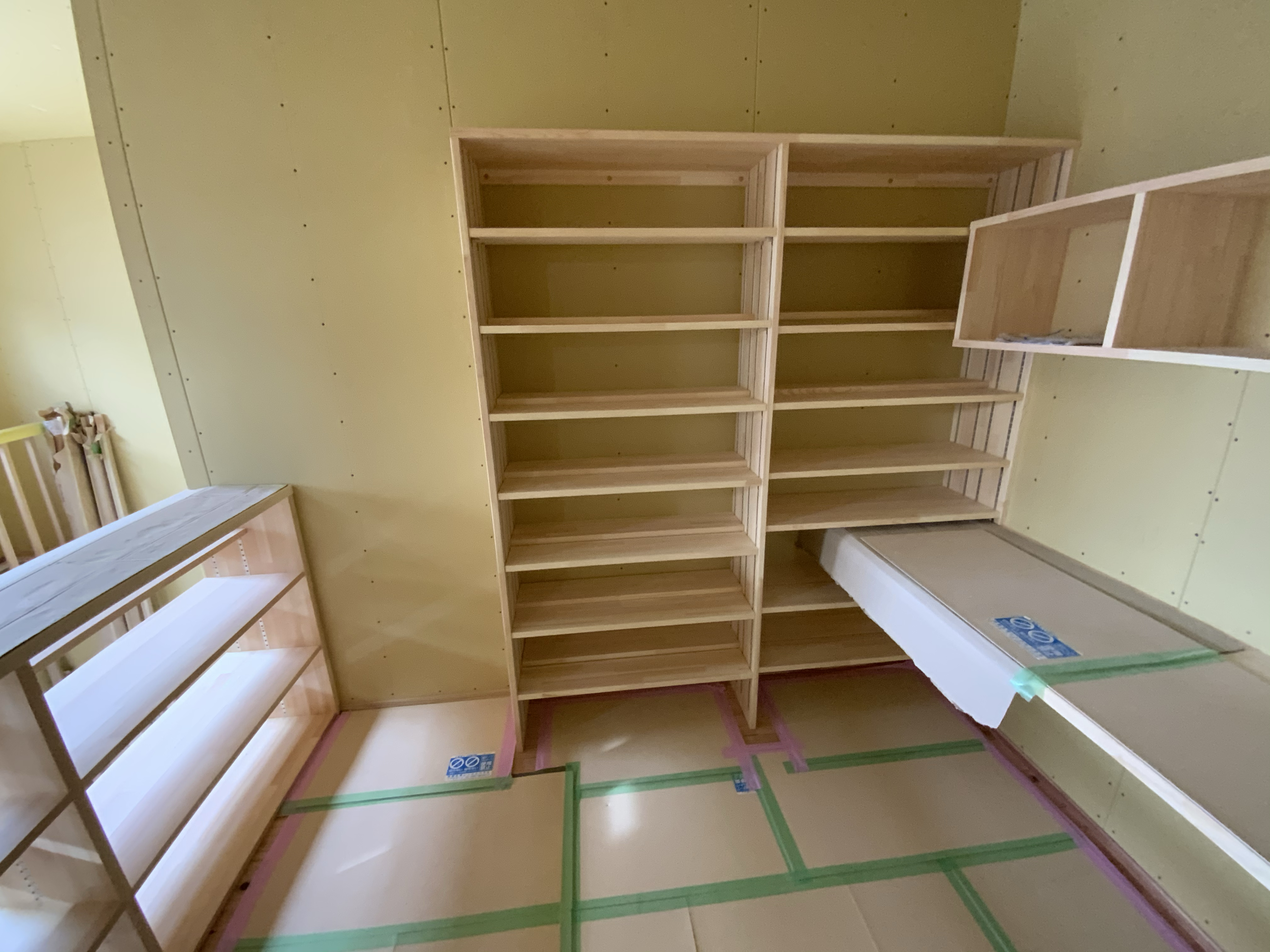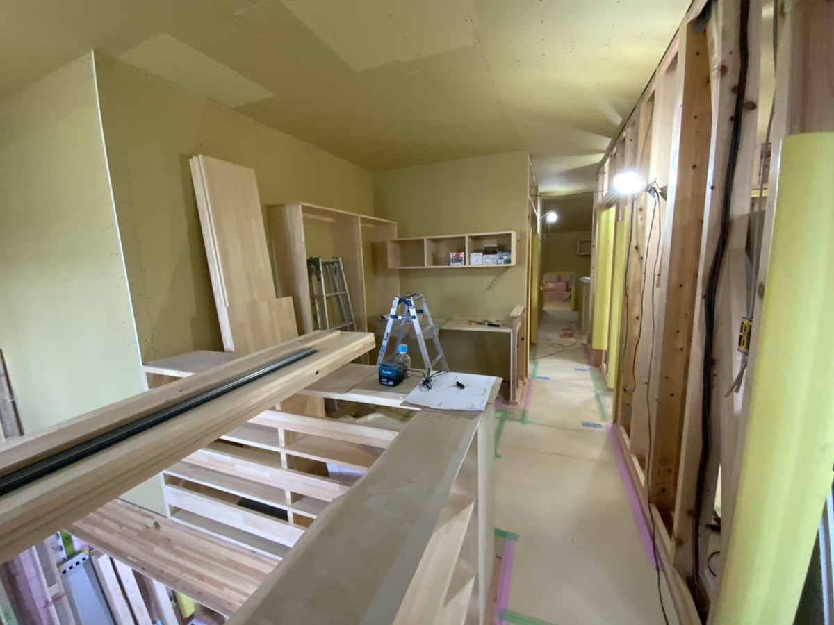 2階は壁のプラスターが施工されました。造作棚はその前にお客様の使いやすい高さを決めて取り付けておきます。
