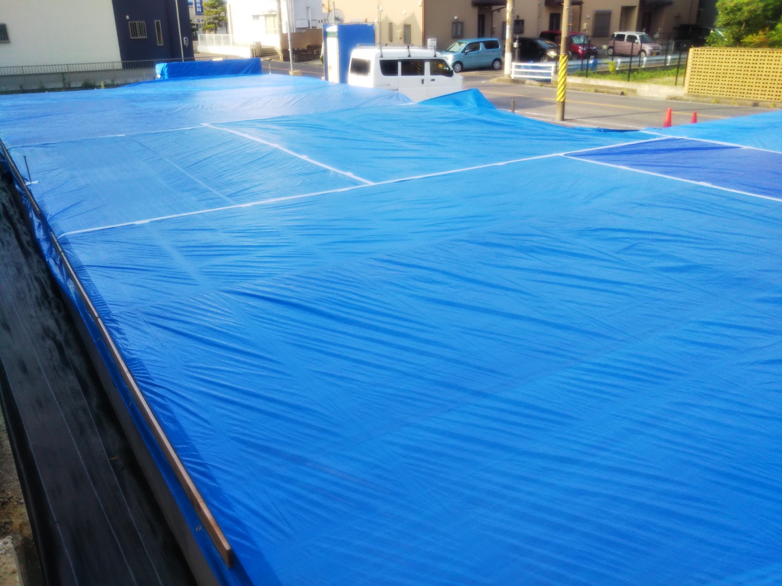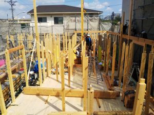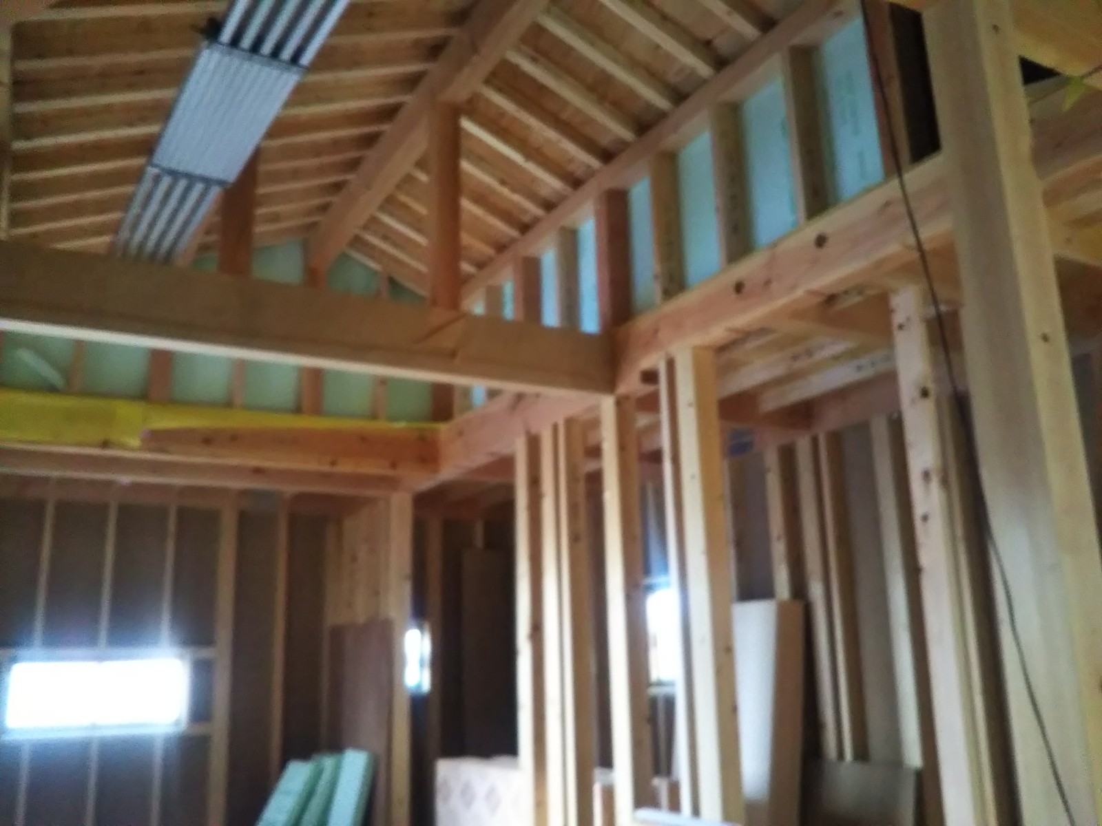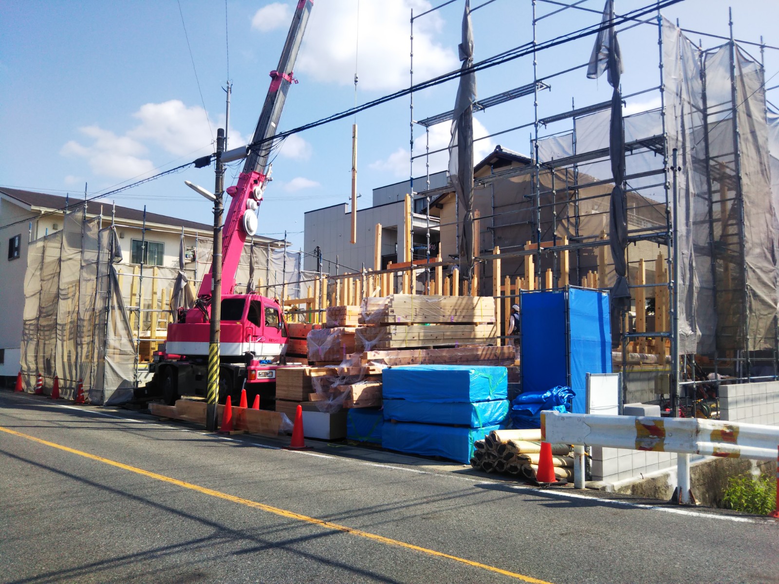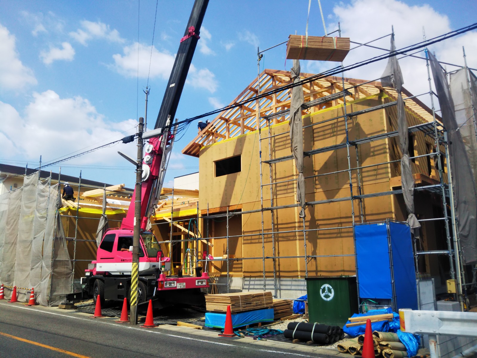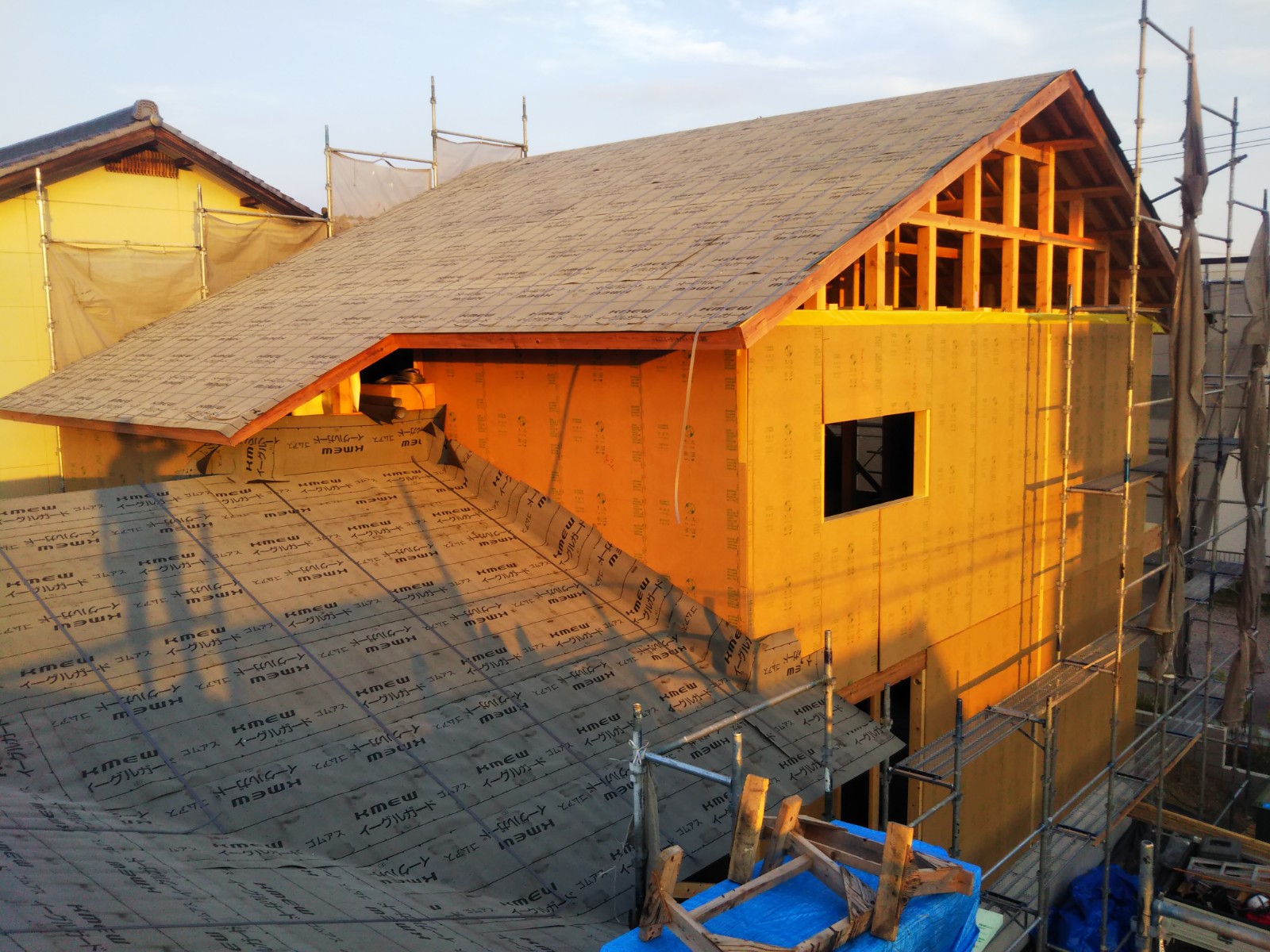 上棟日は天候にも恵まれました。2日目の夕方には無事屋根のルーフィング施工まで完了です。