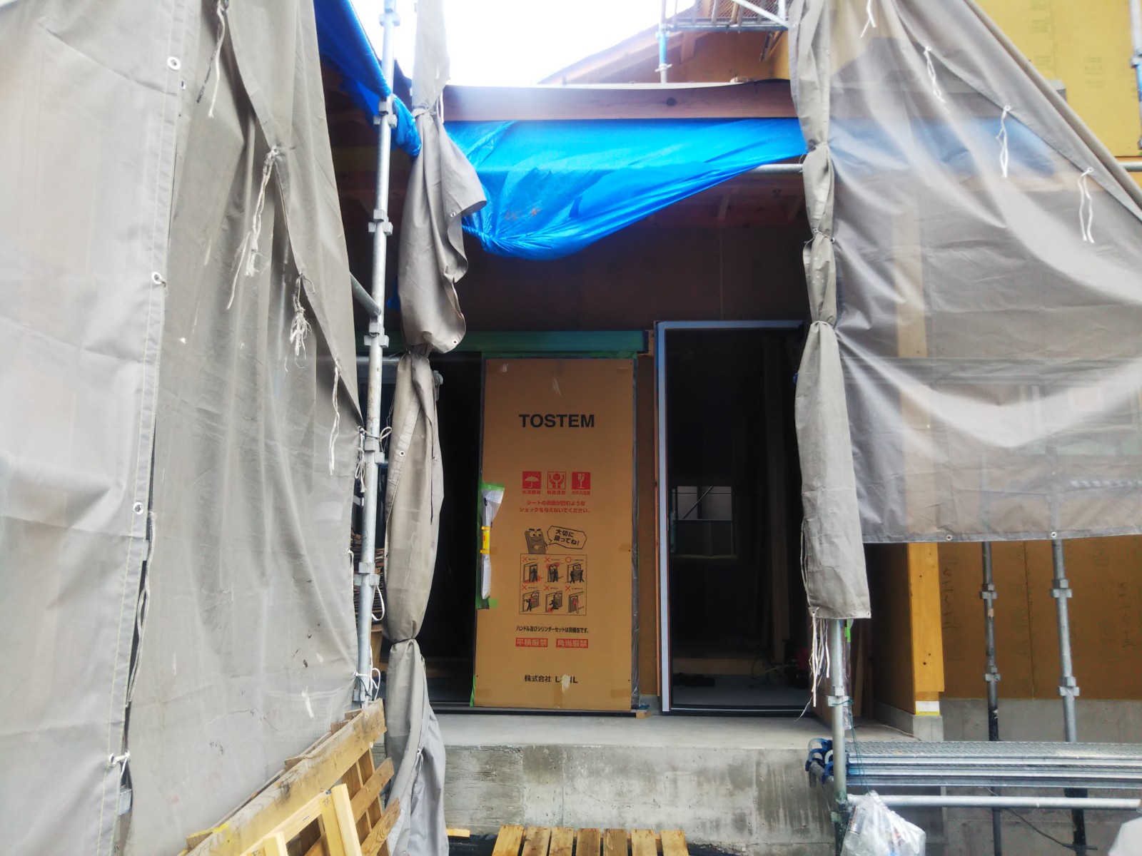 玄関戸、サッシが取り付けられました。二世帯住宅の現場なので玄関戸が2つ並んでいます。