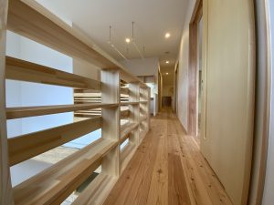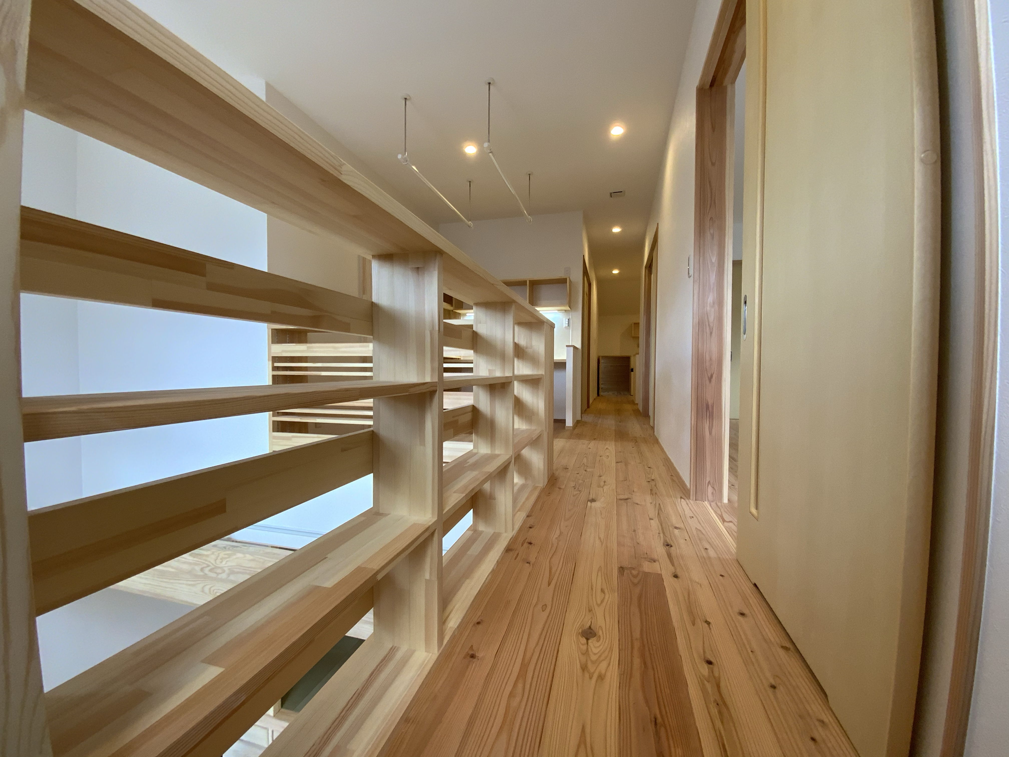 お布団を収納する棚は、湿気をためず清潔に保てるよう板の間に隙間を取ってスノコにします。