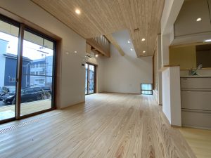 リビング内には吹抜けがあり、240㎜ほどある丸太梁は存在感があります。