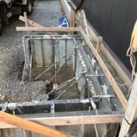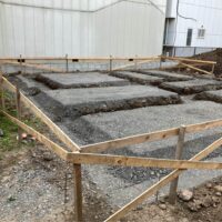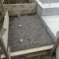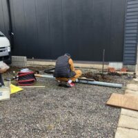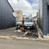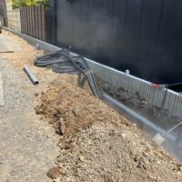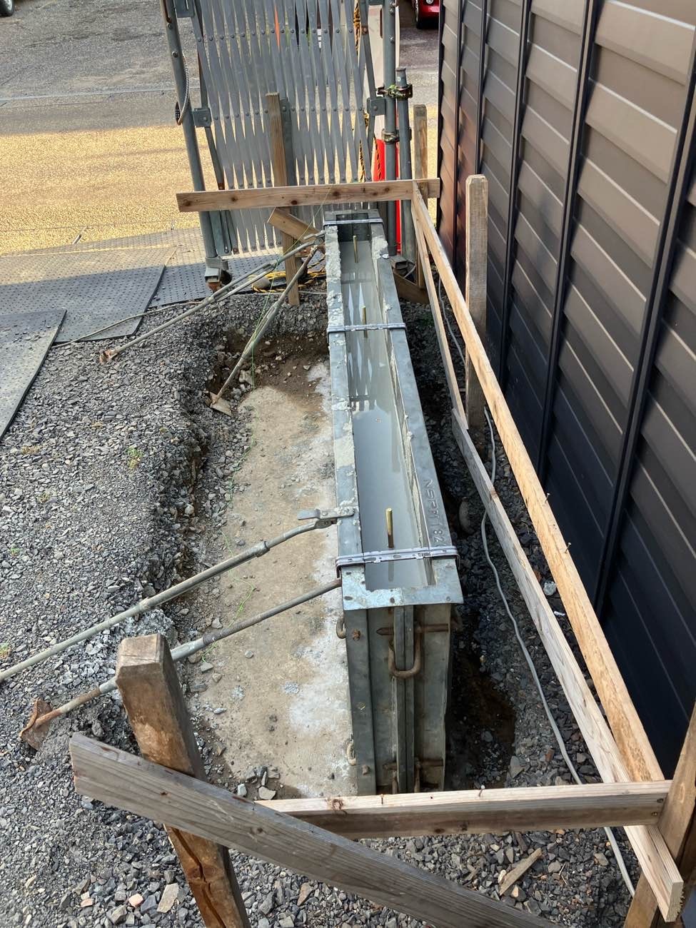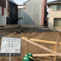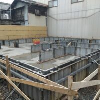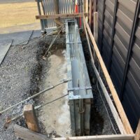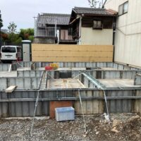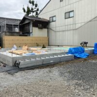 前面道路の景観を良くするため、今回は門も新築しています。基礎工事を行いました。外構工事が絡むので、基礎工事で一旦休工です。