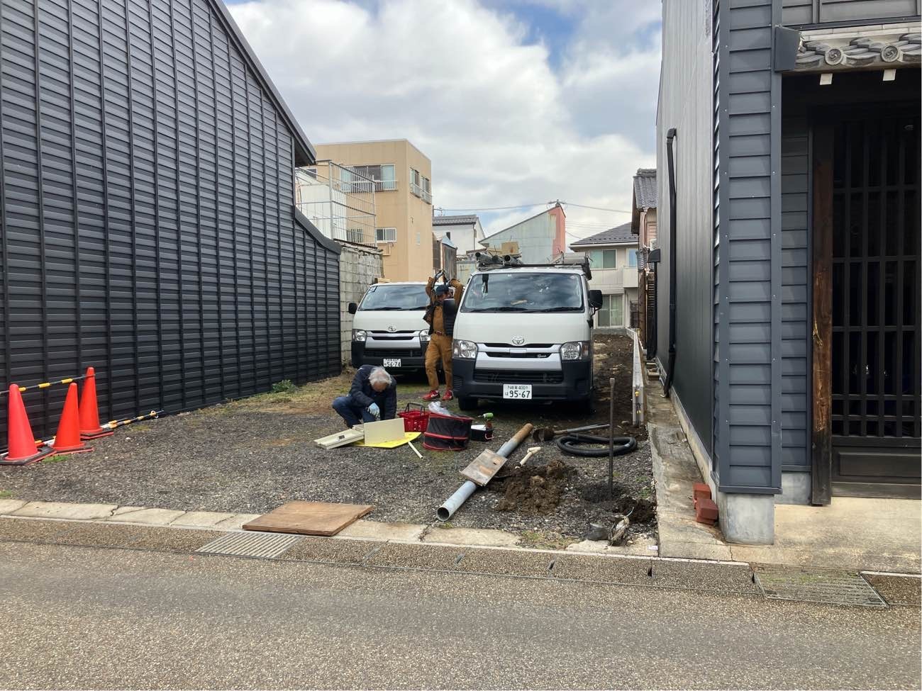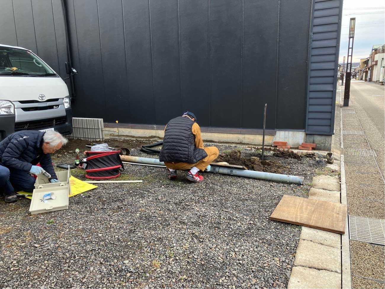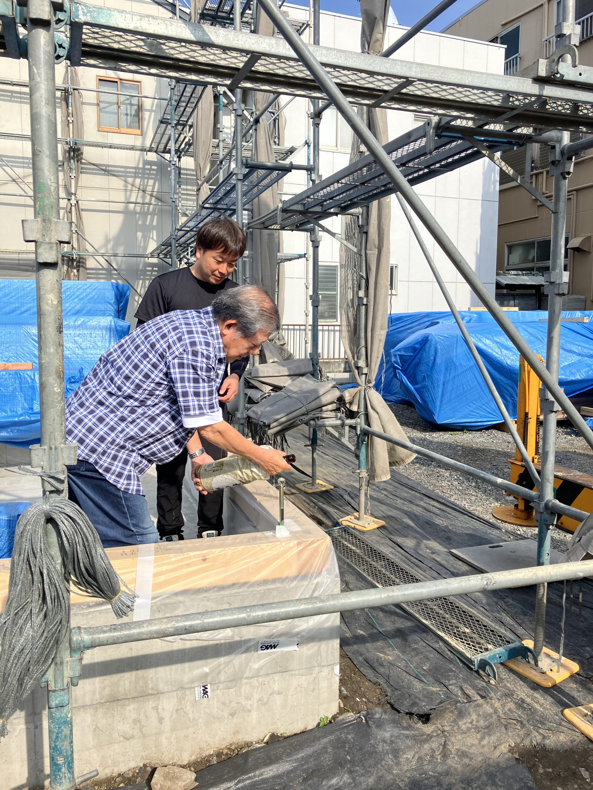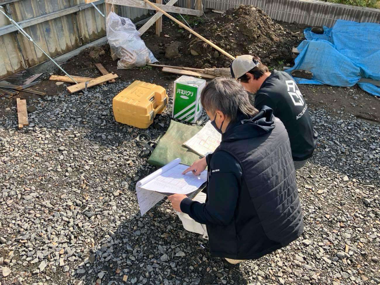 s水所長と基礎工事のtさんが打ち合わせをしている様子です。Jサービスのa野さんが給排水用の配管を設置し、写真にも納めてくれています👍