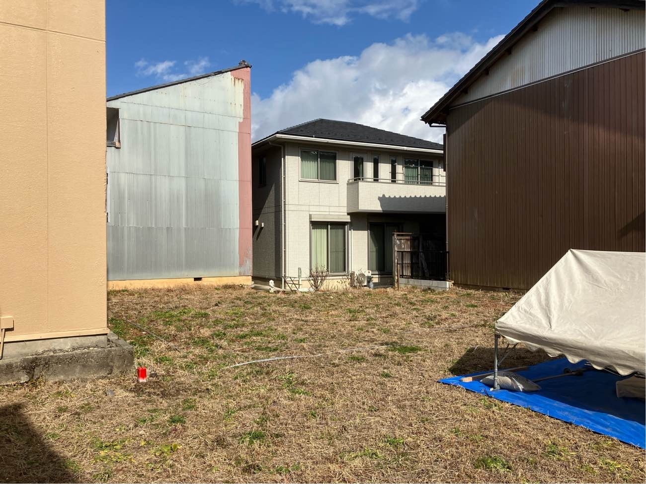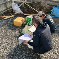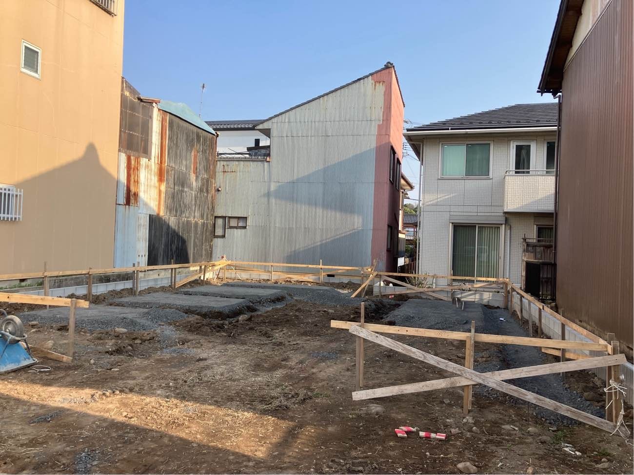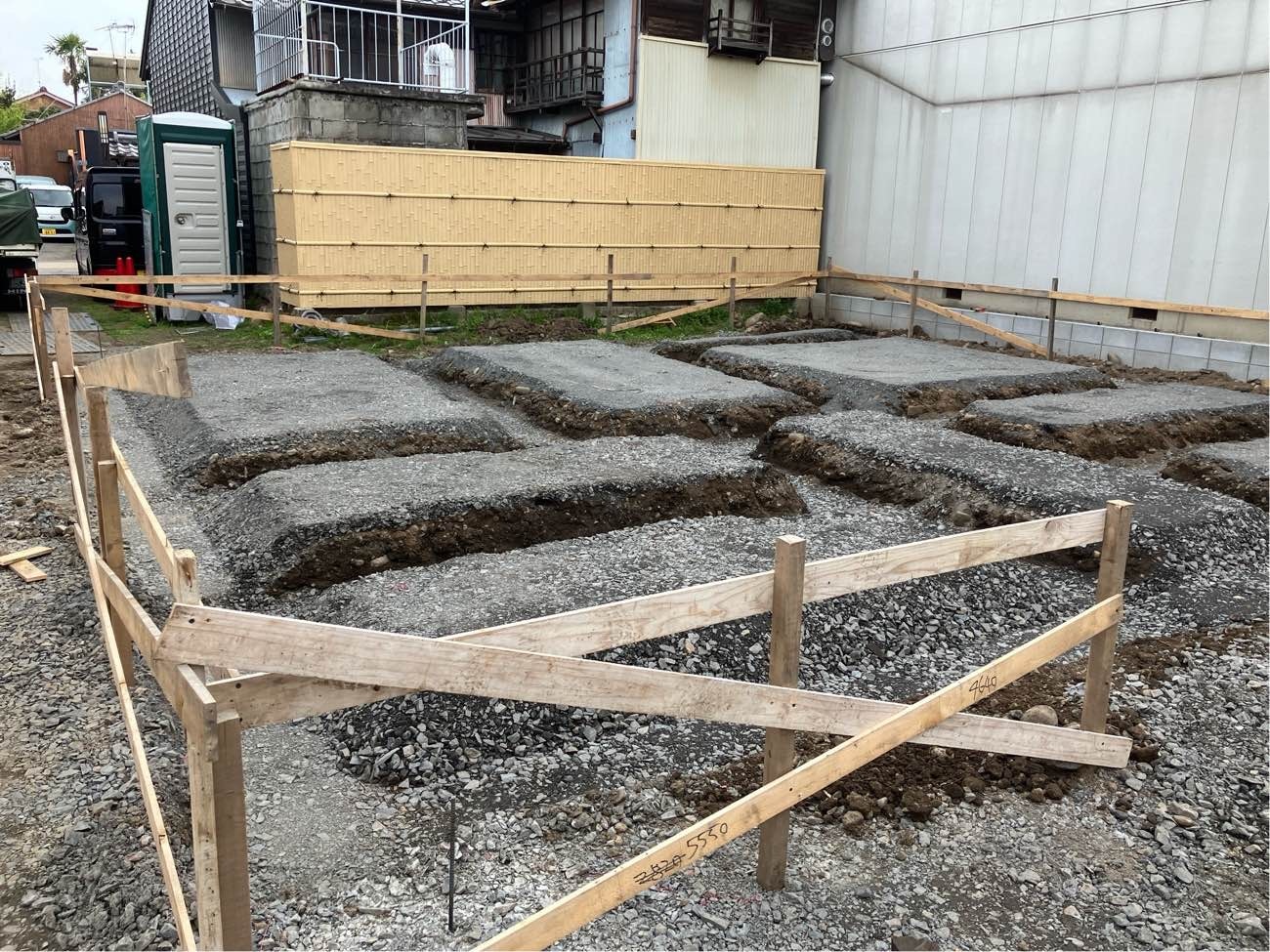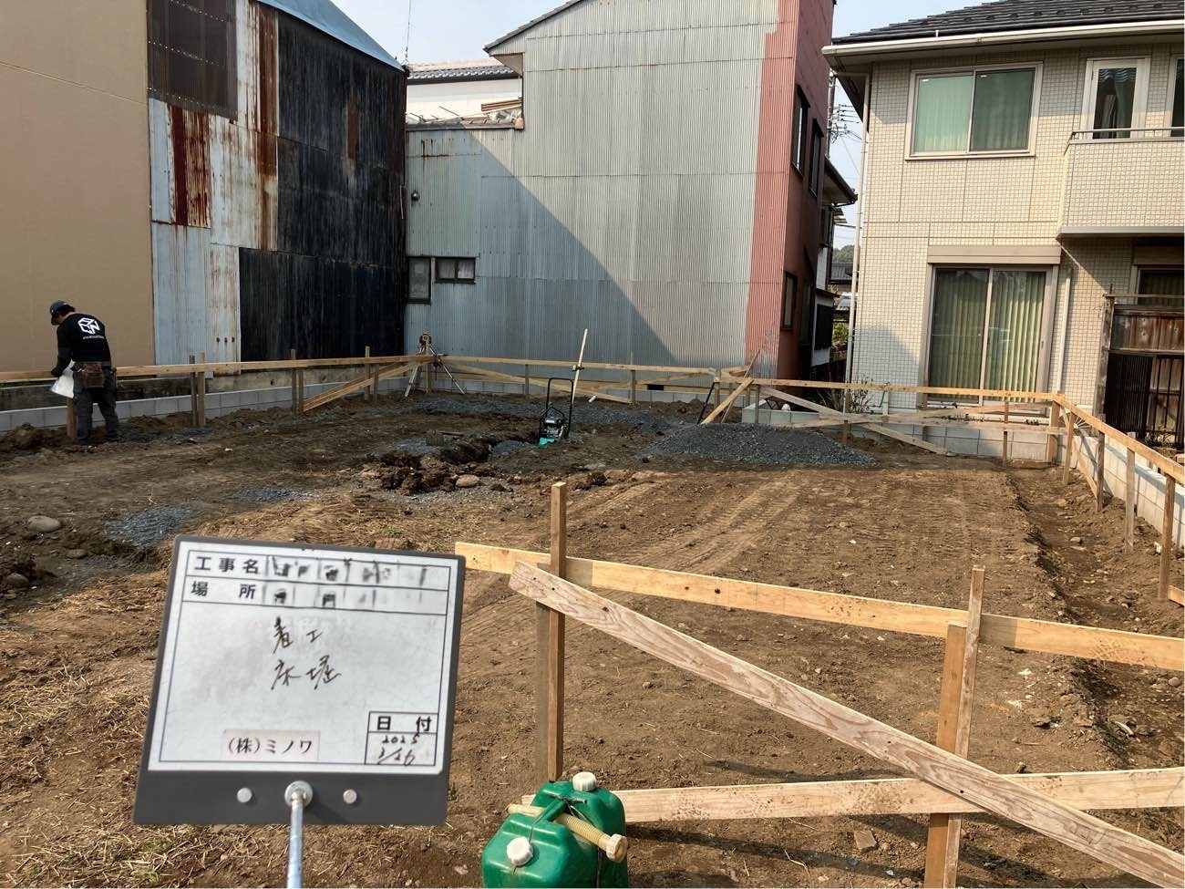 s水所長と基礎工事のtさんが打ち合わせをしている様子です。Jサービスのa野さんが給排水用の配管を設置し、写真にも納めてくれています👍