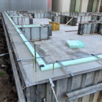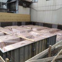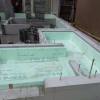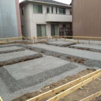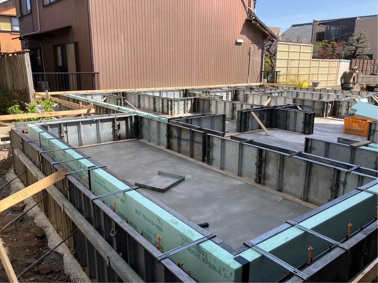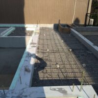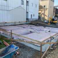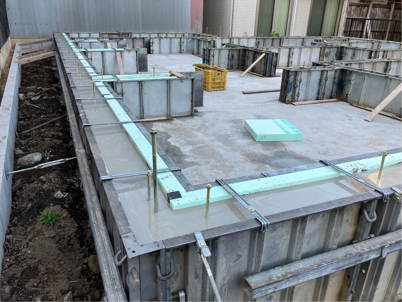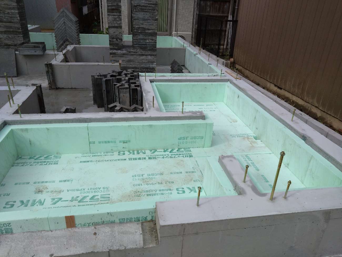 一昨日、基礎の立ち上がり部分のコンクリートを打設しました。内部の立ち上がり部分も外周部から約1m程、断熱材を設置します。