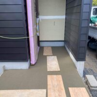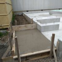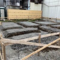 母屋は立ち上がりの型枠を脱型し、ポーチや玄関の土間を施工しています。春も冬に続き変な天気で、時折雷雨が降る時があるものの、基礎工事は順調に進んでいます。