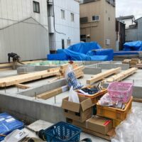 今日は、昨日のジメジメとした暑さが落ち着き、時折爽やかな風が吹く中、母屋の土台伏せが行われました。お昼過ぎに、お邪魔(本当に邪魔)しに行ったところ、もうはいこんな状況でした!びっくり。