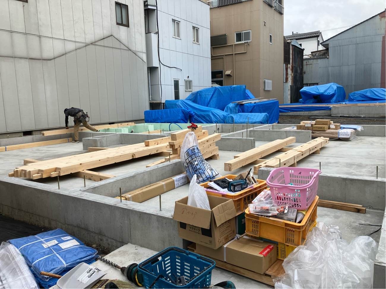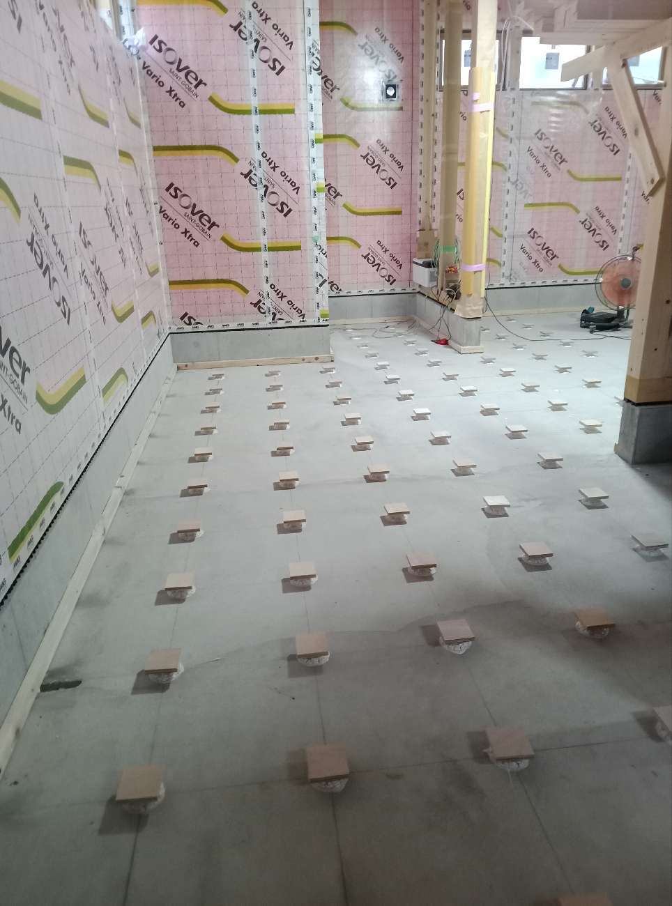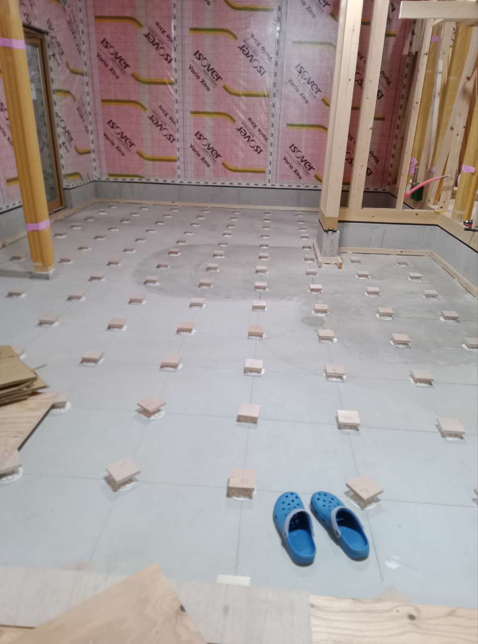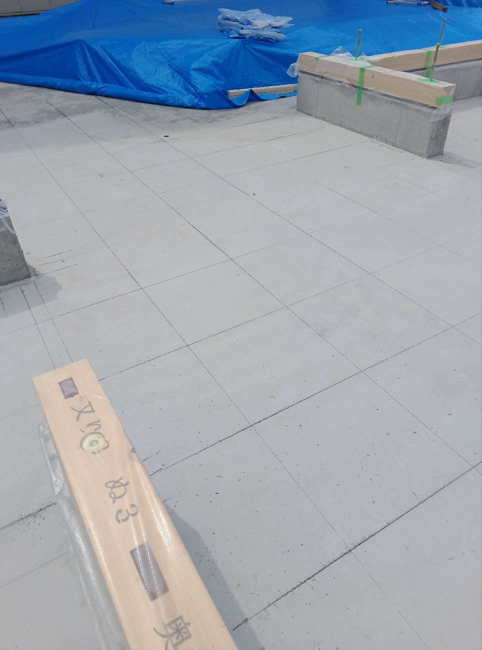昨日、k池大棟梁は、フリーフロアの支持脚を設置する為、早々に脚の割付を行われた様子です。今回は、GL(地盤面)から1階の床を高くしたくないとのご要望で、1回のフロアレベルを通常より40㎝下げましたので、オフィスなどで良く使われるフリーフロアと言う方式を採用しました。土台の上に合板を敷かないため、土台が雨に濡れない様にしっかり養生もされています👍