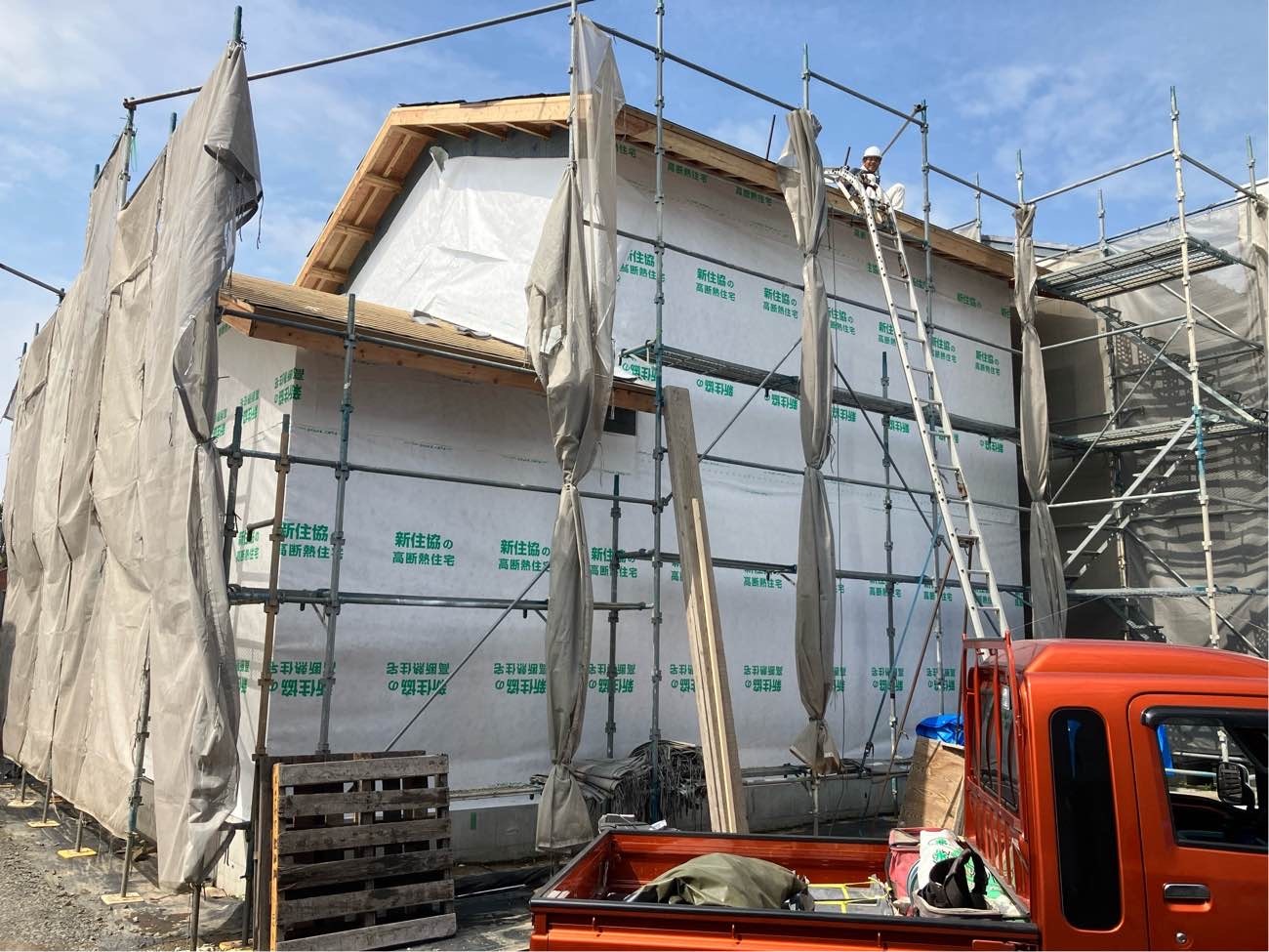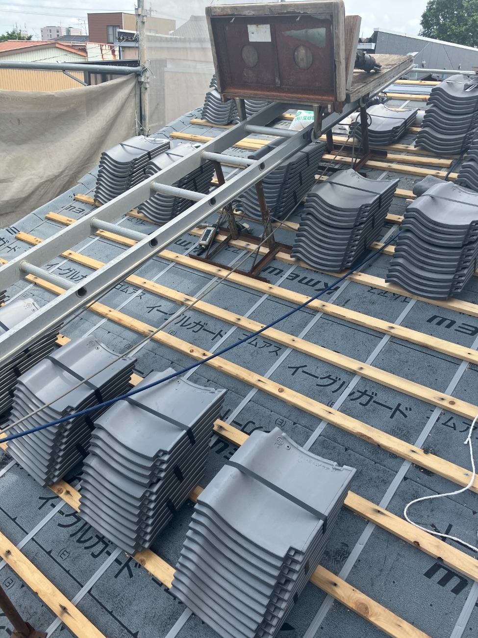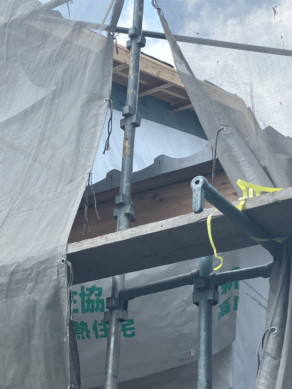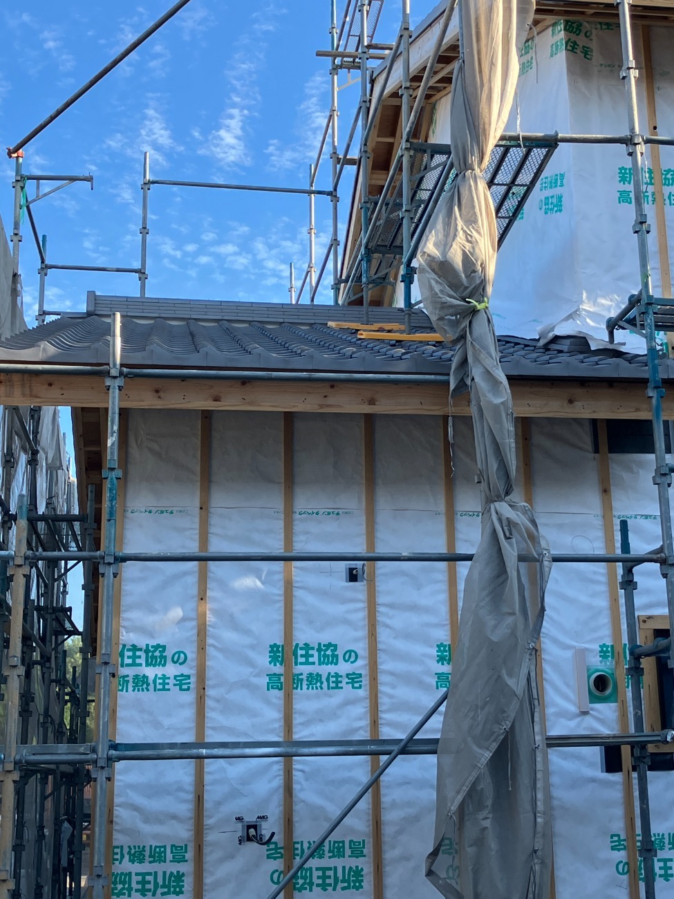 離れは、k嶋屋さんが体調を崩されてしまい、a瓦さんが急遽応援に駆けつけてくださって、瓦が葺き終わりました。光を遮るものがないので、瓦屋さんの仕事は大変です💦足場にタープみたいなものが架けられると少しは違うかも知れないですが、温暖化してしまった夏対策として、建築現場は朝5時からお昼までとかサマータイム制度にしたらどうでしょうか?音の問題があるので、国が推奨くれたりしたら、近隣の方も「あ~政府が言ってたよね、ニュースで見た!仕方ないね」となったりしないかなぁと思ったりします。