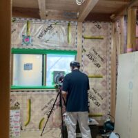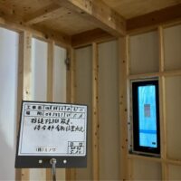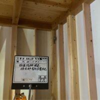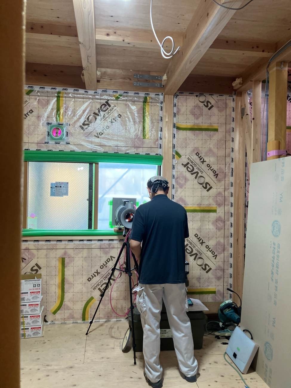 母屋と離れの気密測定を行いました。今回は断熱・気密にこだわられてはみえませんが、どんな性能のお宅でも気密測定を行います。今までは、完成時に測定をしていましたが、中間時に測定する事に戻しました。中間時で測定する方が良い数値が出るので、数字としては完成時の方が本来は正確な気がしますが、中間時で測定すると気密が弱いところを補修する事ができ、他社さんとの比較の際にもほとんどの会社が中間時なので変更する事にしました。