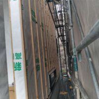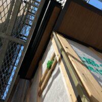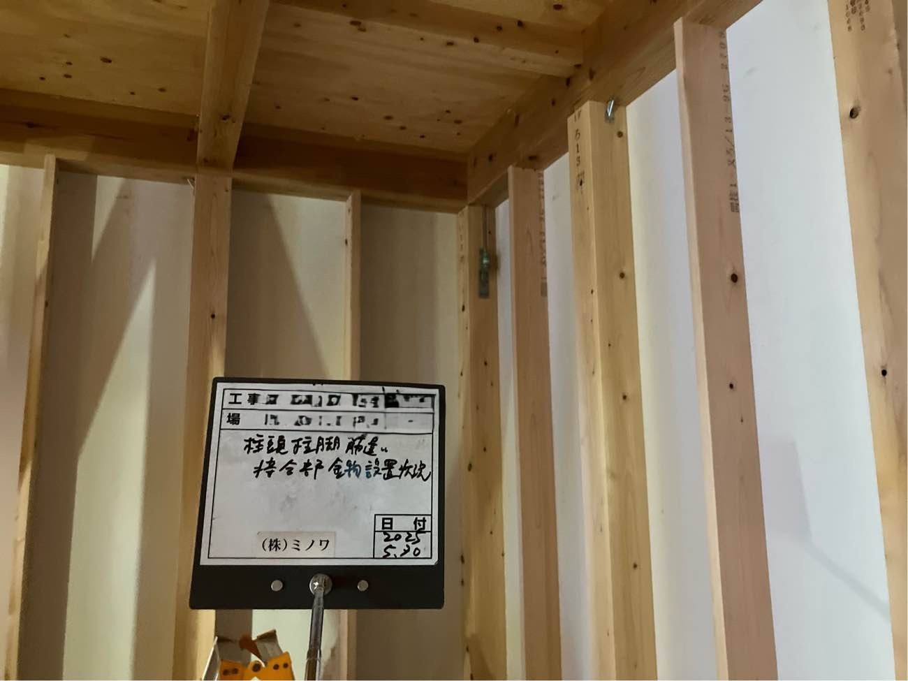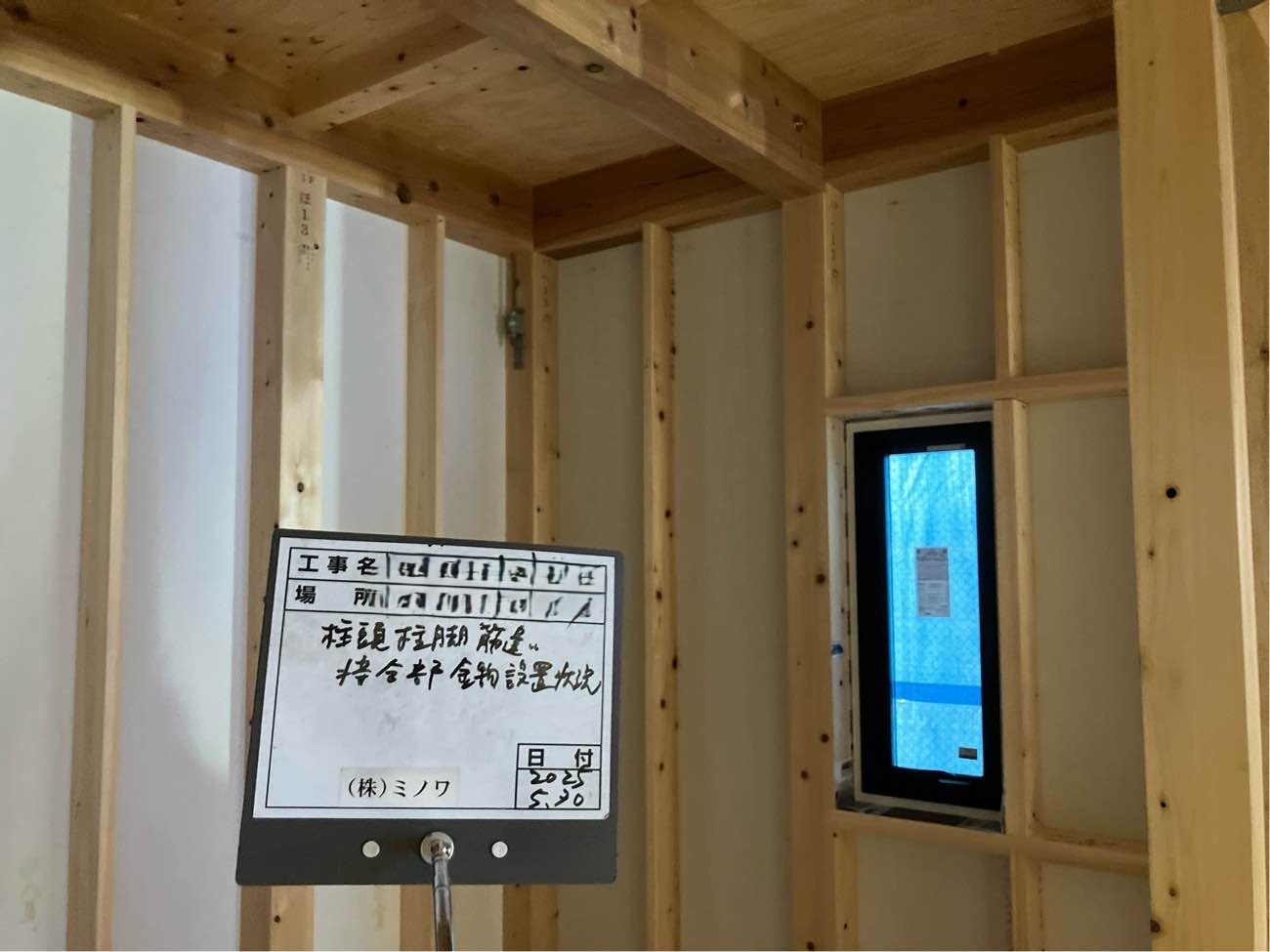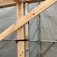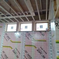 構造計算に基づいて、耐力面材は決められた釘のピッチで留め付け、柱頭柱脚の金物も取り付けられました。今回は、残念ながら付加断熱は採用されなかったので、早々とサッシが取り付けられている様子です。sサッシのs君、最近ちょっと元気な様子👍よかった!