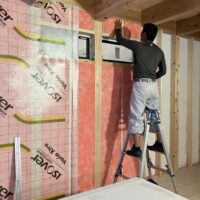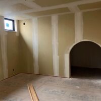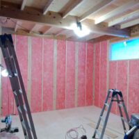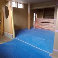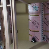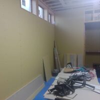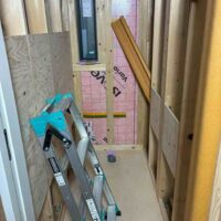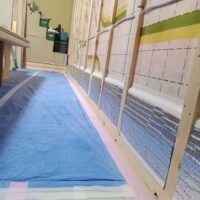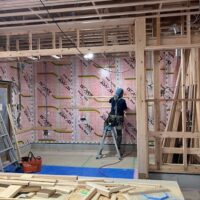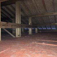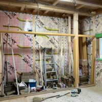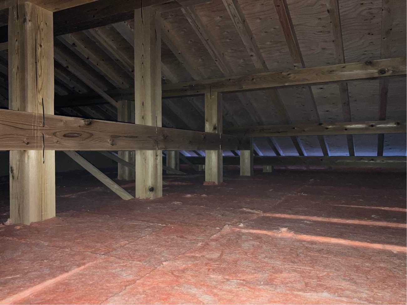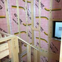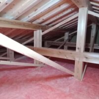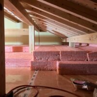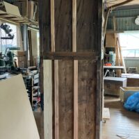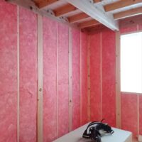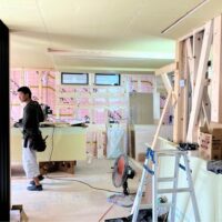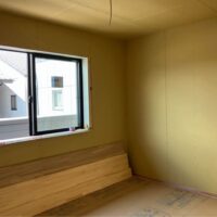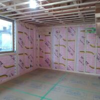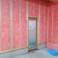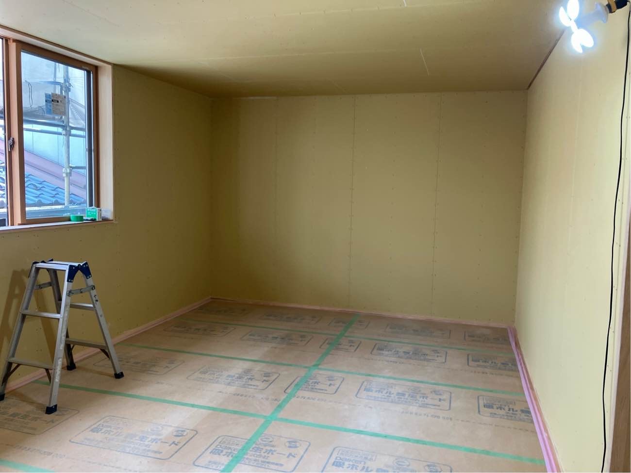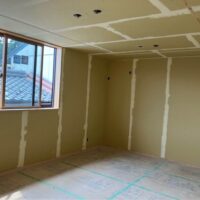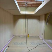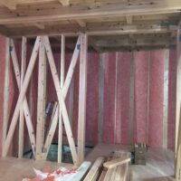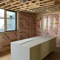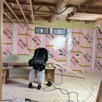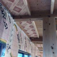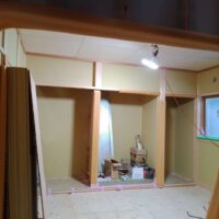 母屋も離れ同様に、屋根の断熱補強が行われ、2階の床にはプラスターボードが張られています。開口部下地も建具の大きさに合わせて組まれてきています。2階の床にプラスターボードを張ると、一定の物音が下階へ響きにくくなる効果があります。
