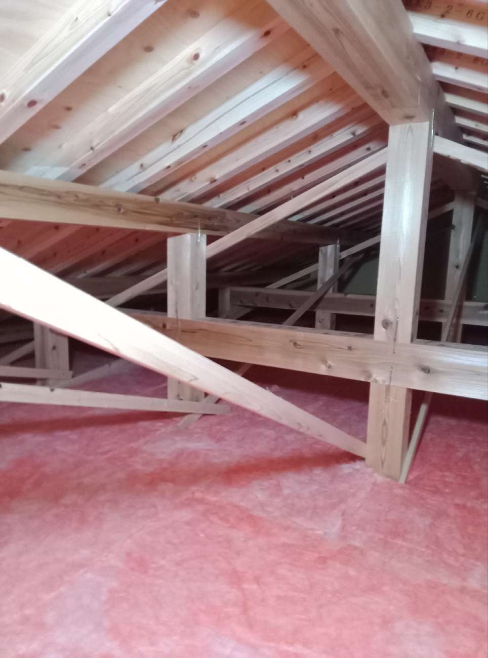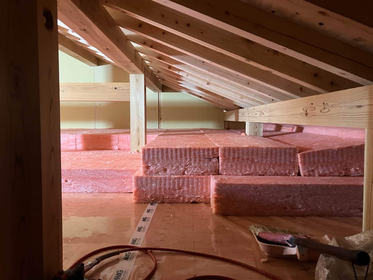 ミノワでは、小屋裏の断熱材は桁上断熱と言われるやり方を行う事が多いです。屋根断熱と天井断熱の間を取った感じです。今は火打ち梁の代わりに梁の上に合板を敷きますので、その丈夫な合板の上に気密シートを敷き、断熱材を敷いていきます。天井断熱に似ていますが、しっかりとした合板の上に敷くので施工性が良く、きれいにしっかりと断熱を敷き詰める事ができます👍