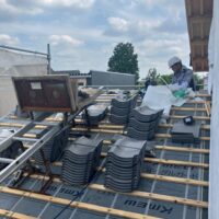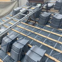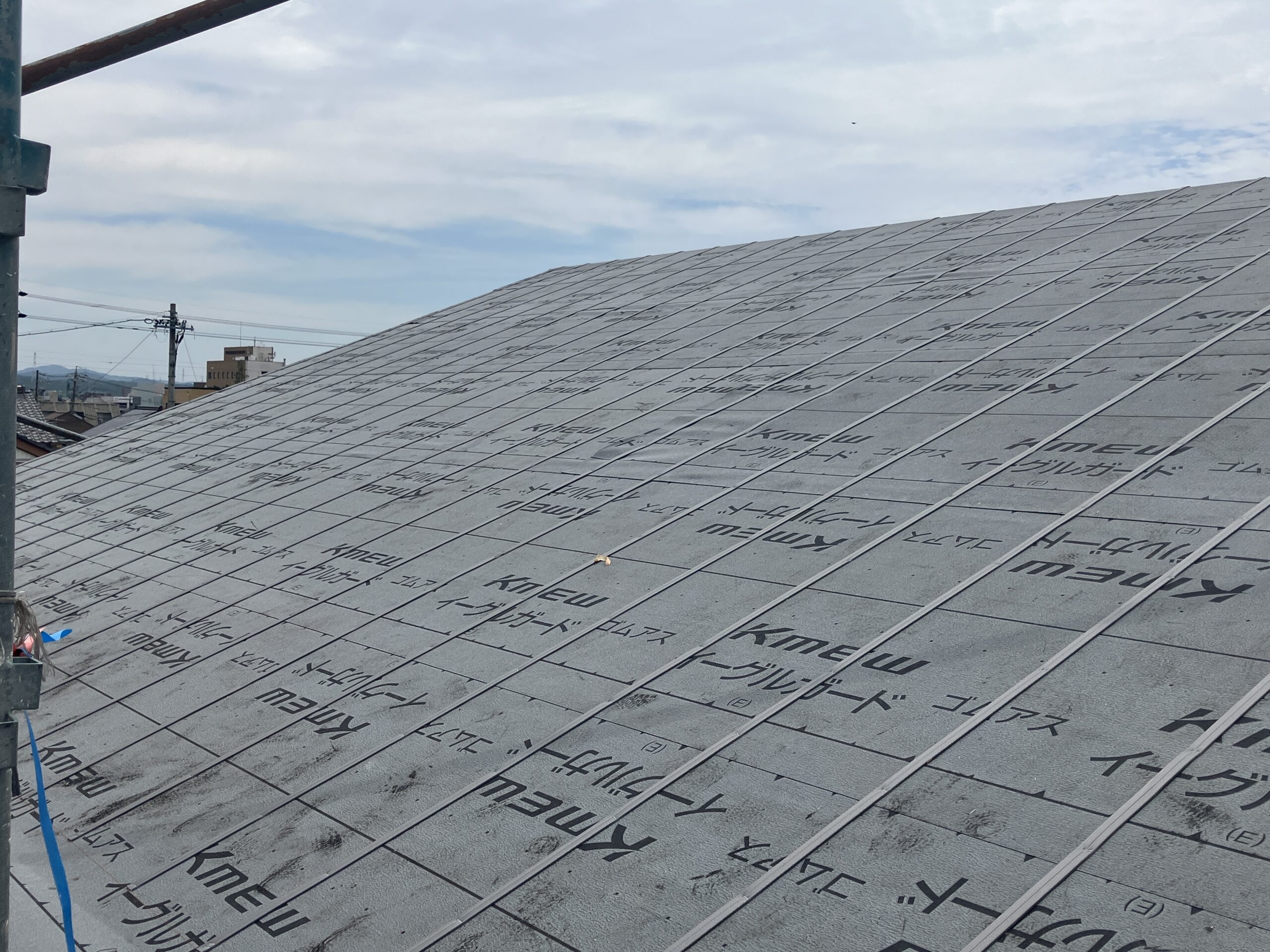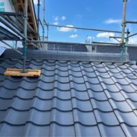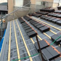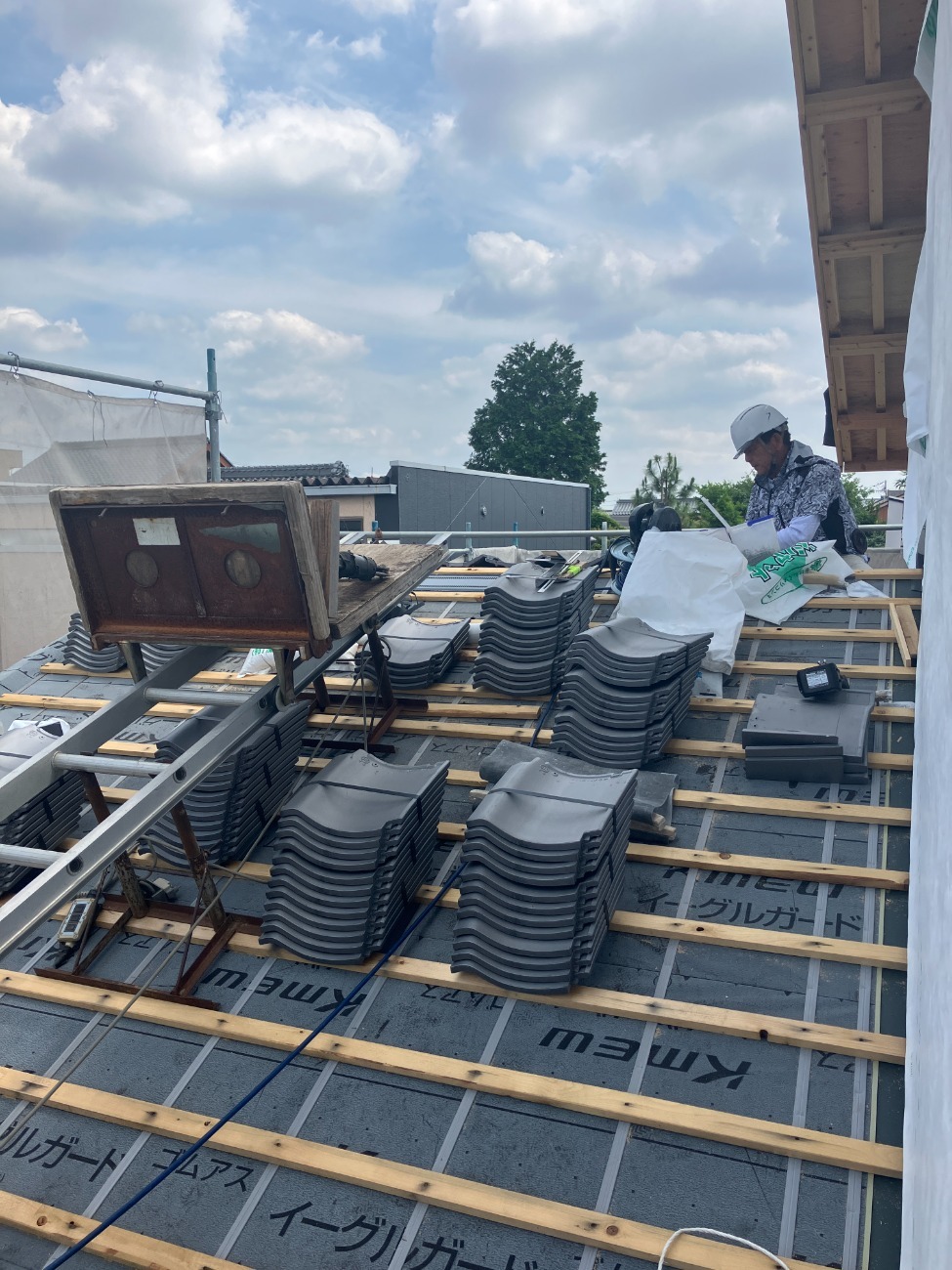 屋根の下では、h典棟梁が断熱材を敷設しています。屋根の上では、k嶋屋さんが瓦を葺き始めました。今日は暑かっただろうなぁ~お疲れ様です。