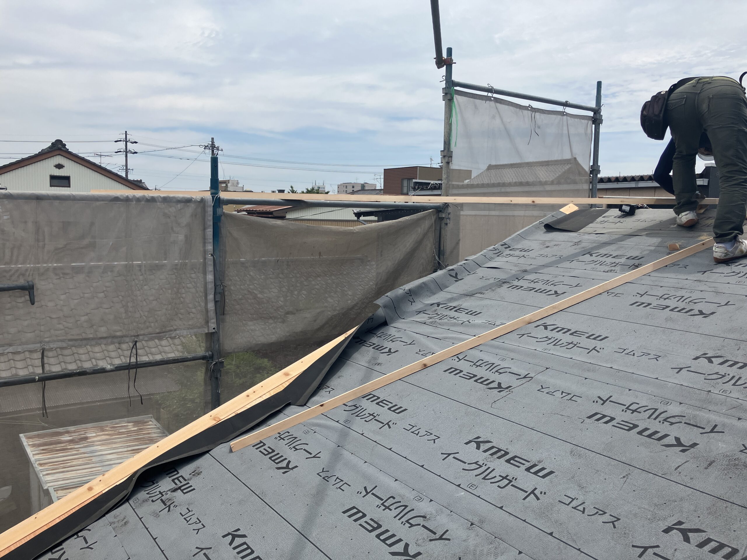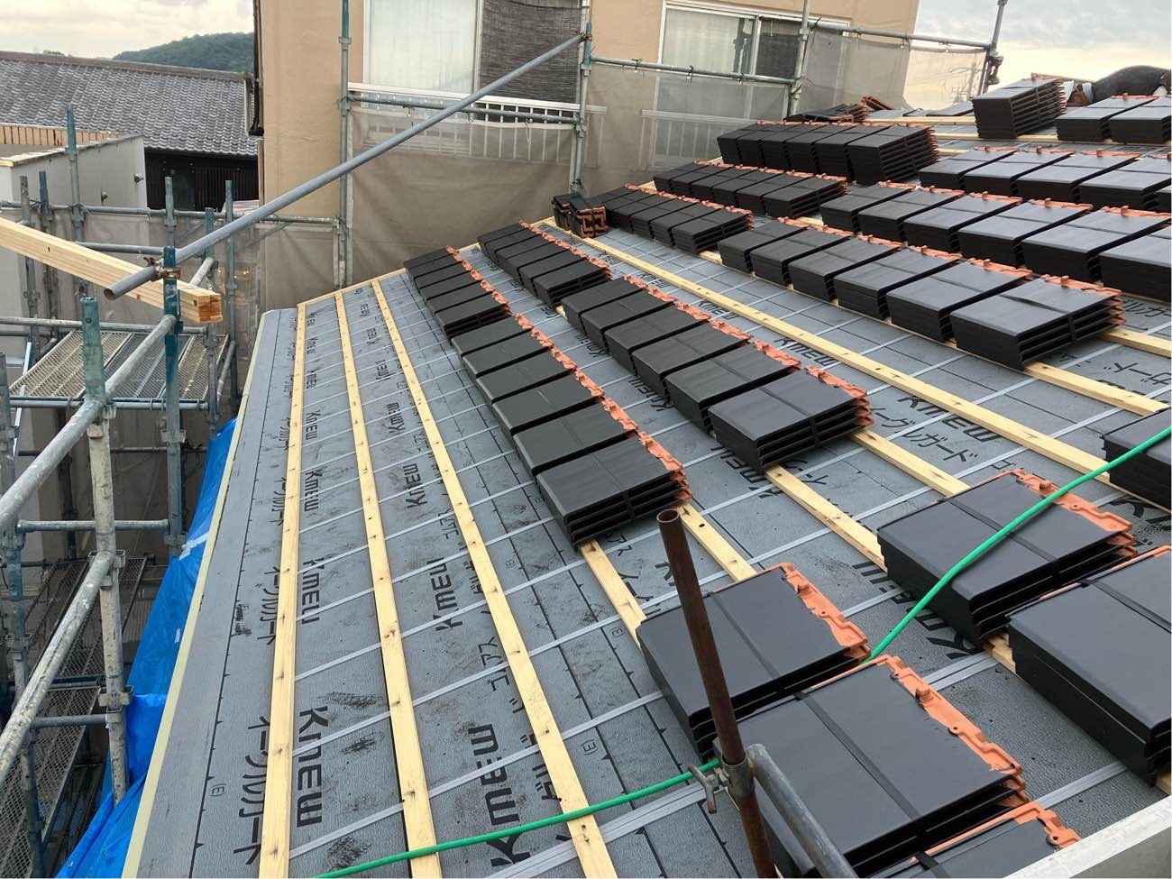 母屋の平板瓦は葺き終わり、k嶋屋さんは離れの工事に入りました。母屋の瓦は、フラットタイプの平板瓦。すっきりとした印象で、最近人気の瓦の形です。離れは、瓦にこだわって、一文字いぶし瓦です。経年変化を楽しめる瓦で、色むらが出てくるのがいいです👍