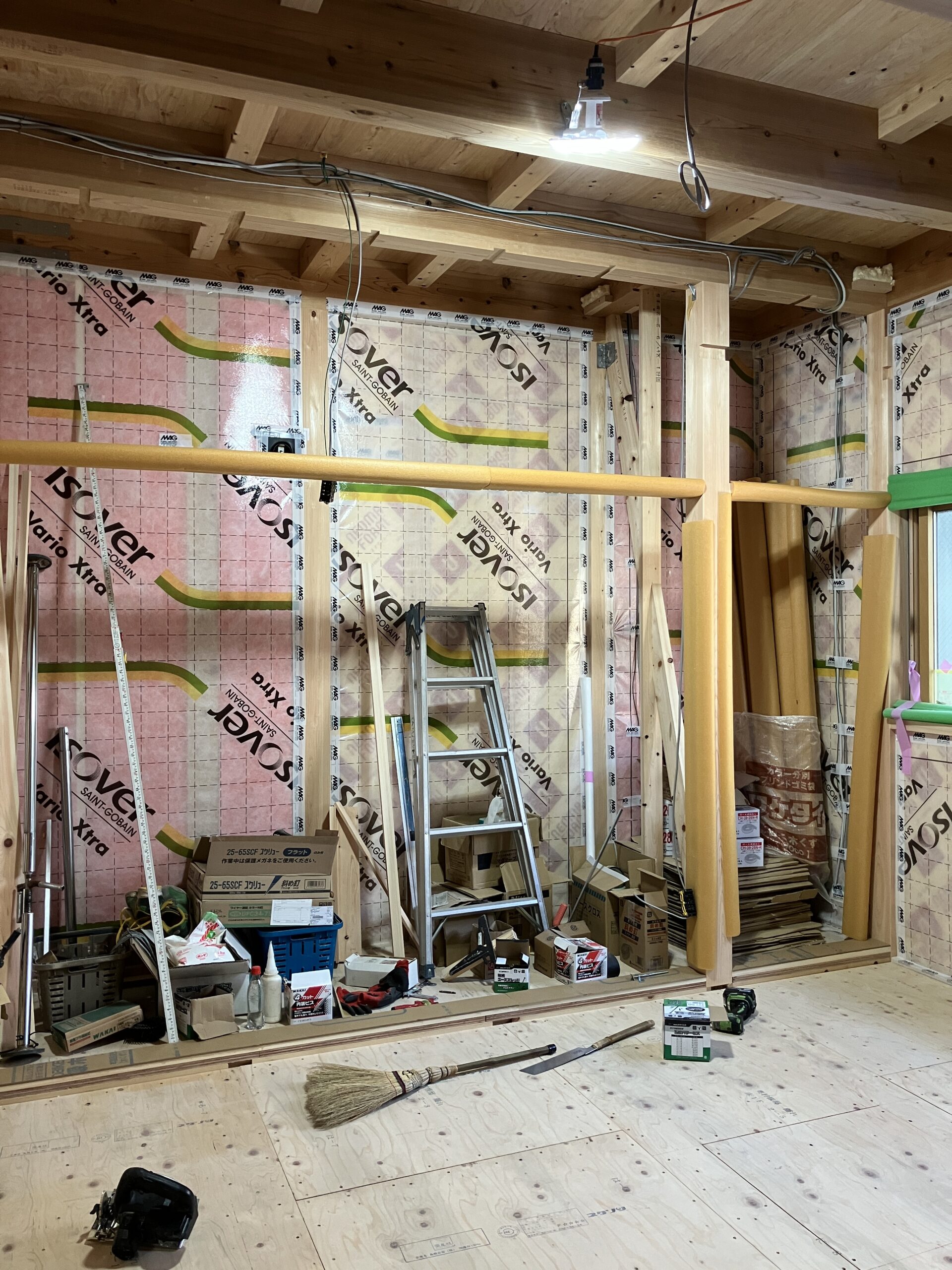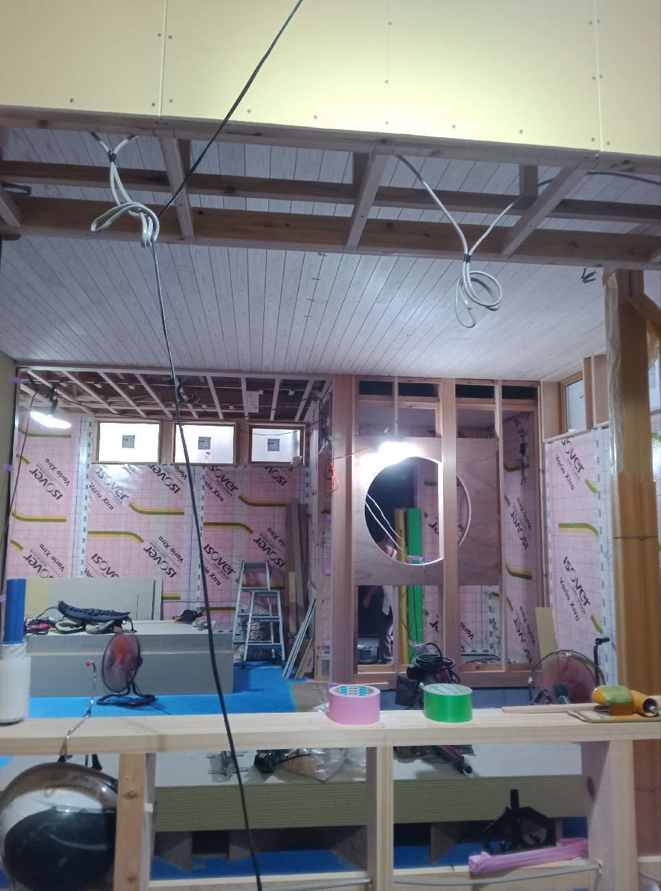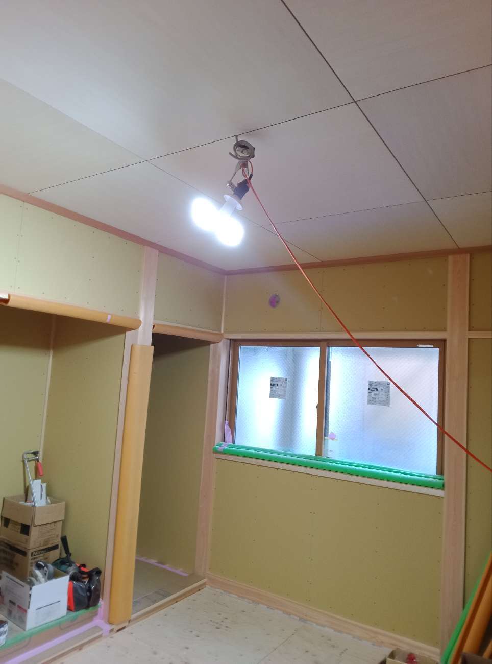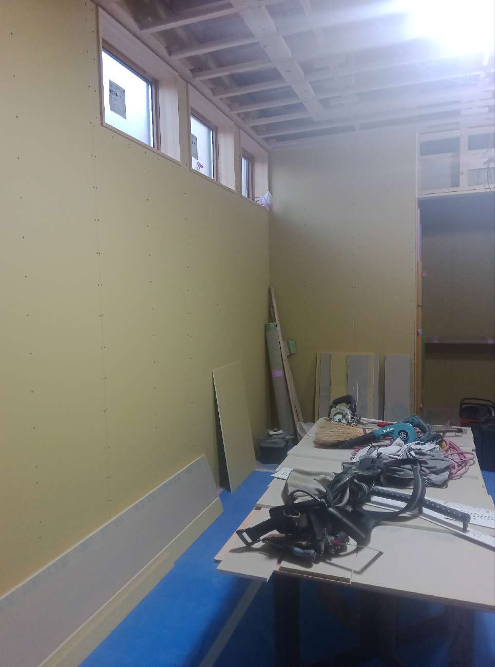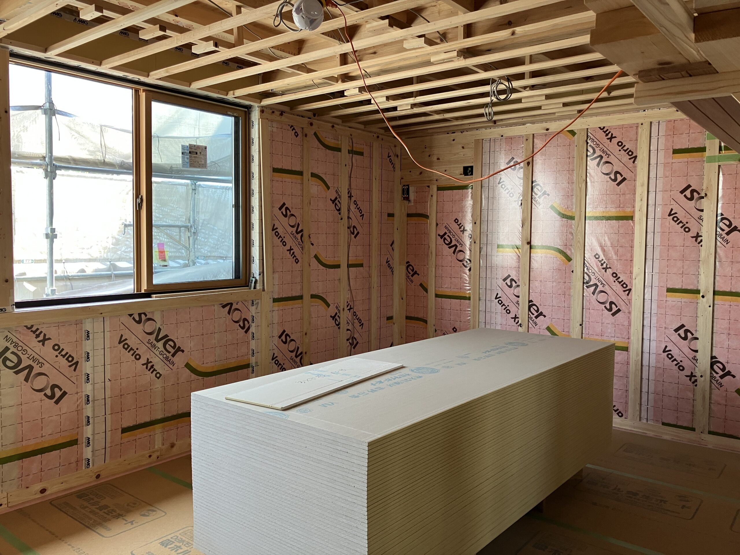 離れは、プラスターボードが張り進められています。木工事(大工工事)もゴールが目の前に見えてきた感じです。