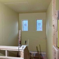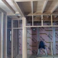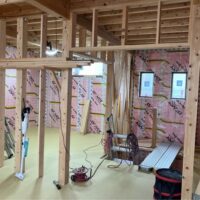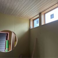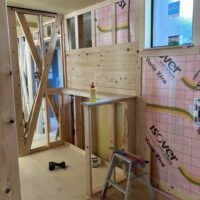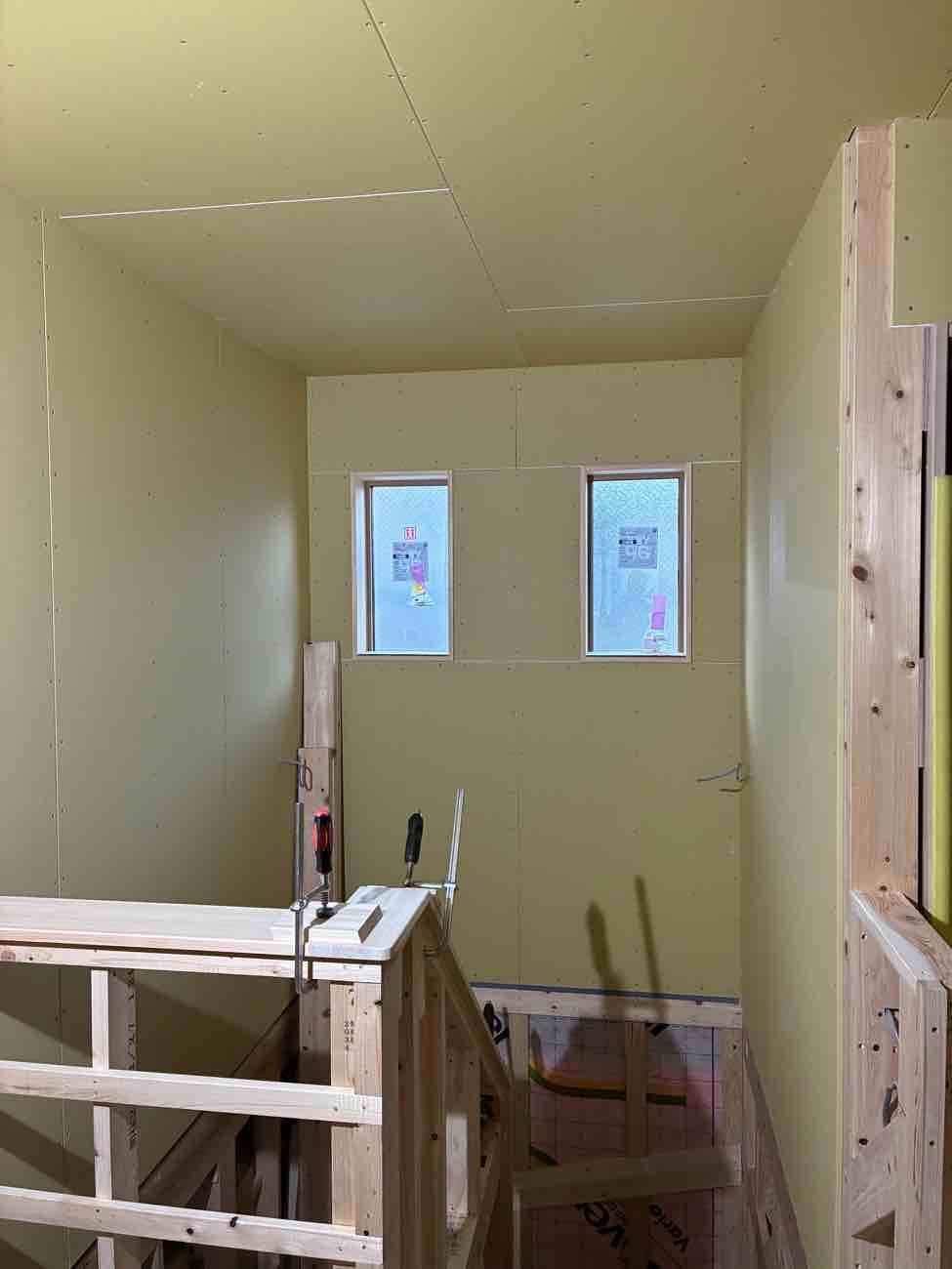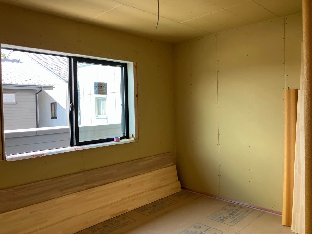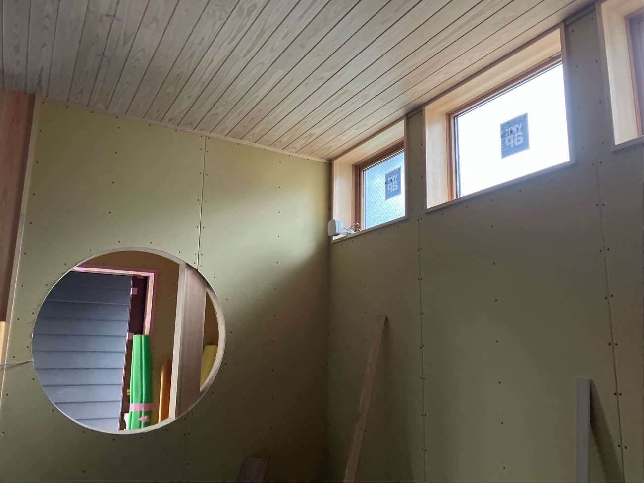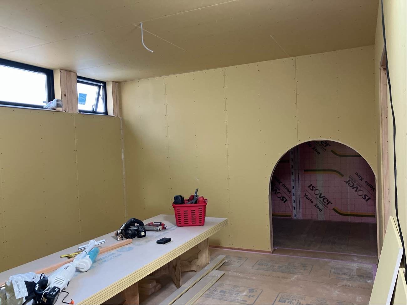離れは、プラスターボードが張り進められています。木工事(大工工事)もゴールが目の前に見えてきた感じです。