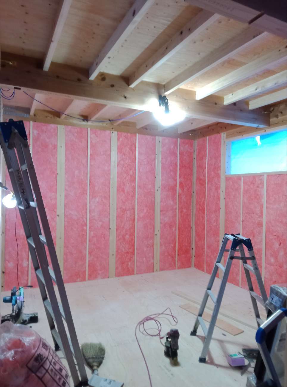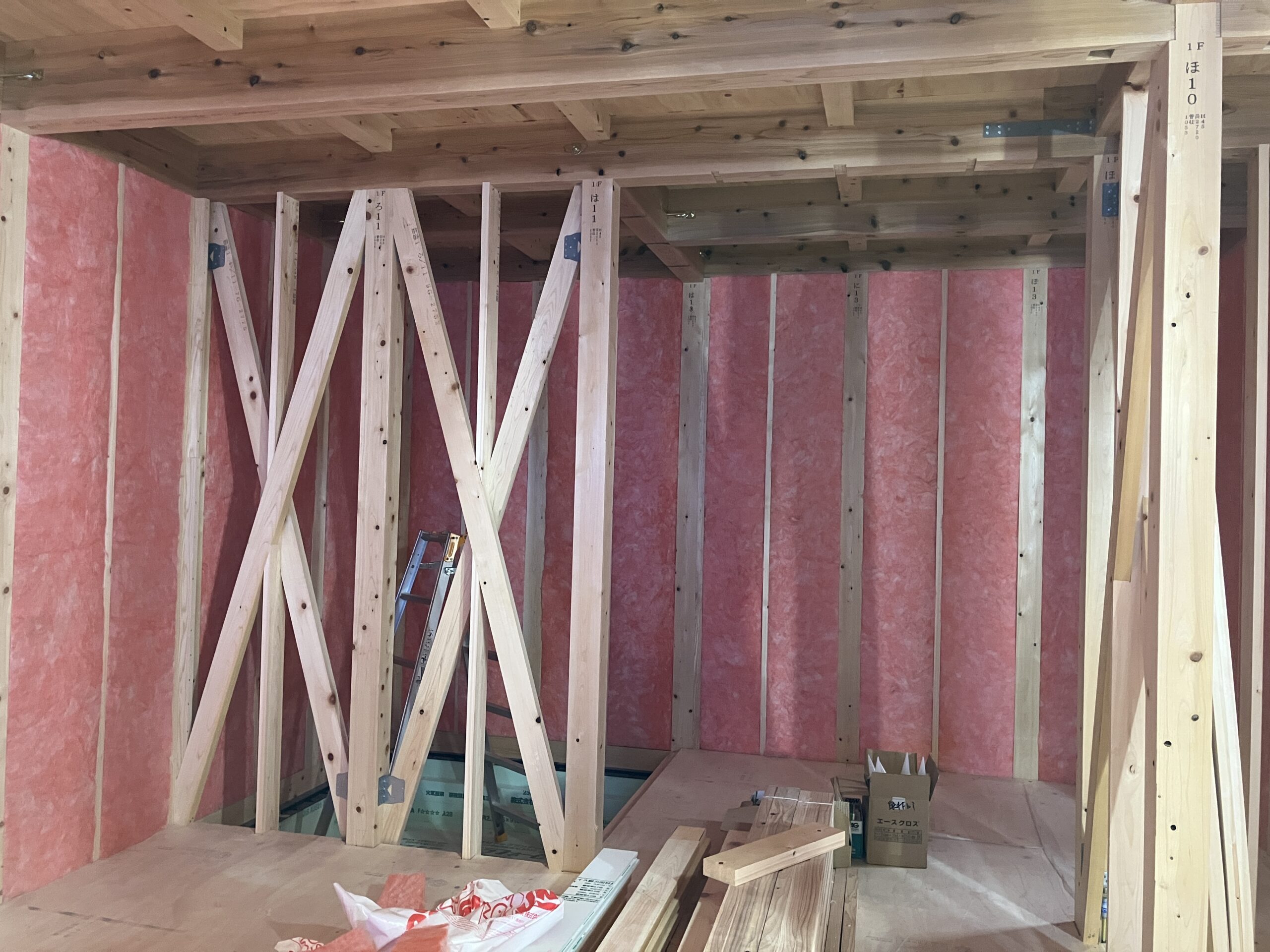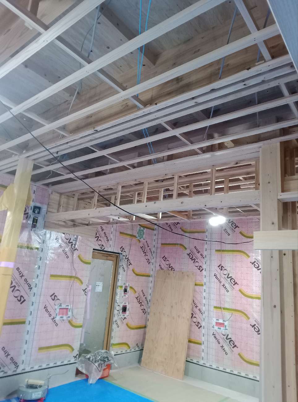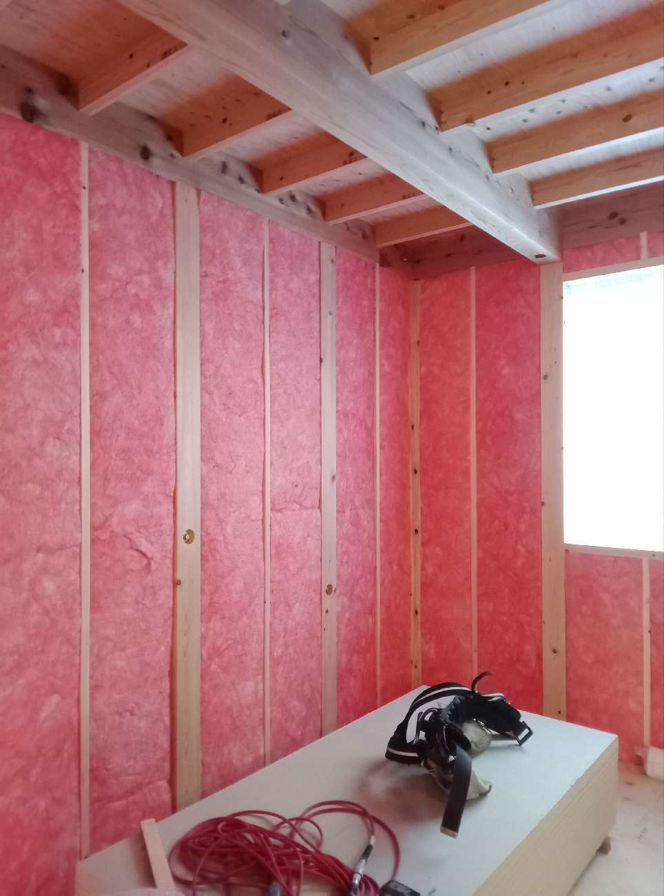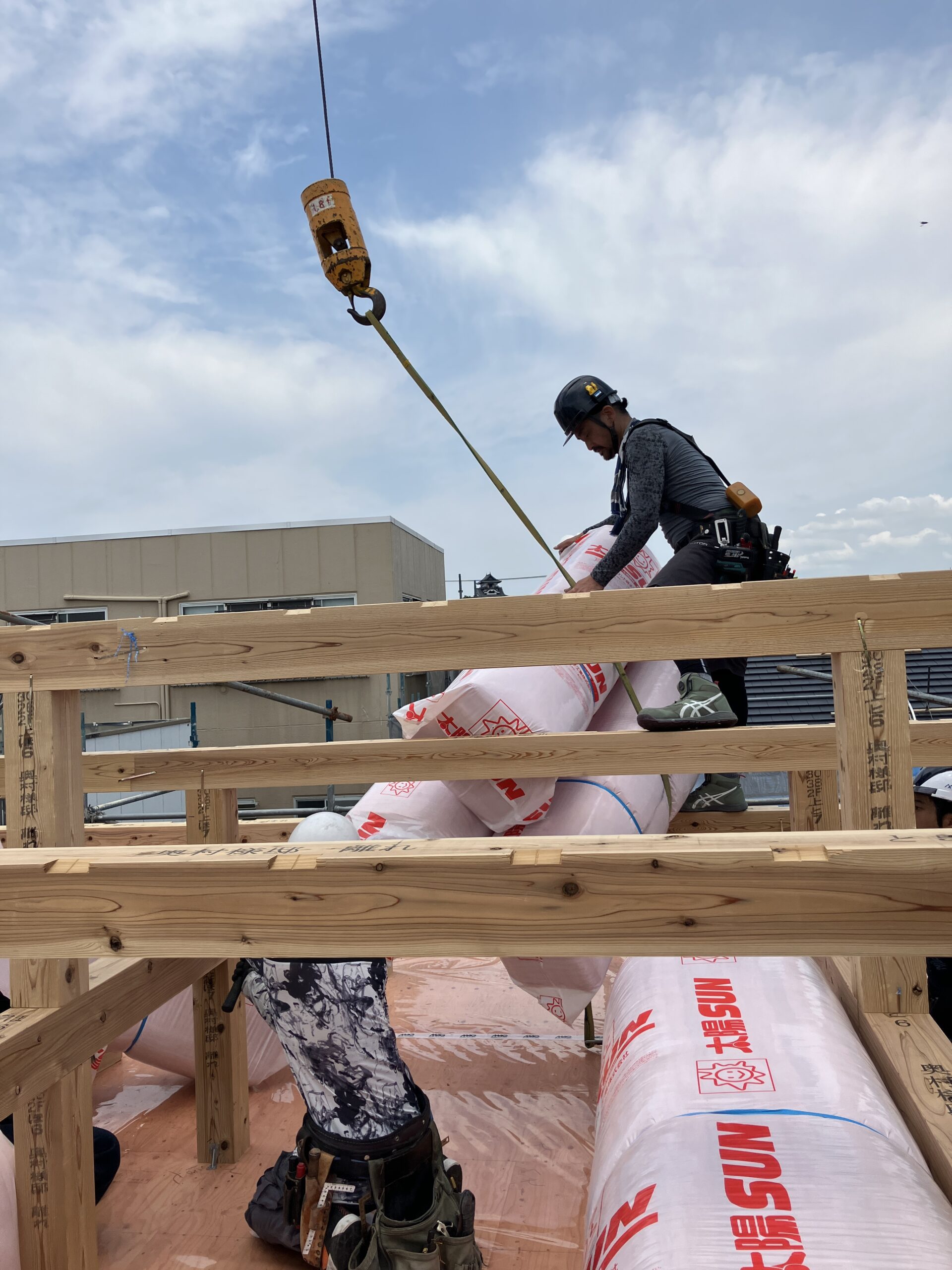 内部では、断熱材の施工が進んでいます。桁上断熱の敷設、壁の充填断熱の様子です。桁上断熱は高性能グラスウール155㎜を2枚、壁は柱と間柱間に120㎜です。(📸:k池大棟梁)きれいに入っています👍そして、写真も矩が出ていて美しい~ありがとうございます!