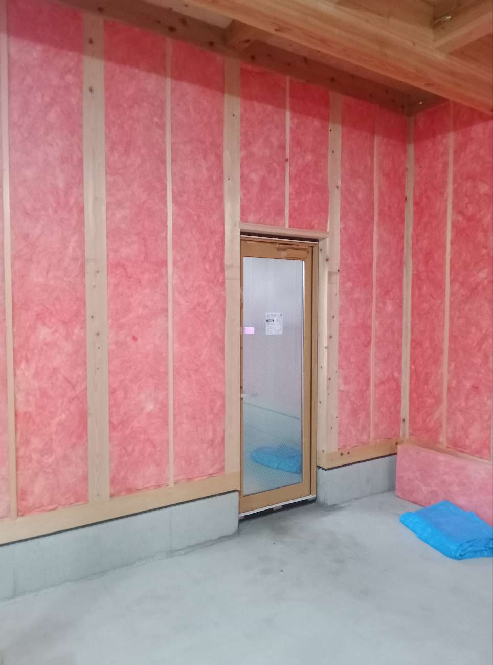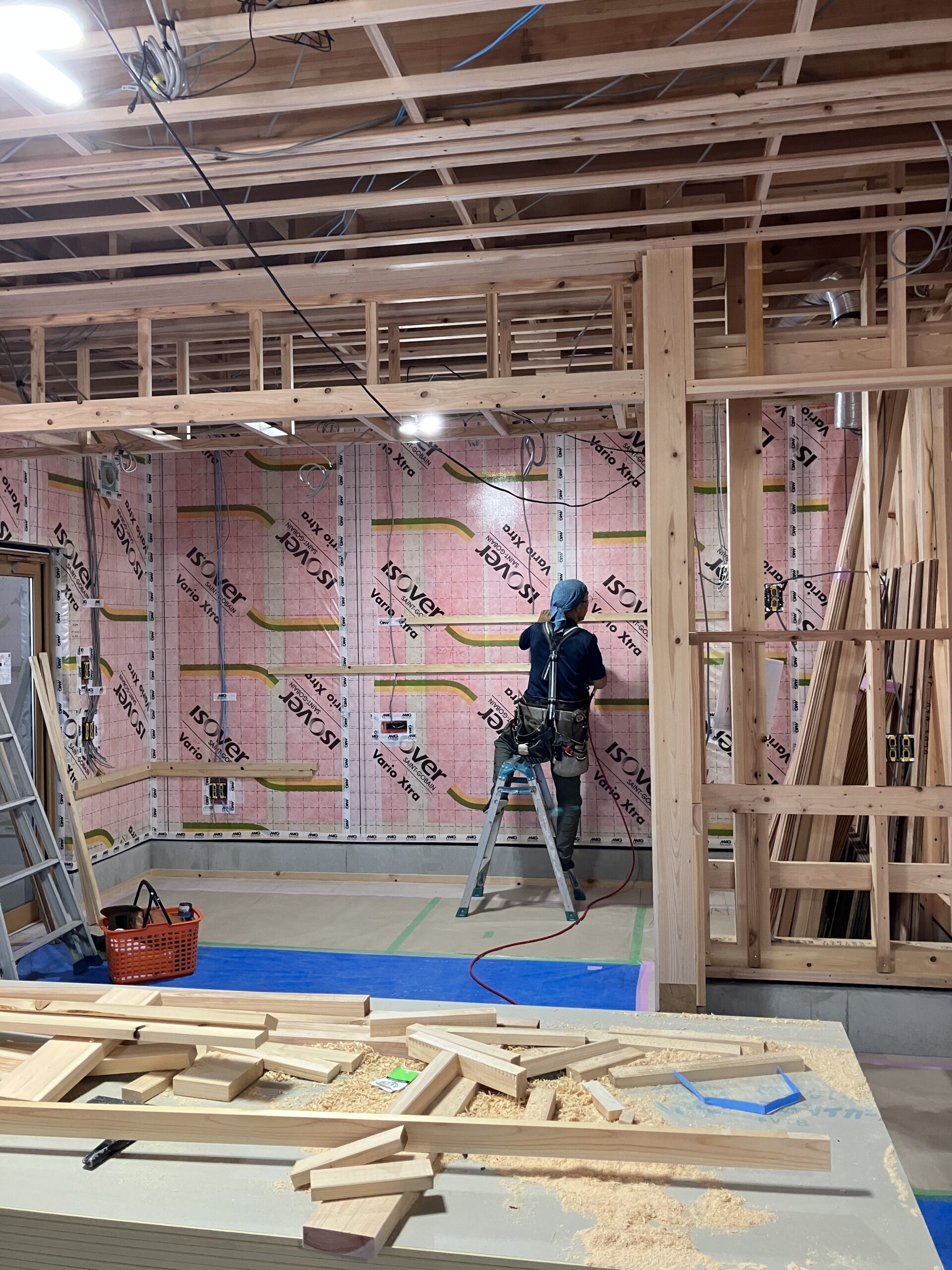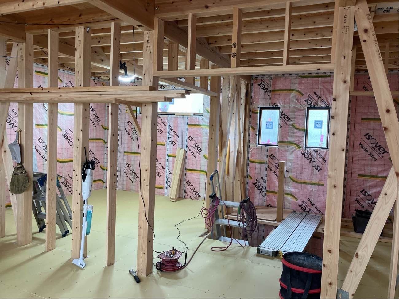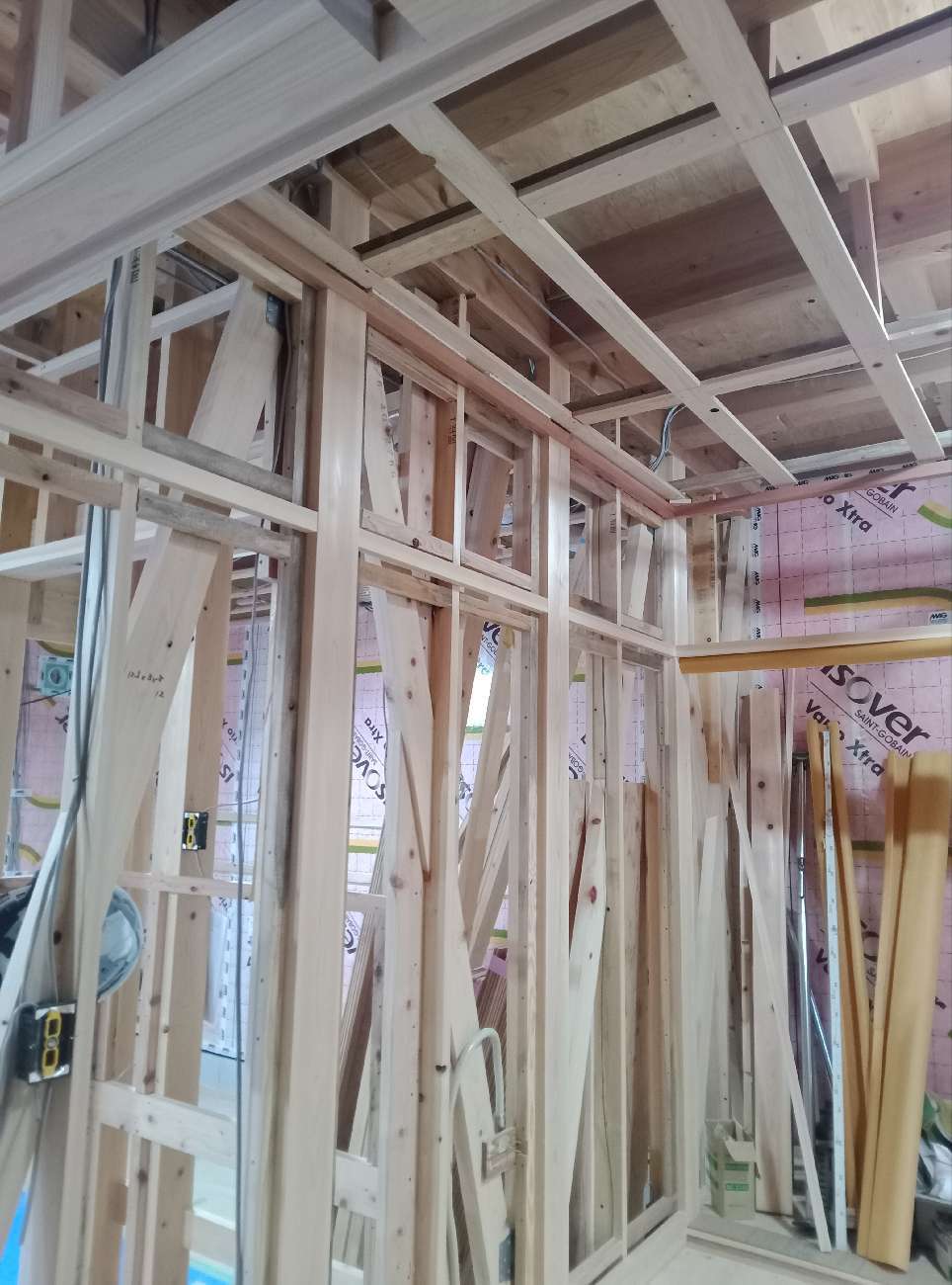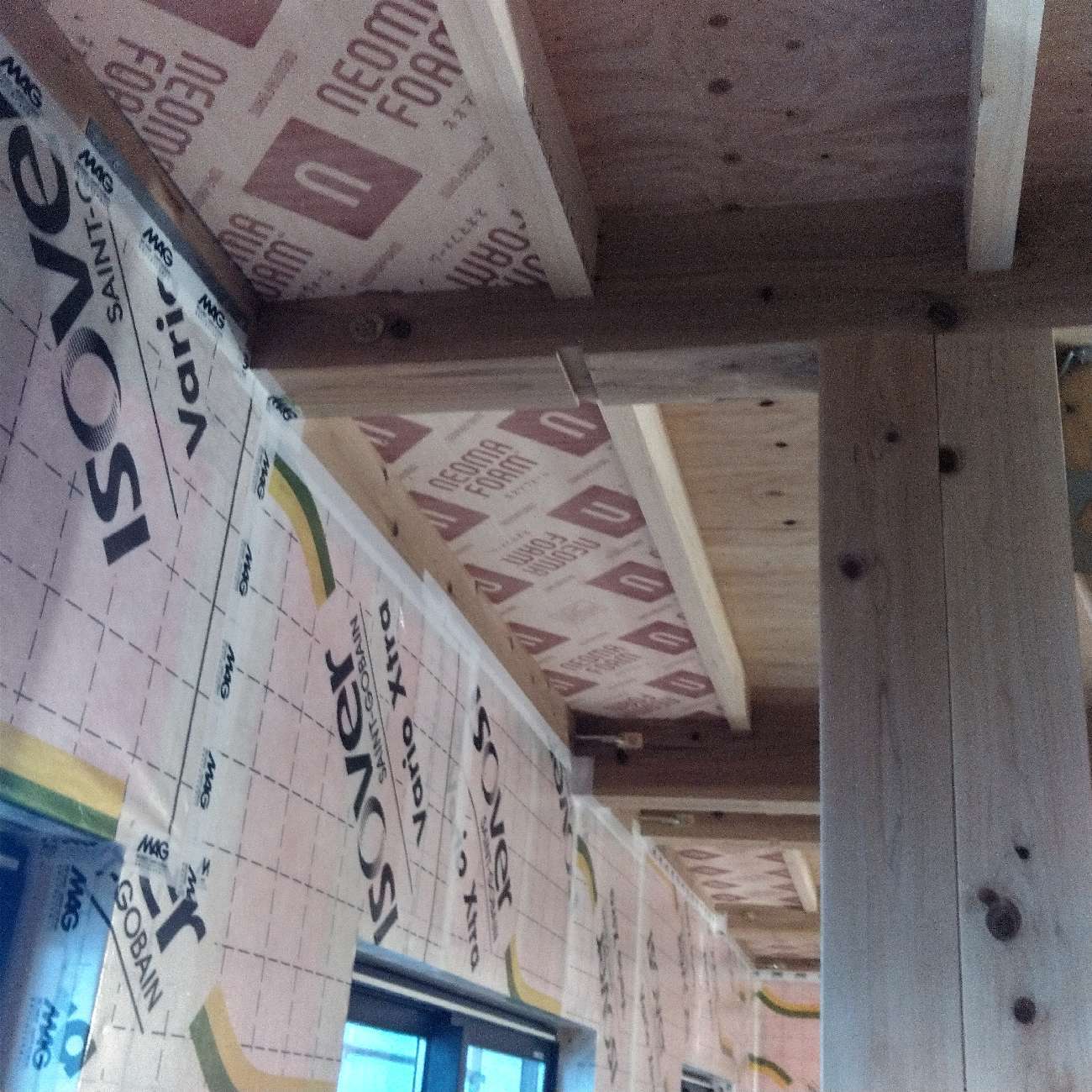 内部では、断熱材の施工が進んでいます。桁上断熱の敷設、壁の充填断熱の様子です。桁上断熱は高性能グラスウール155㎜を2枚、壁は柱と間柱間に120㎜です。(📸:k池大棟梁)きれいに入っています👍そして、写真も矩が出ていて美しい~ありがとうございます!