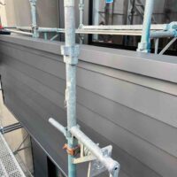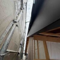 母屋も、軒裏の通気金物と軒下地が取り付けられ、外壁には通気胴縁兼用の外壁下地が取り付けられました。外壁の仕上げ材や張り方によって、下地の入れ方が変わってきます。今回は、母屋も離れもほとんどがガルバリウム鋼板の横張りのため、下地が縦方向に入っています。