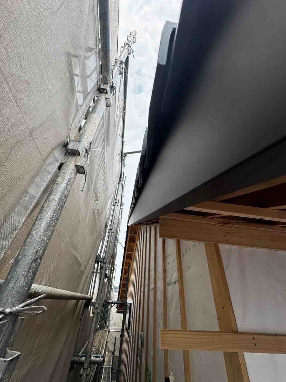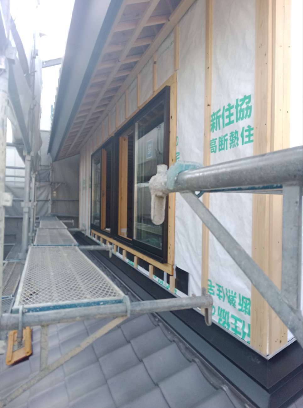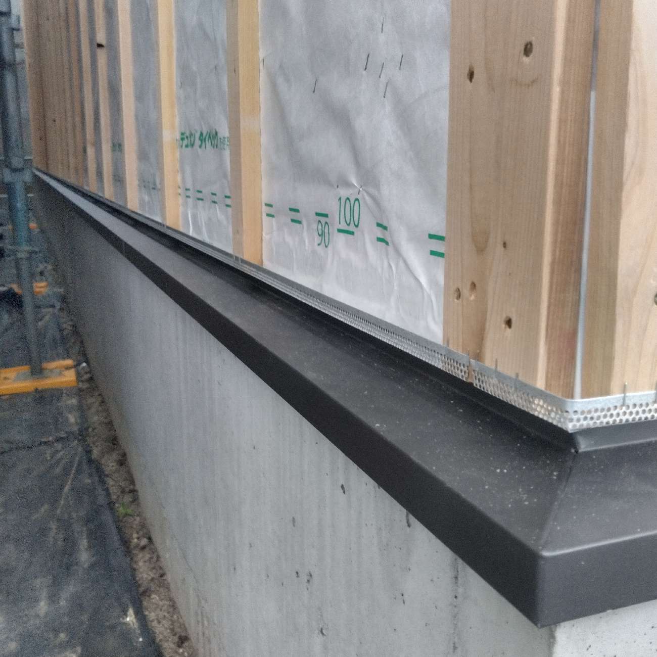 母屋の外部は、y江板金さんが入っています。破風鼻隠し、土台水切りの施工が終わった様子です。