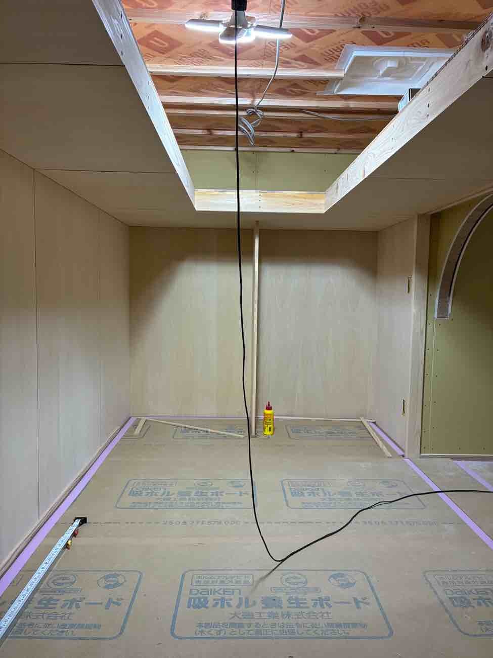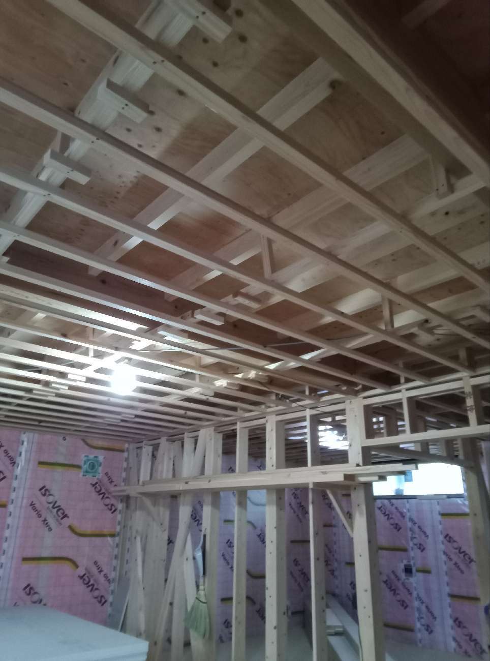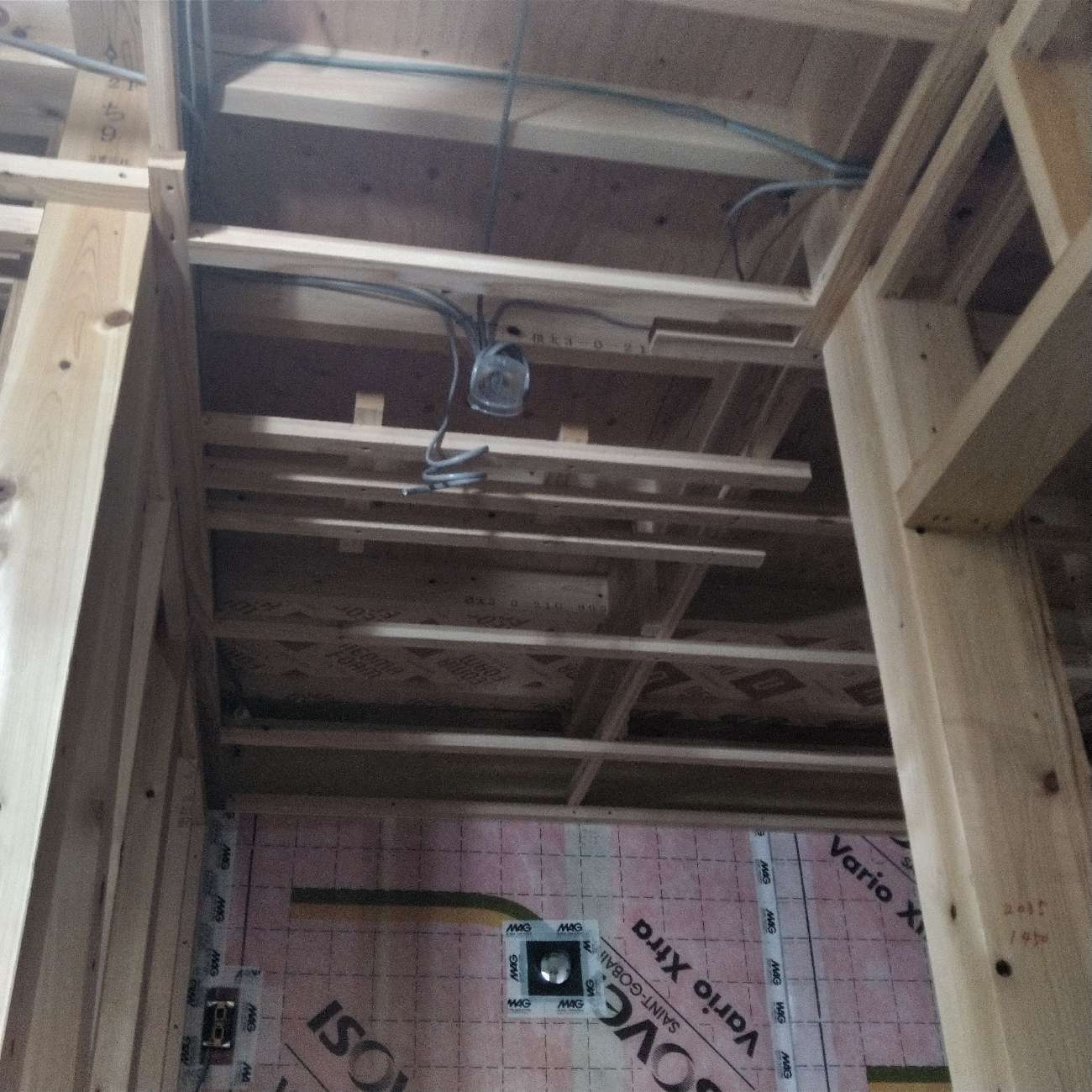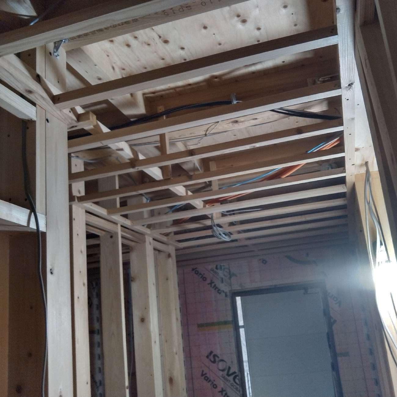 母屋も、天井の下地を組んでいます。シューズクローゼットの部分は、壁にエコカラットを貼り、それを照らすように間接照明を入れたいとの事で、コーニス照明用のBOXも取り付けられました。