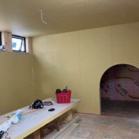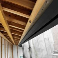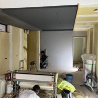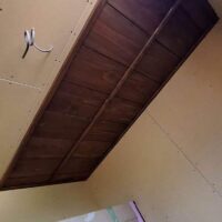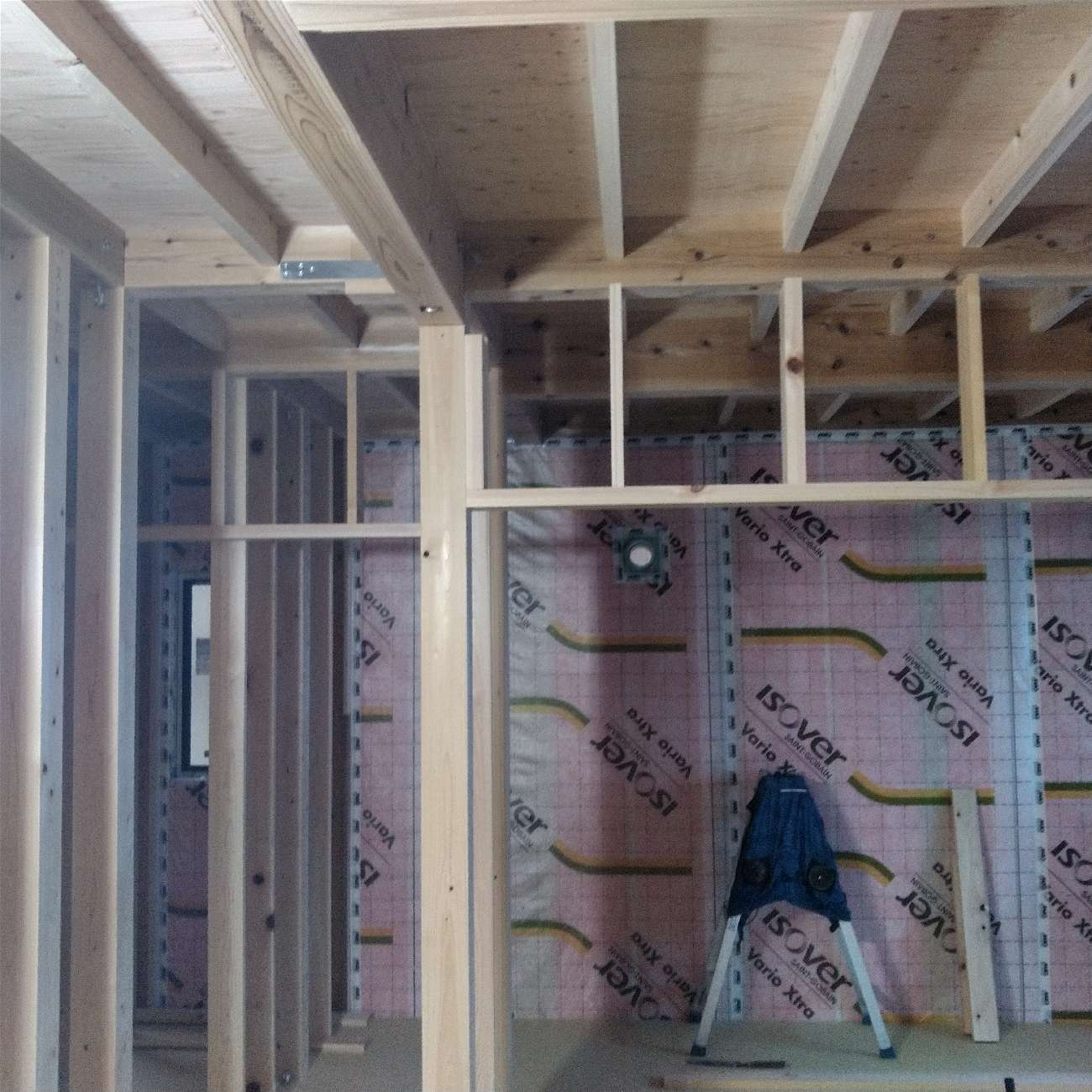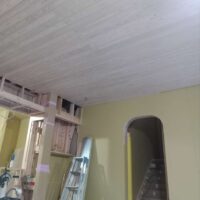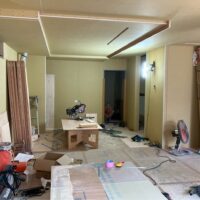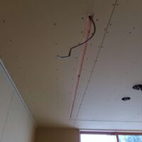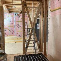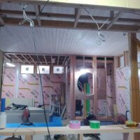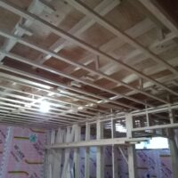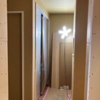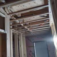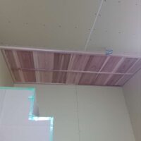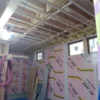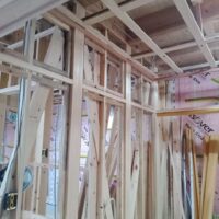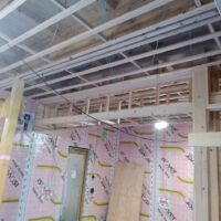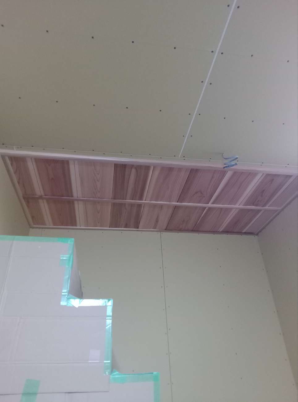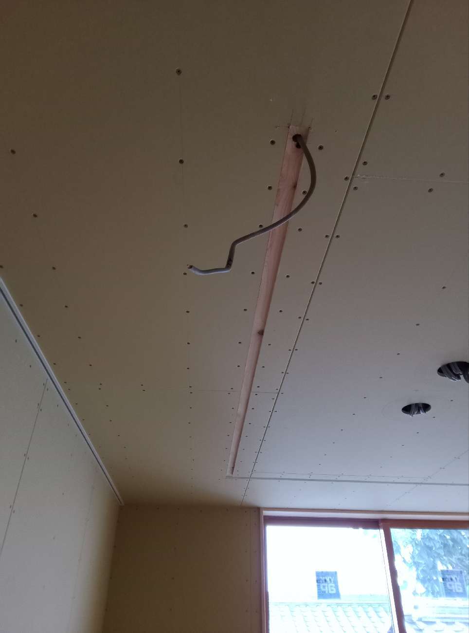 母屋も、天井の下地を組んでいます。シューズクローゼットの部分は、壁にエコカラットを貼り、それを照らすように間接照明を入れたいとの事で、コーニス照明用のBOXも取り付けられました。