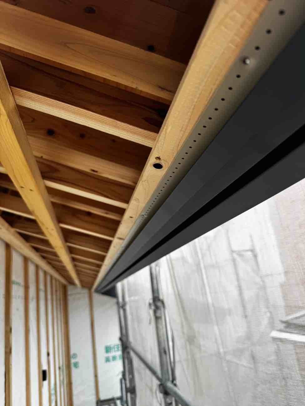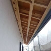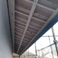 軒裏の通気金物と、軒裏に張るサイディングの下地が取り付けられました。