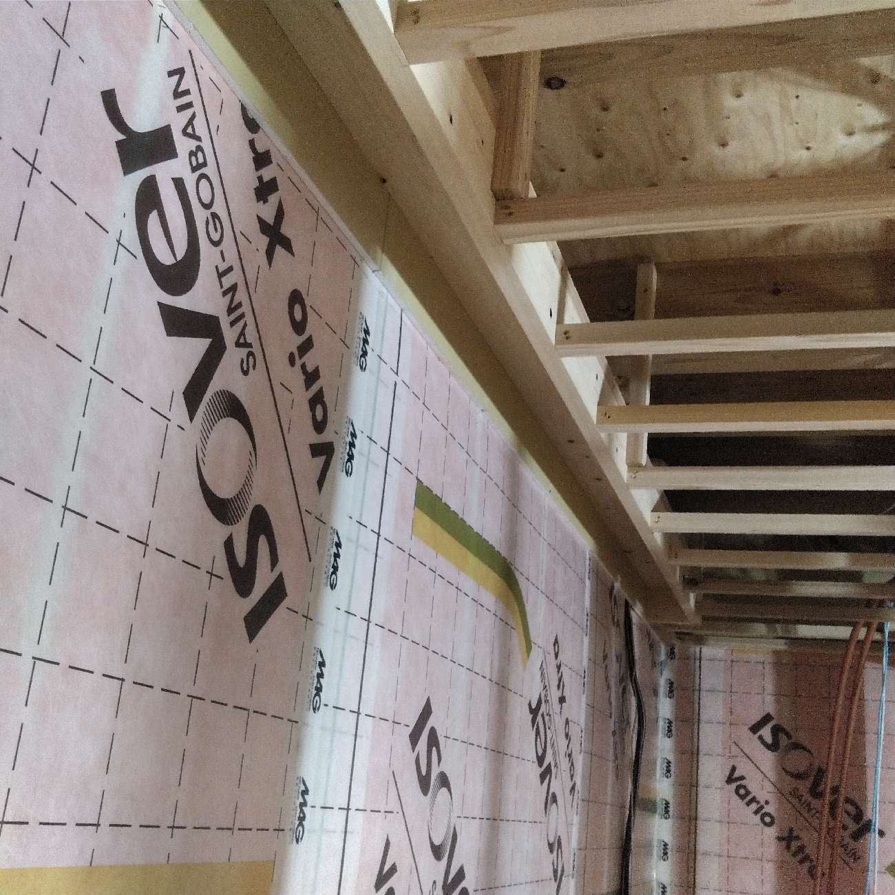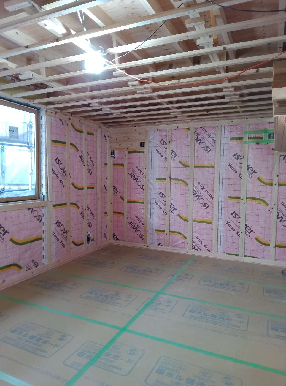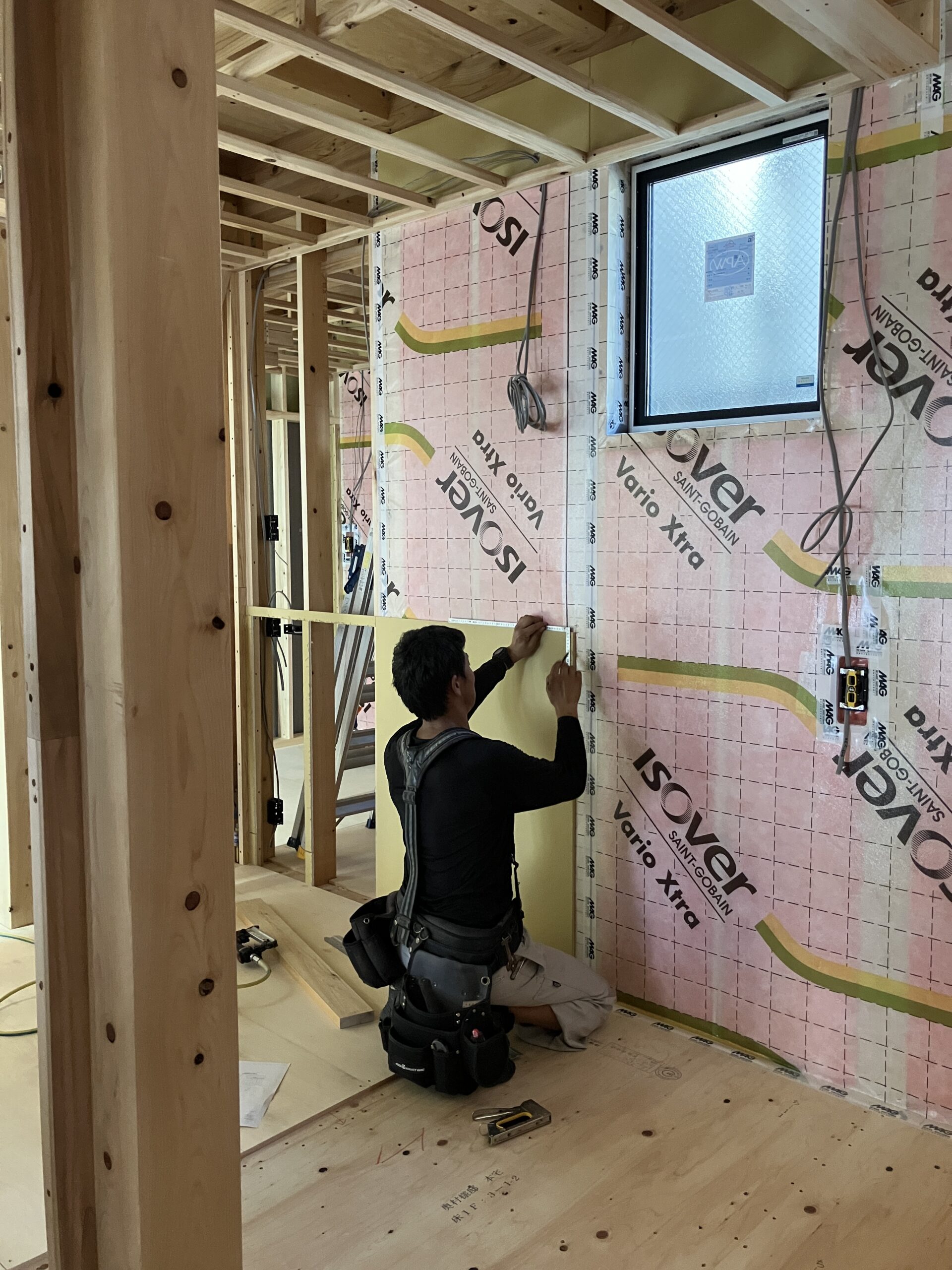 h典棟梁の母屋も、充填断熱を入れつつ、可変性調湿気密シートを施工しています。可変性調湿気密シートは、こちらも壁体内に入り込んだ湿気を室内に放出し、室内の湿気を壁体内に流入しない優れものです。