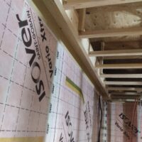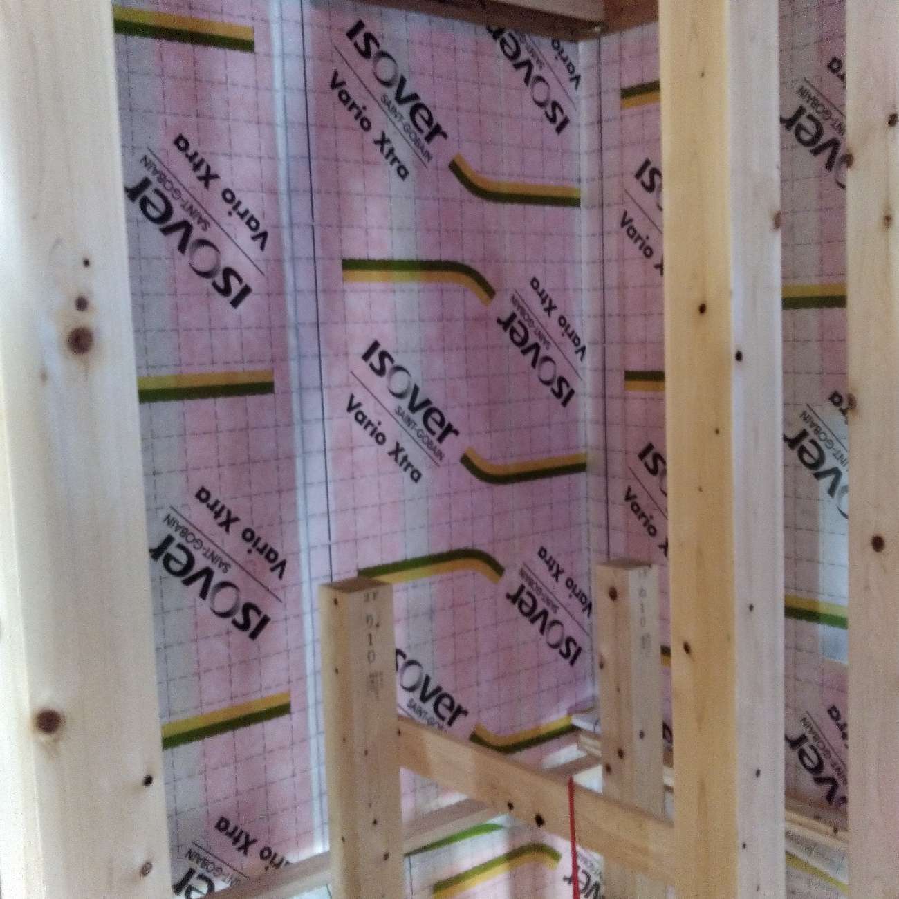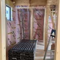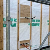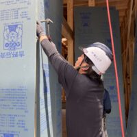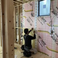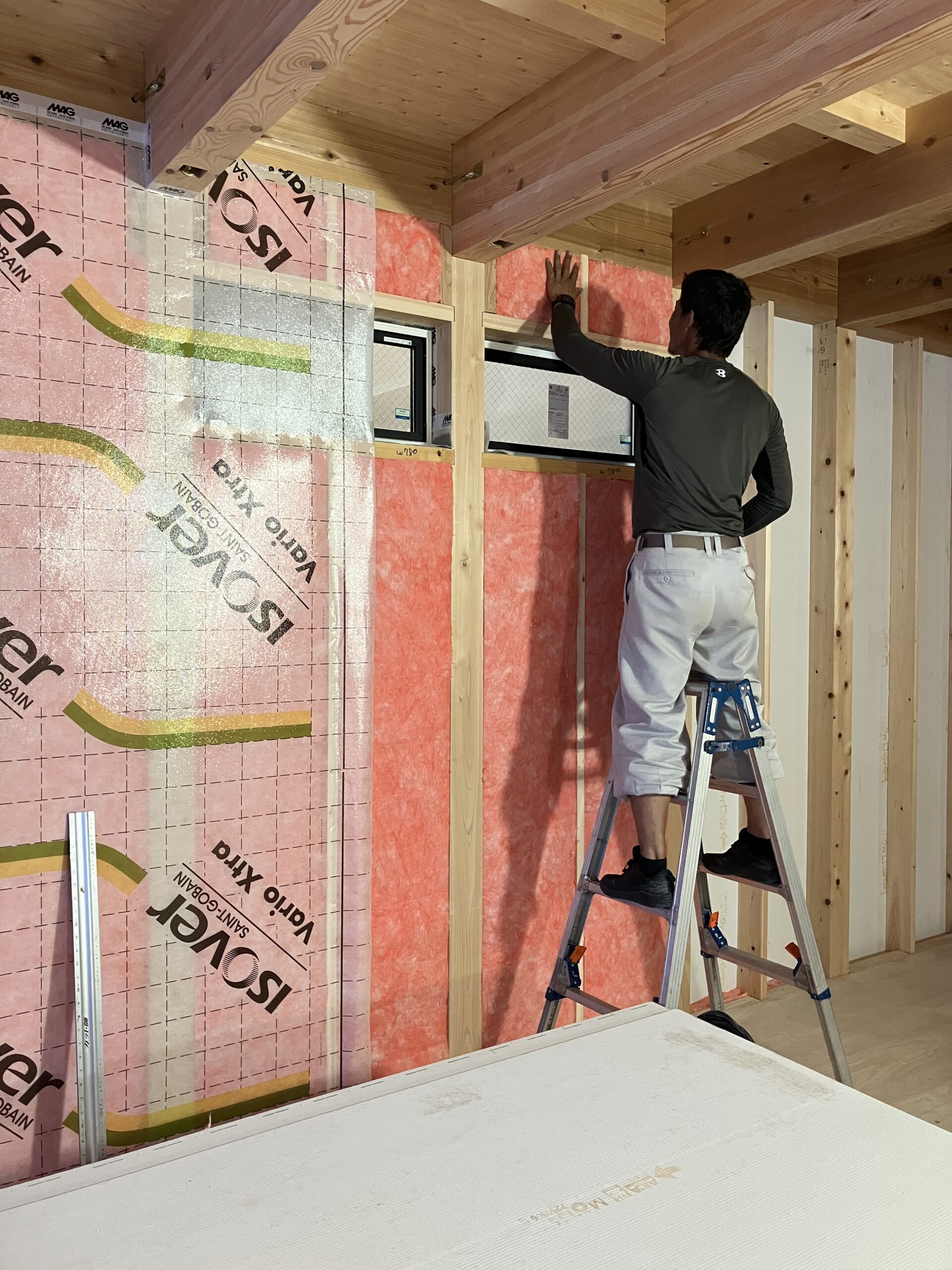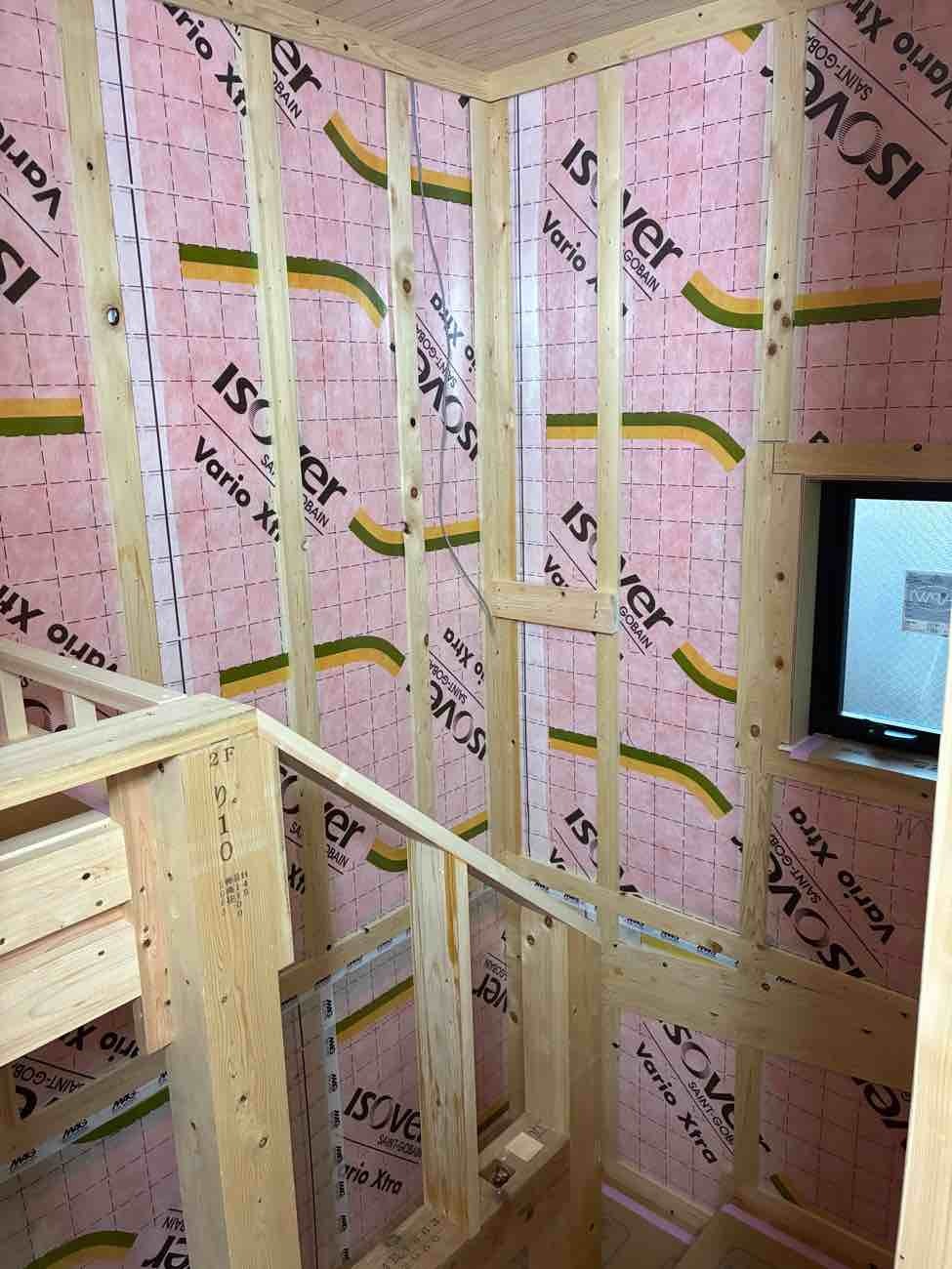 h典棟梁の母屋も、充填断熱を入れつつ、可変性調湿気密シートを施工しています。可変性調湿気密シートは、こちらも壁体内に入り込んだ湿気を室内に放出し、室内の湿気を壁体内に流入しない優れものです。