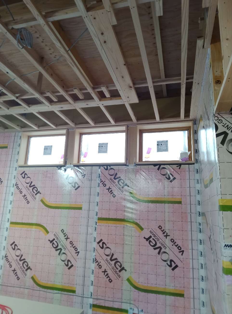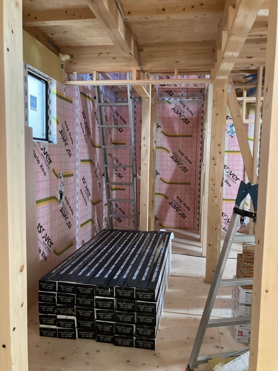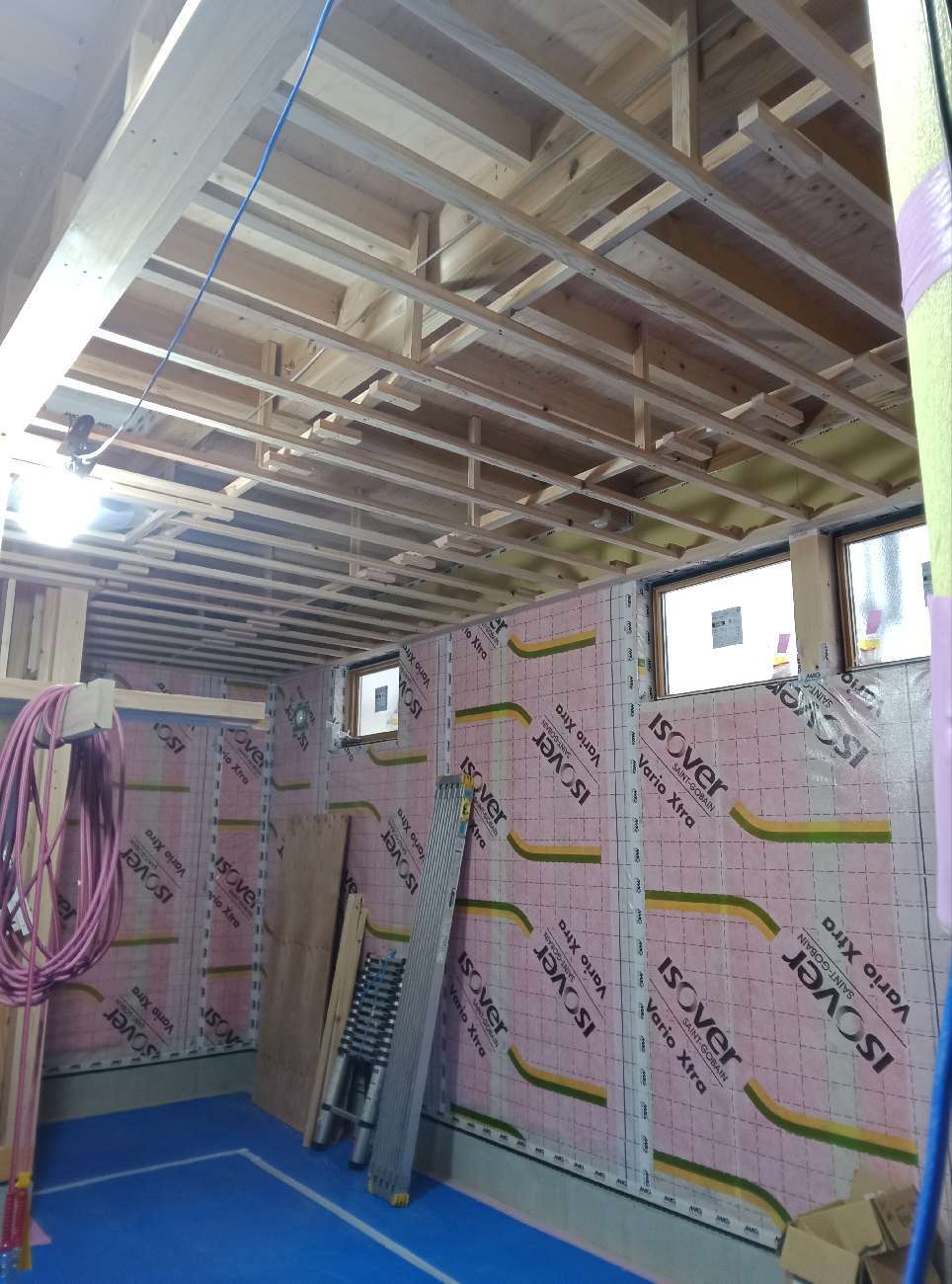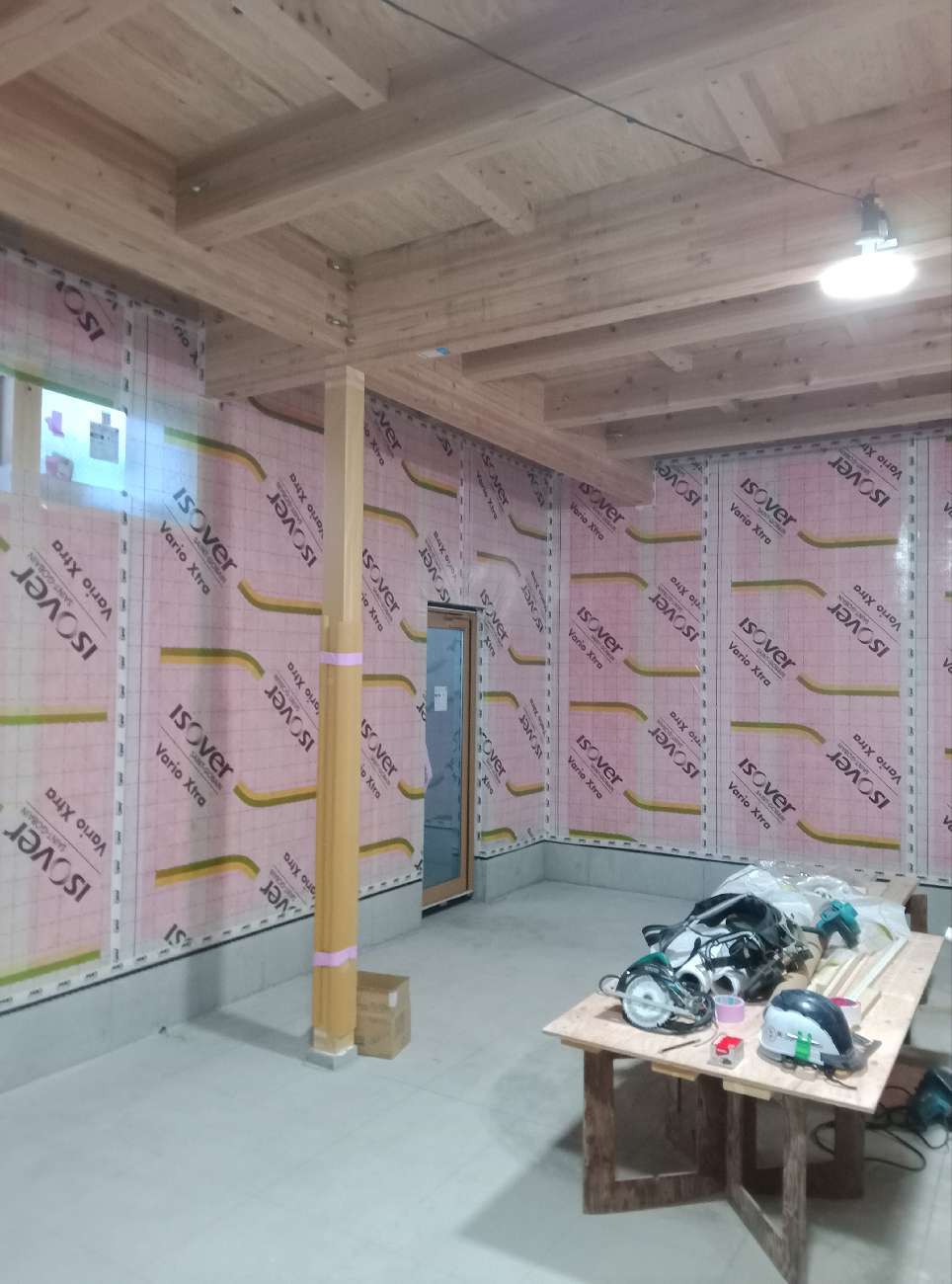 離れは、1階、2階共に壁の充填断熱(柱と間柱に入れる断熱)を入れ、可変性調湿気密シートも張り終えています。この可変性調湿気密シートを縦に張った方が施工性が良いよと気付いてくださったのが、何を隠そう~k池大棟梁👍梁までの高さは、ほぼどの壁も一緒なので、シートを切る効率も上がりそうですね。