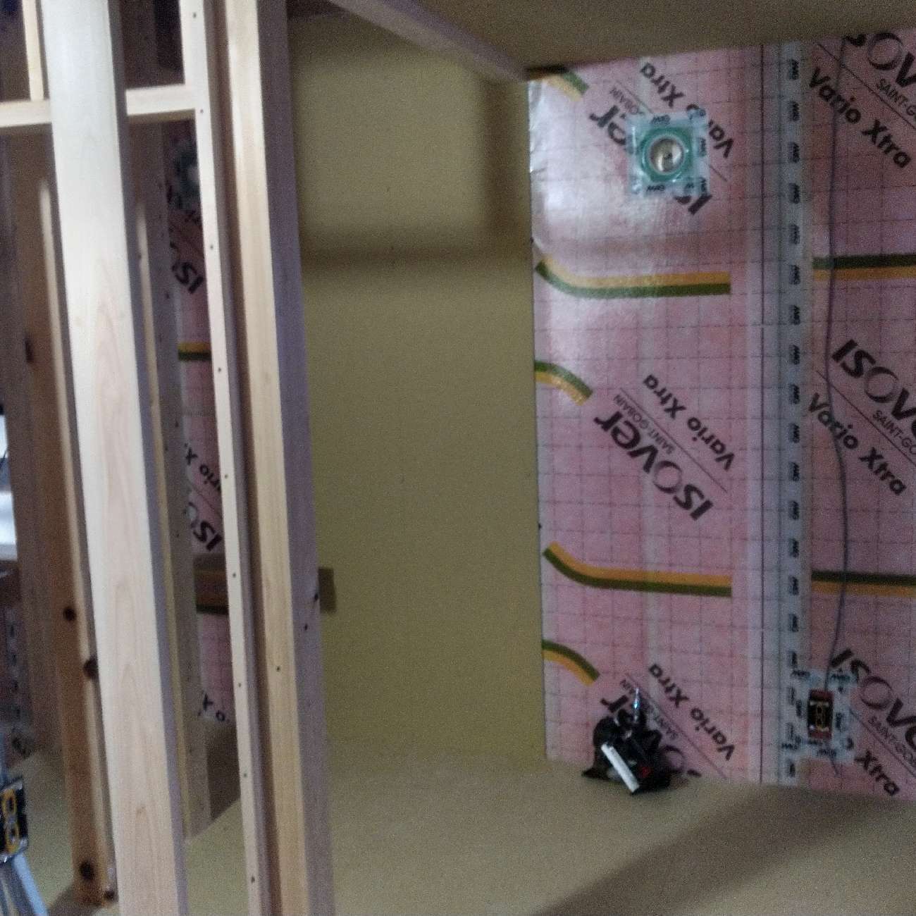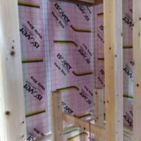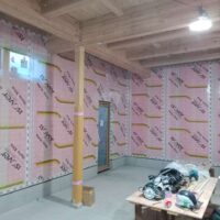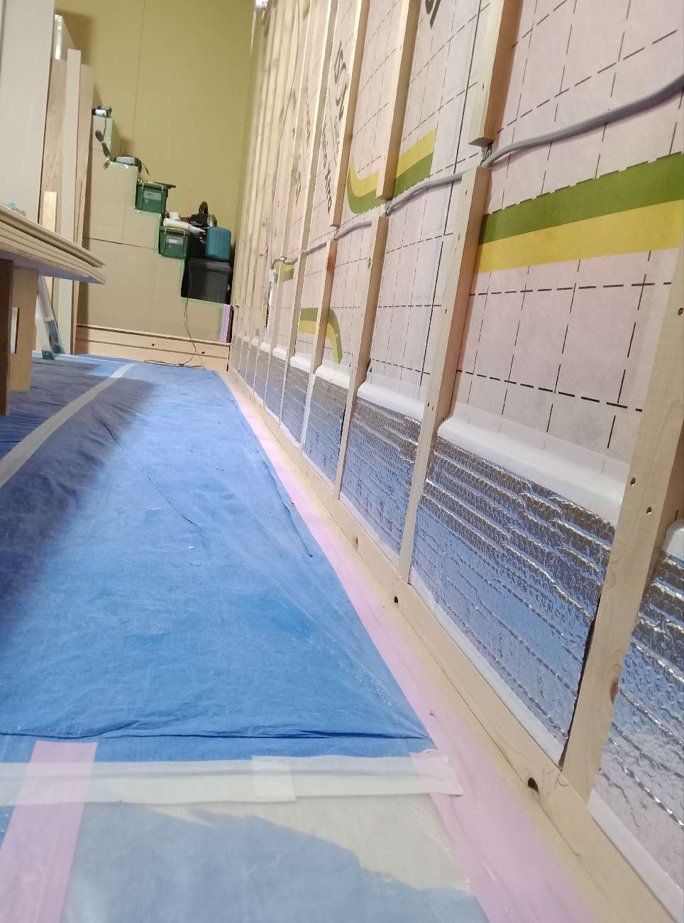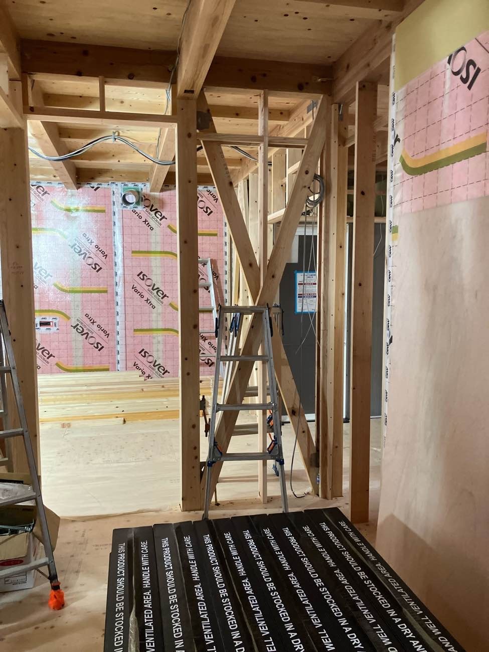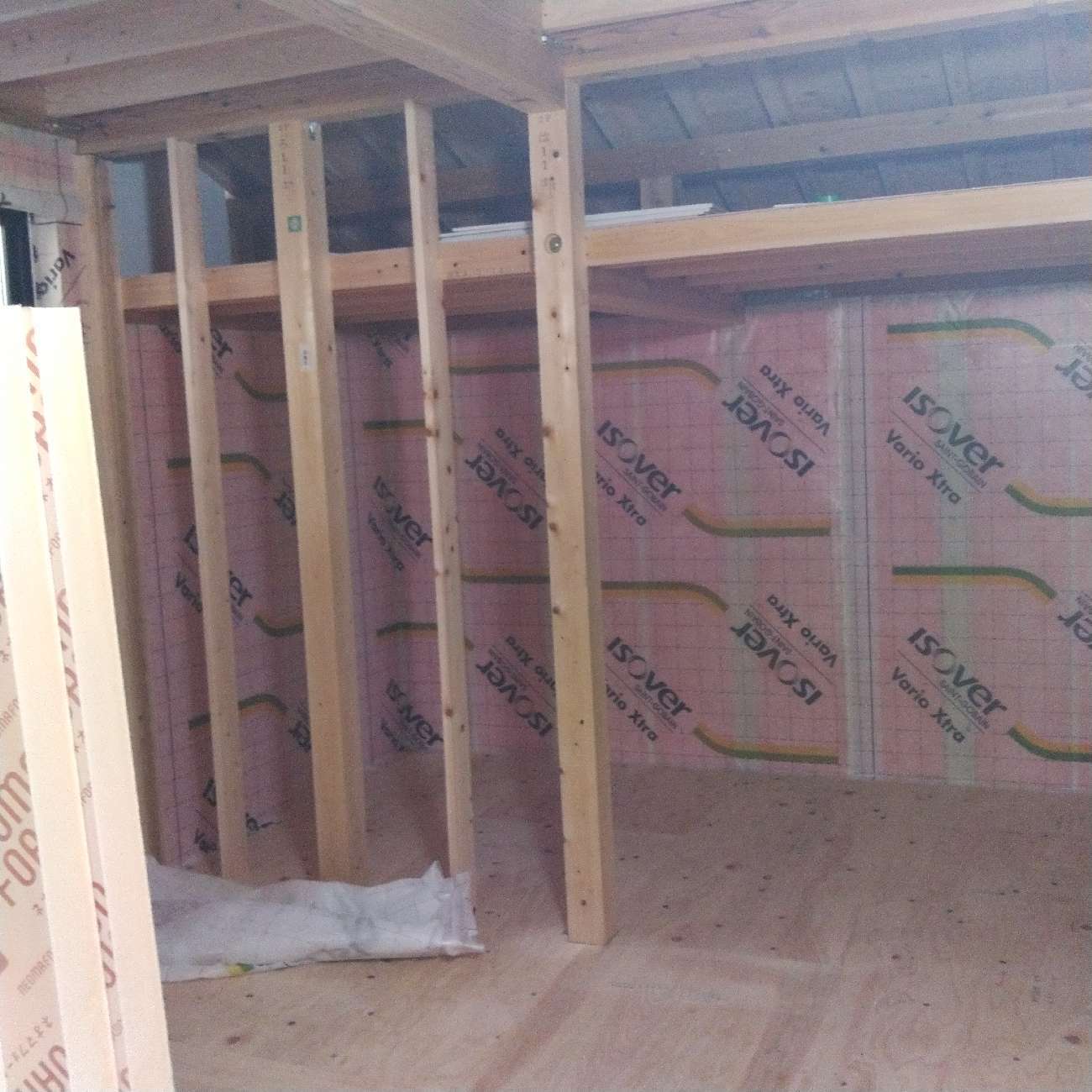 離れは、1階、2階共に壁の充填断熱(柱と間柱に入れる断熱)を入れ、可変性調湿気密シートも張り終えています。この可変性調湿気密シートを縦に張った方が施工性が良いよと気付いてくださったのが、何を隠そう~k池大棟梁👍梁までの高さは、ほぼどの壁も一緒なので、シートを切る効率も上がりそうですね。