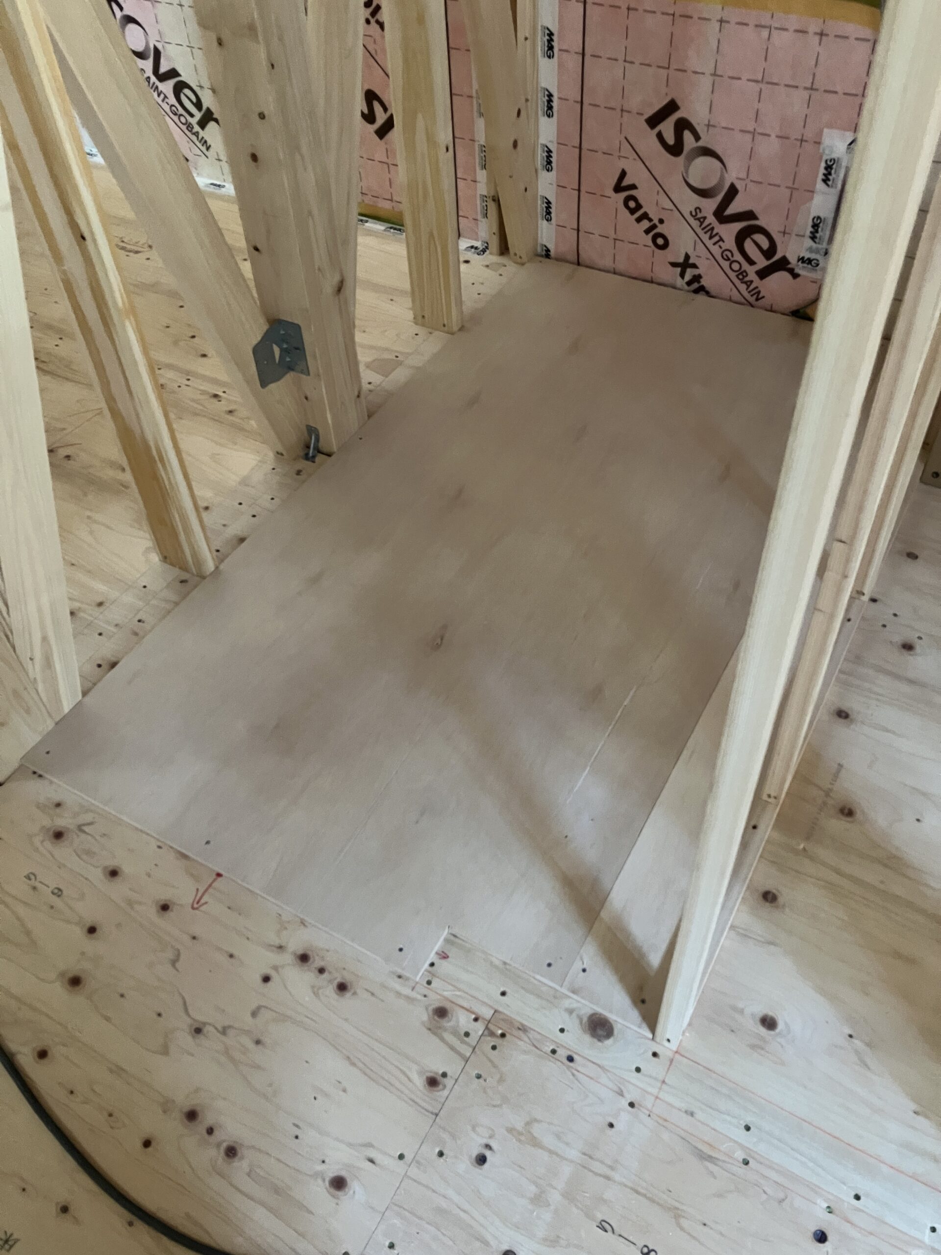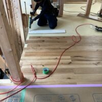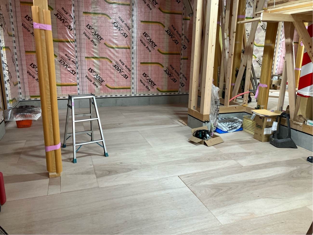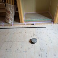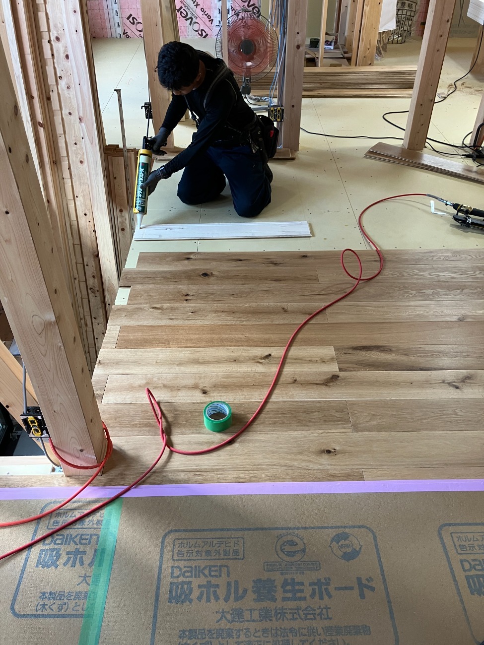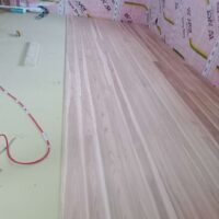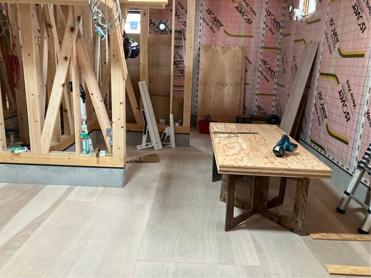 母屋は、h典棟梁が1階の床や洗面前のカウンターを造作しています。床は、水廻りにフロアタイルを採用されましたので、フローリングとの厚みの差分調整ベニヤを張っていきます。