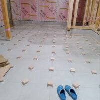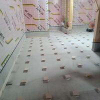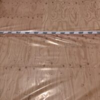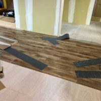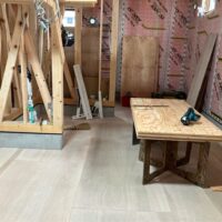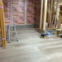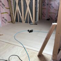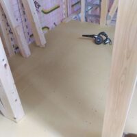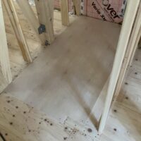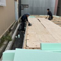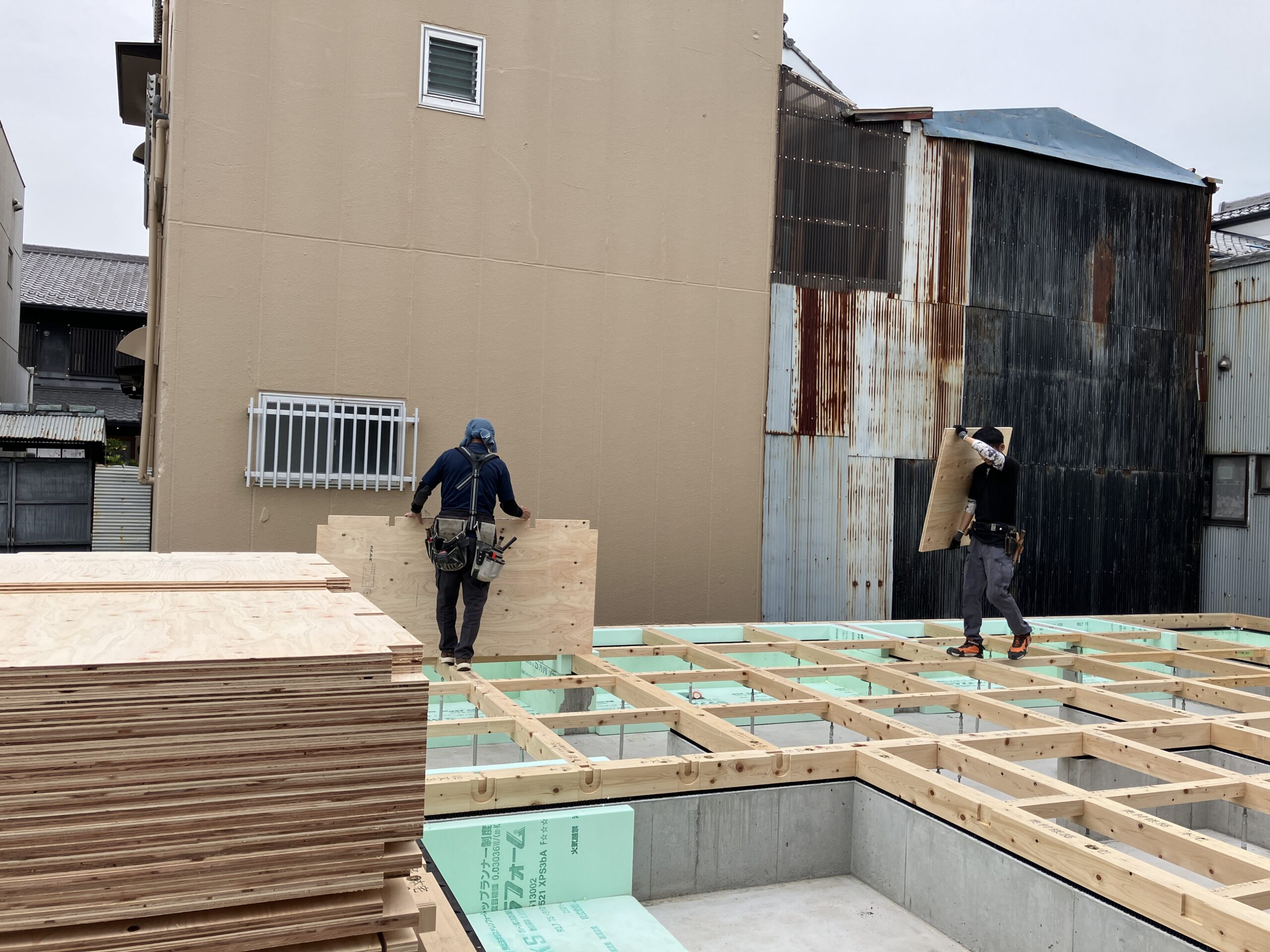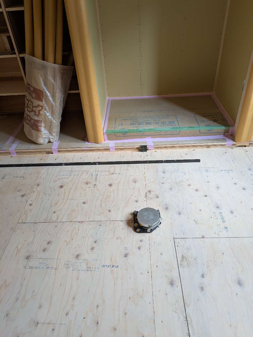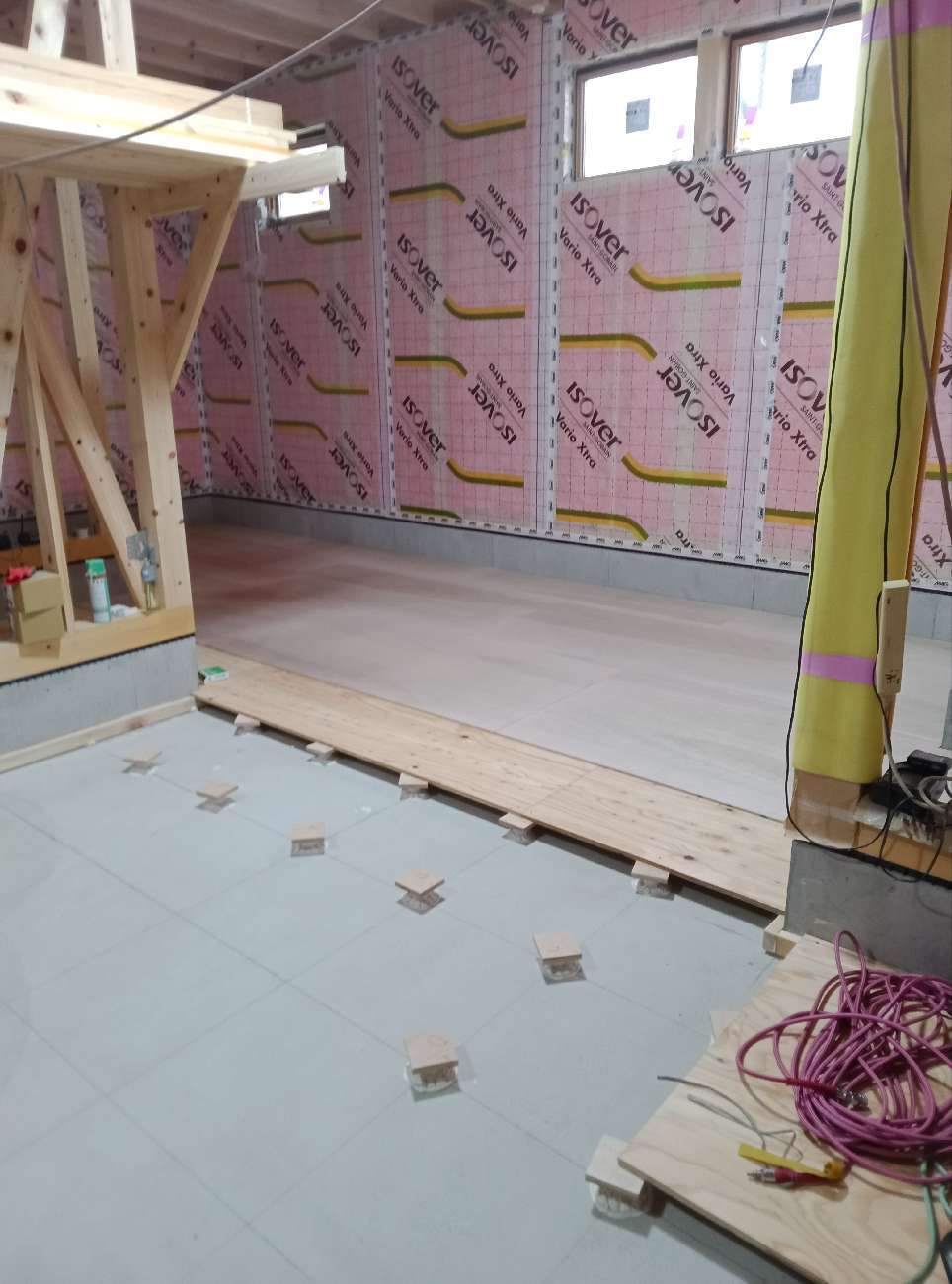 母屋は、h典棟梁が1階の床や洗面前のカウンターを造作しています。床は、水廻りにフロアタイルを採用されましたので、フローリングとの厚みの差分調整ベニヤを張っていきます。