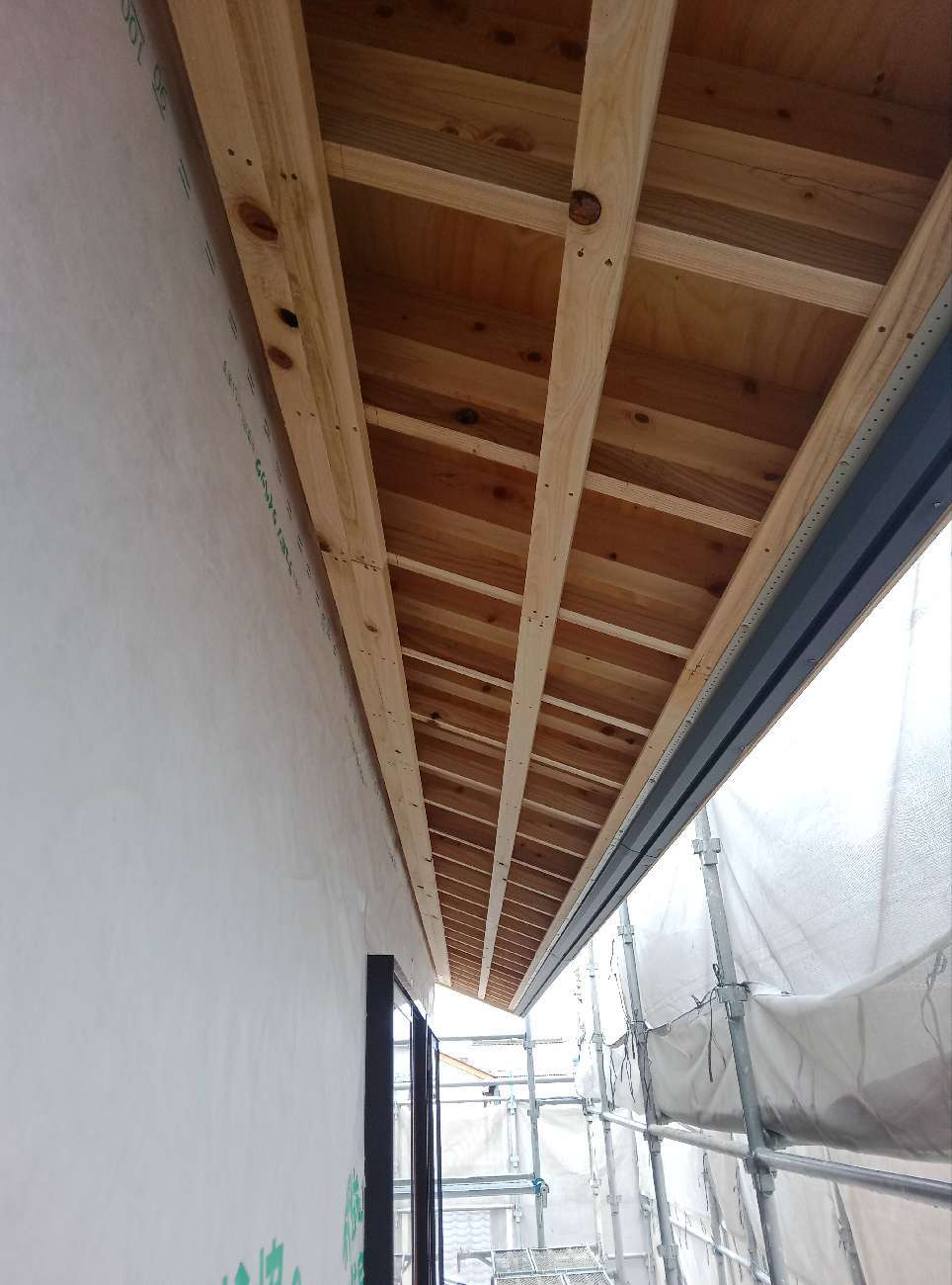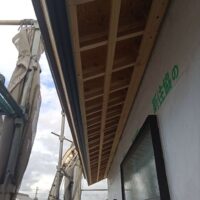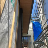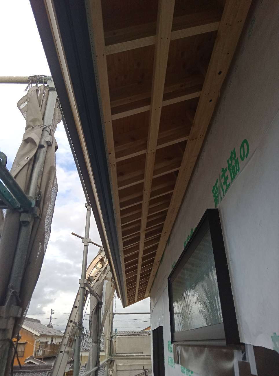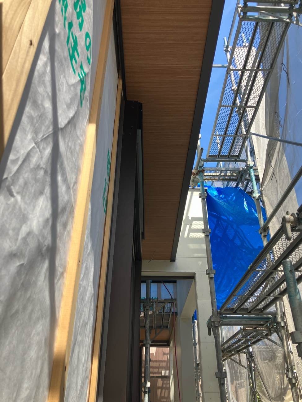 母屋は軒裏のサイディングを張っています。準防火地域になので、ミノワでよく張る羽目板は張れないので、木目調のサイディングを採用しています。景観条例があるけれど、準防火地域・・・風情ある町並みづくりを進めているエリアですが、少し矛盾を感じます・・・。告示で軒天の羽目板仕様を増やしてもらえるといいなぁと思ったりしています。