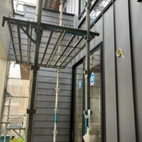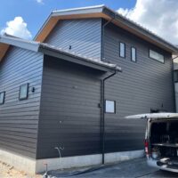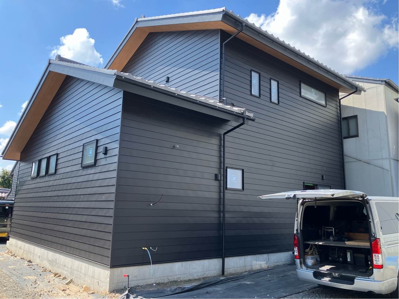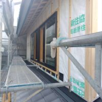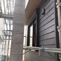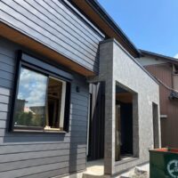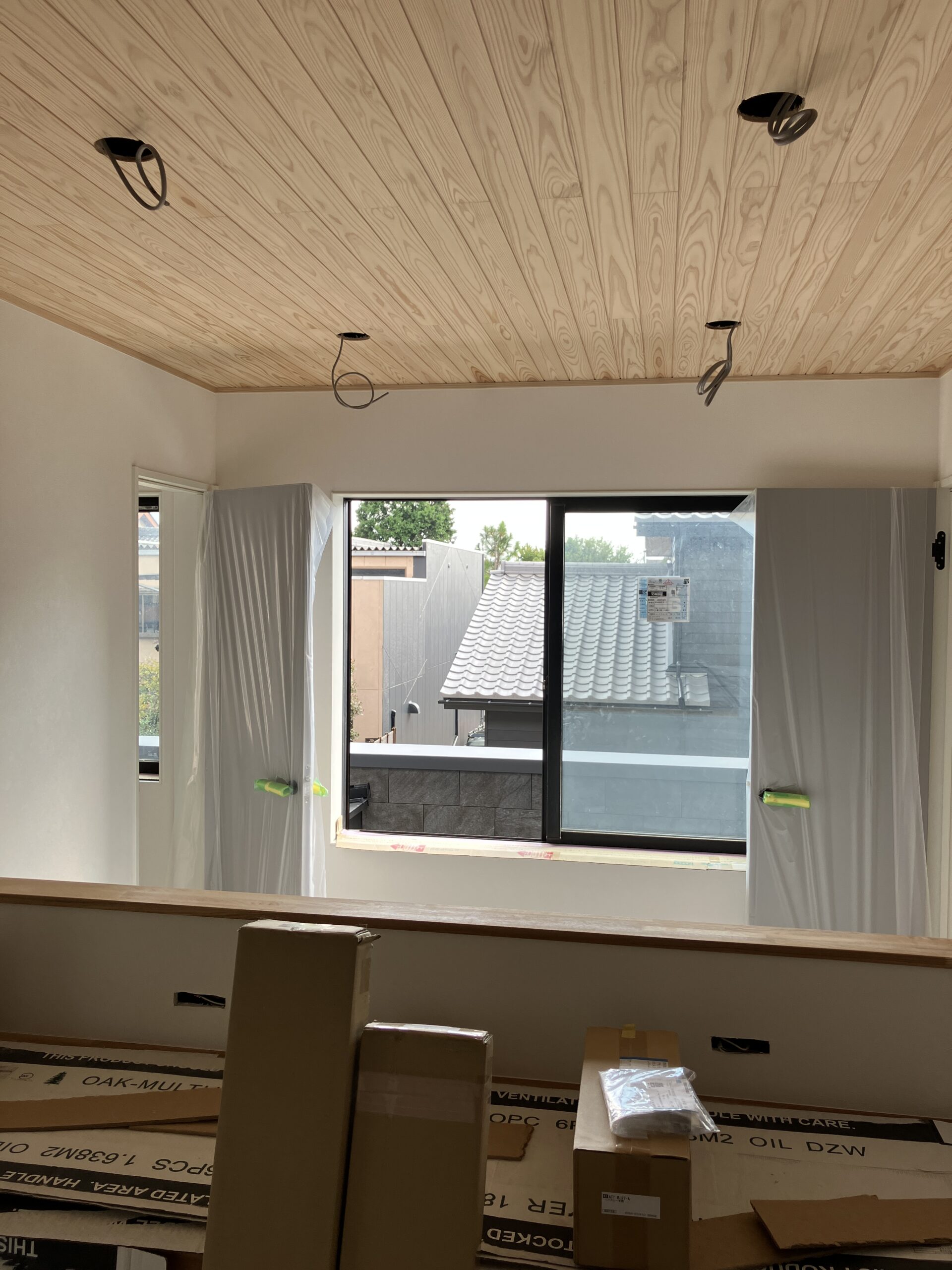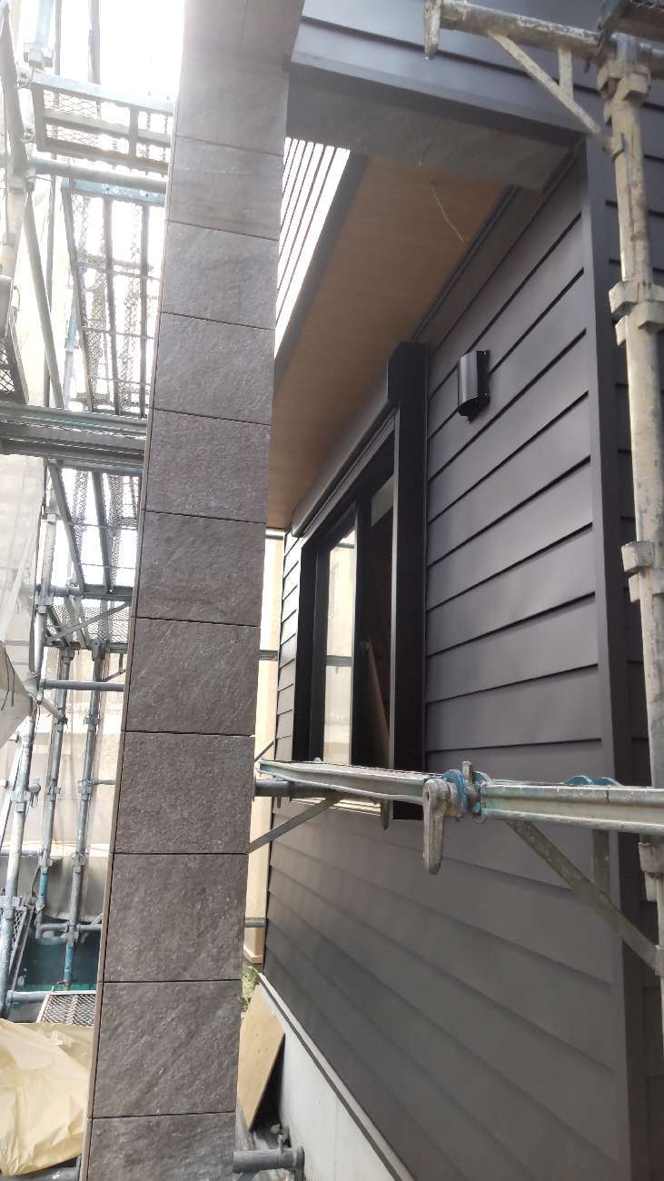 母屋は軒裏のサイディングを張っています。準防火地域になので、ミノワでよく張る羽目板は張れないので、木目調のサイディングを採用しています。景観条例があるけれど、準防火地域・・・風情ある町並みづくりを進めているエリアですが、少し矛盾を感じます・・・。告示で軒天の羽目板仕様を増やしてもらえるといいなぁと思ったりしています。