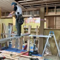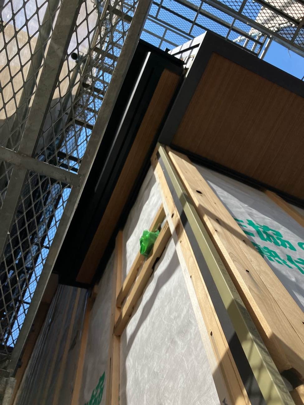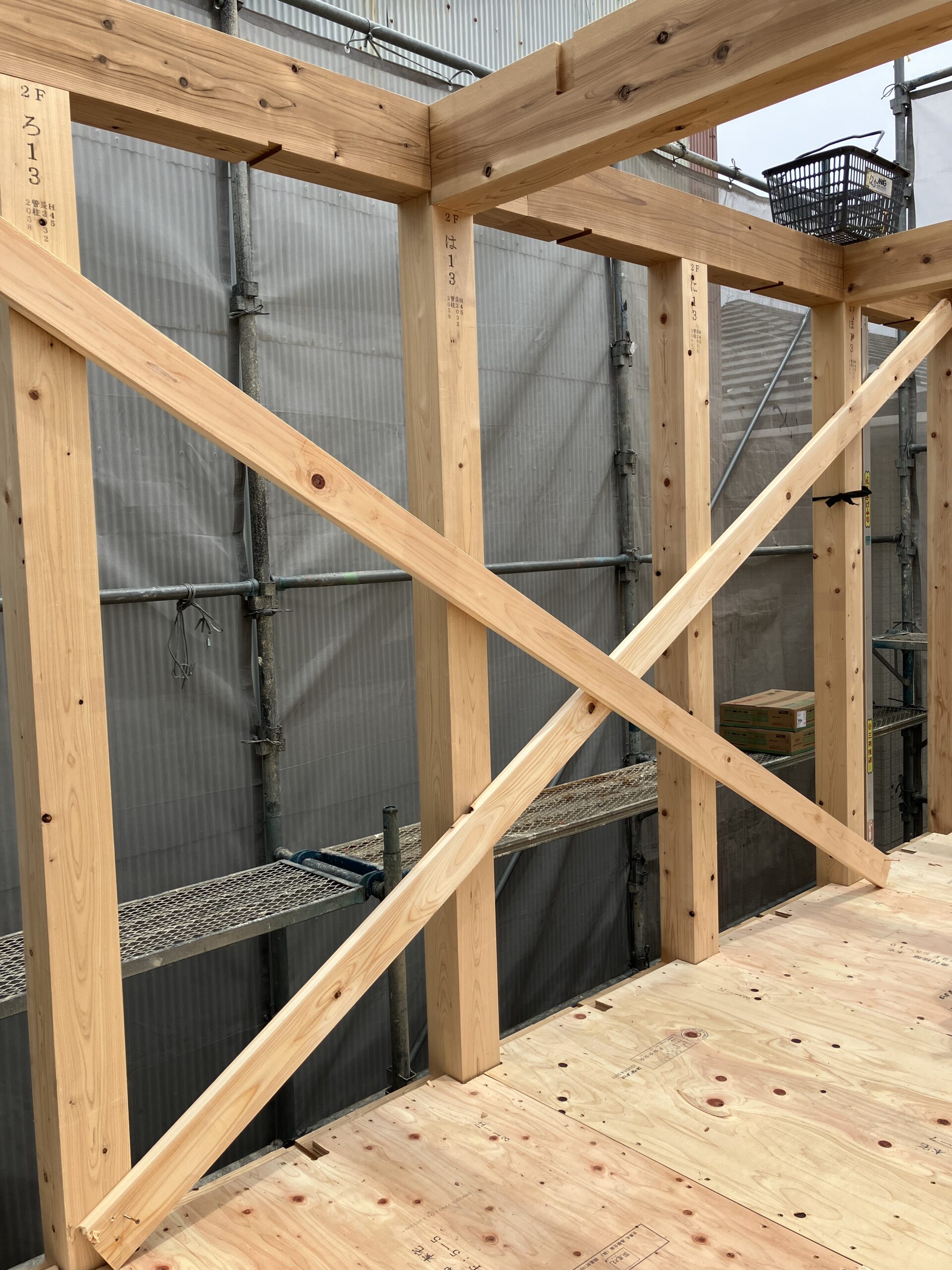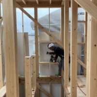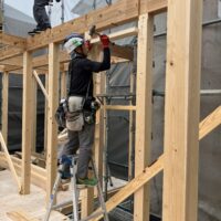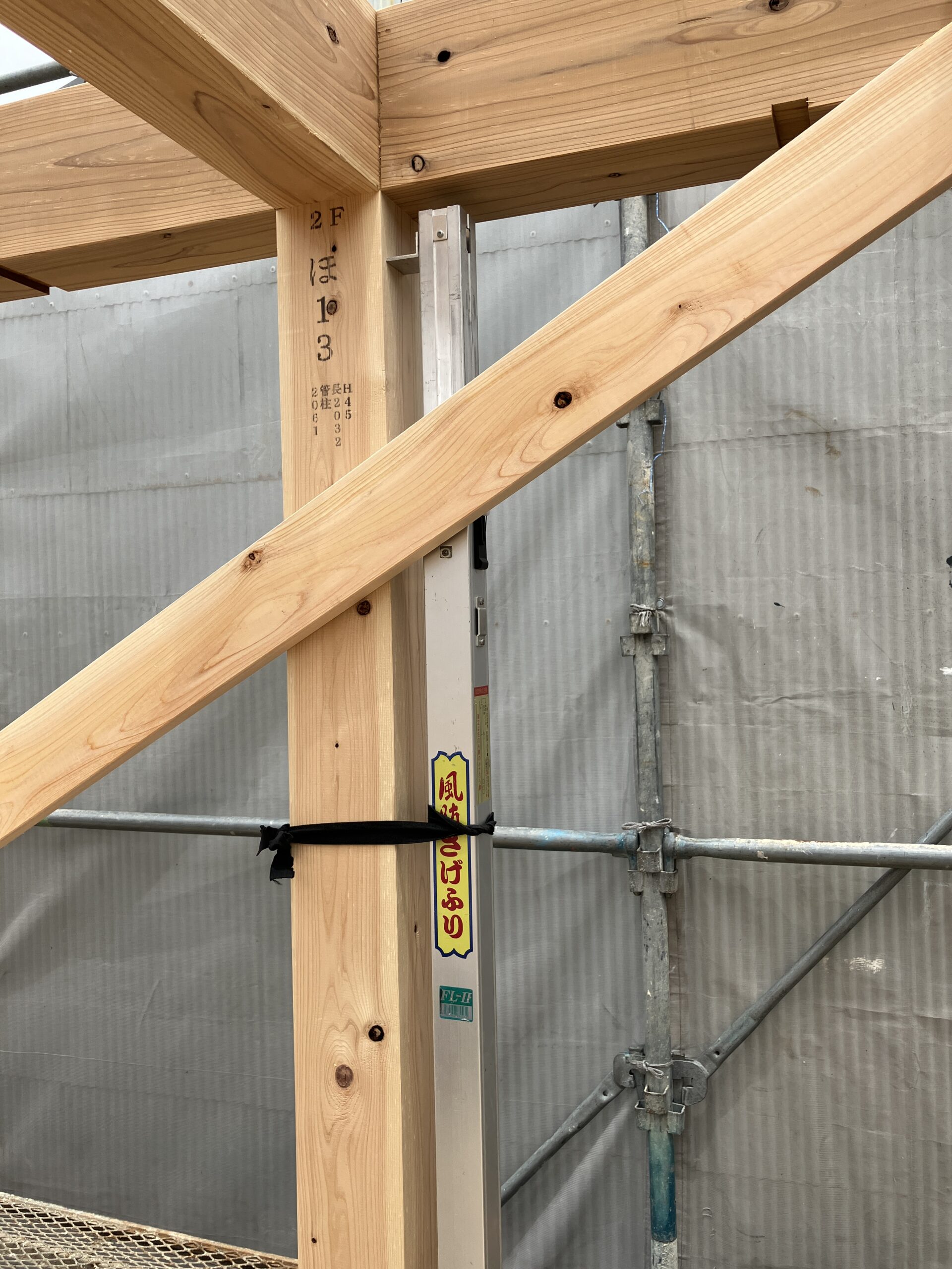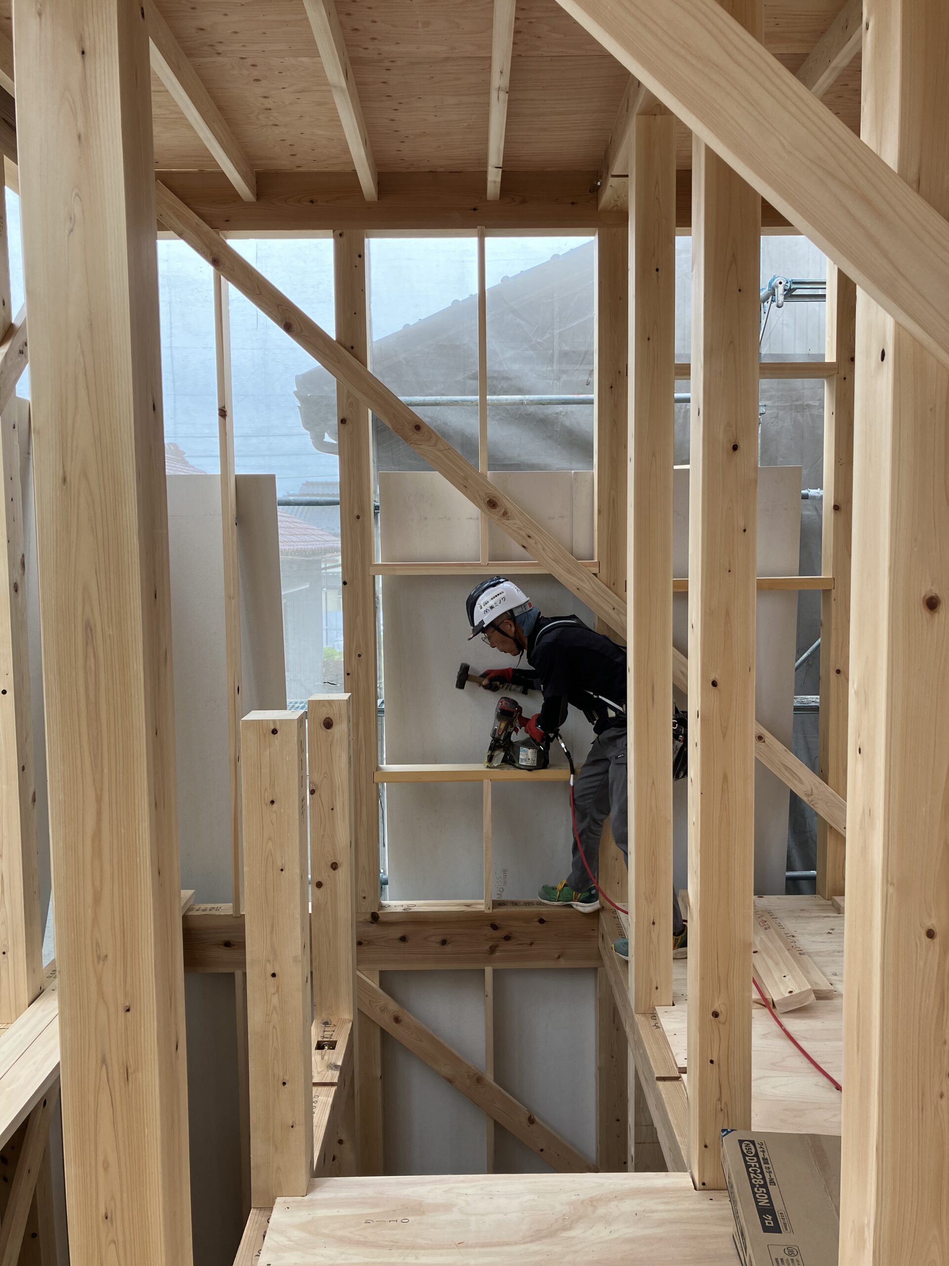 k池大棟梁は間柱や窓まぐさを取り付けるのに、昨日は苦戦しておりました。上階に下した耐力面材を早々と足場に立てかけられてしまい、間柱が入れにくい~留めにくい~💦もう少し耐力面材は後で降ろしてもらえると助かるなぁ~と思いつつ、粛々と作業されている様子です。