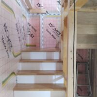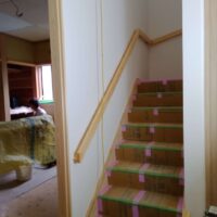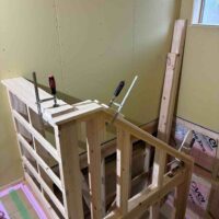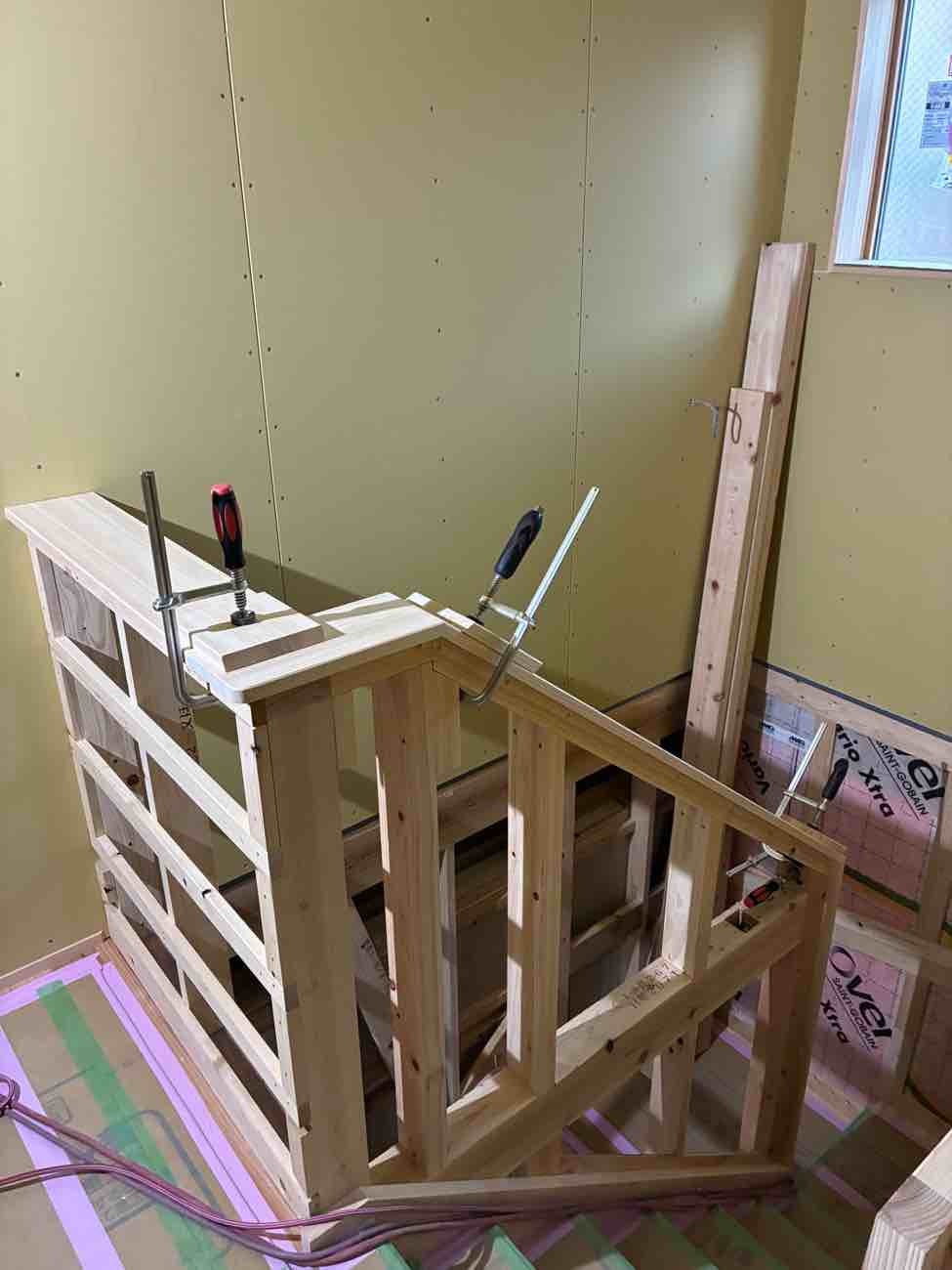階段の腰壁手摺の造作に取り掛かっています。k保木大工さんも応援に来て、急ピッチに進んでおります。