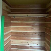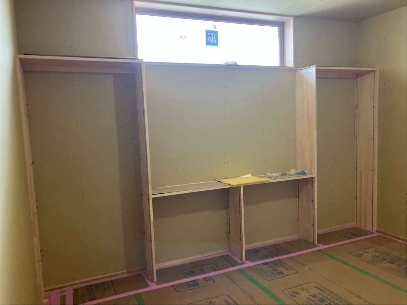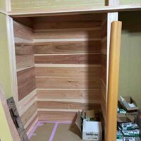 収納部分には、杉の相ジャクリ板が張られました。調湿性がある材料で、閉め切っておくことの多い収納部分にお勧めしています。k池大棟梁が加工してきた造作棚も取り付けられてきています。k保木大工さんが応援に来ているので、スピードが更に加速してきています。
