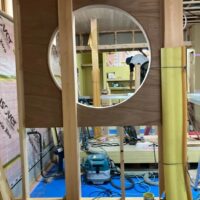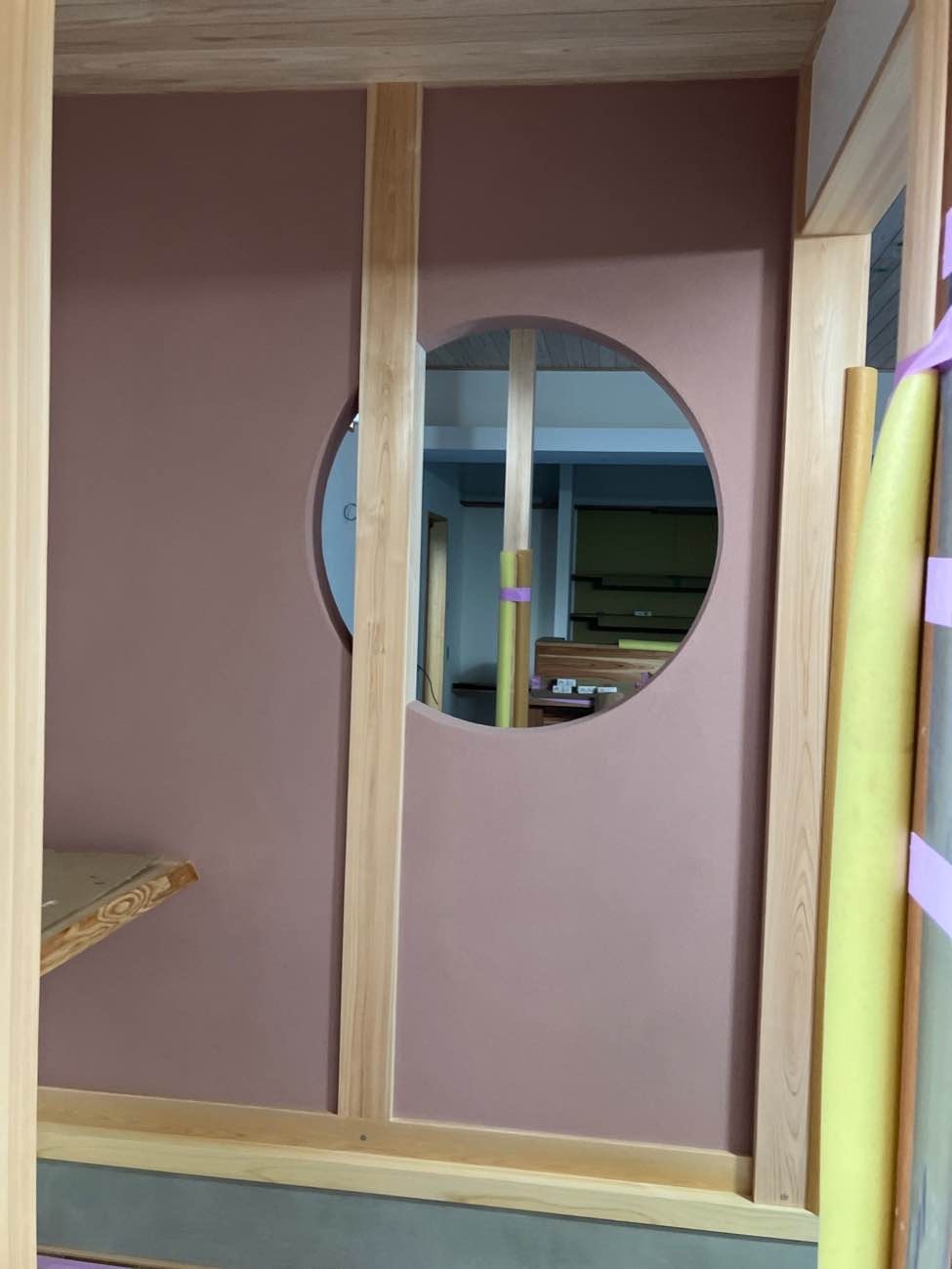 旧家の壁に似た色を、丸窓周りに選ばれました。クロス工事が終わったので、k池大棟梁が再び来られて、造作手すりも取り付けられました。