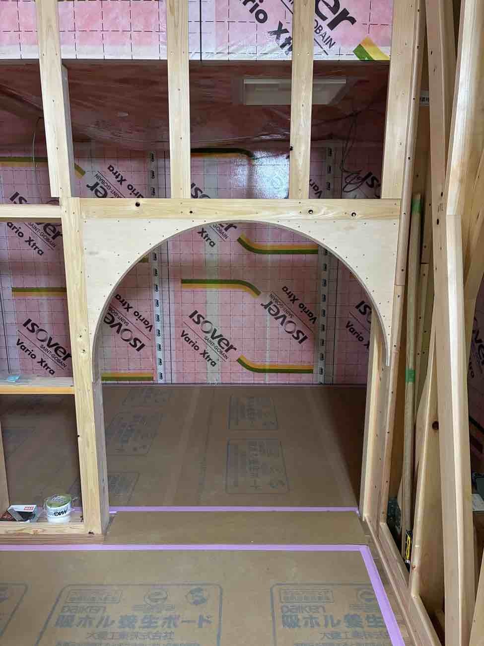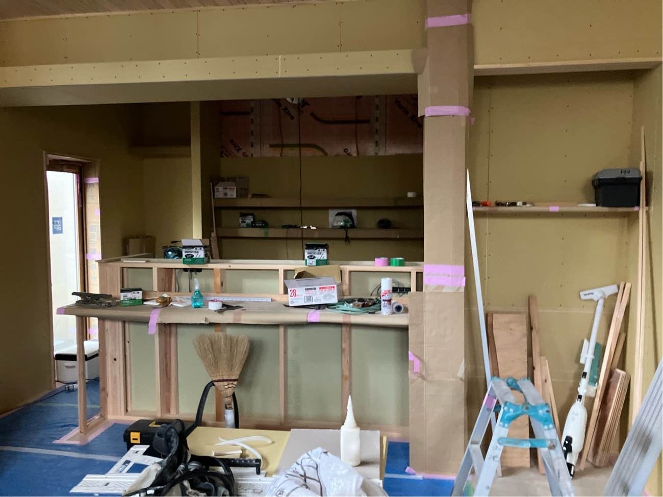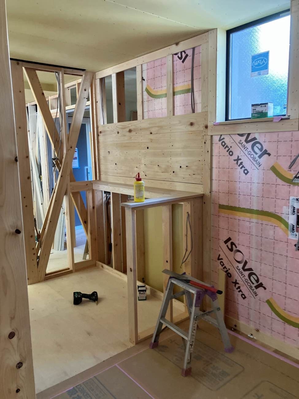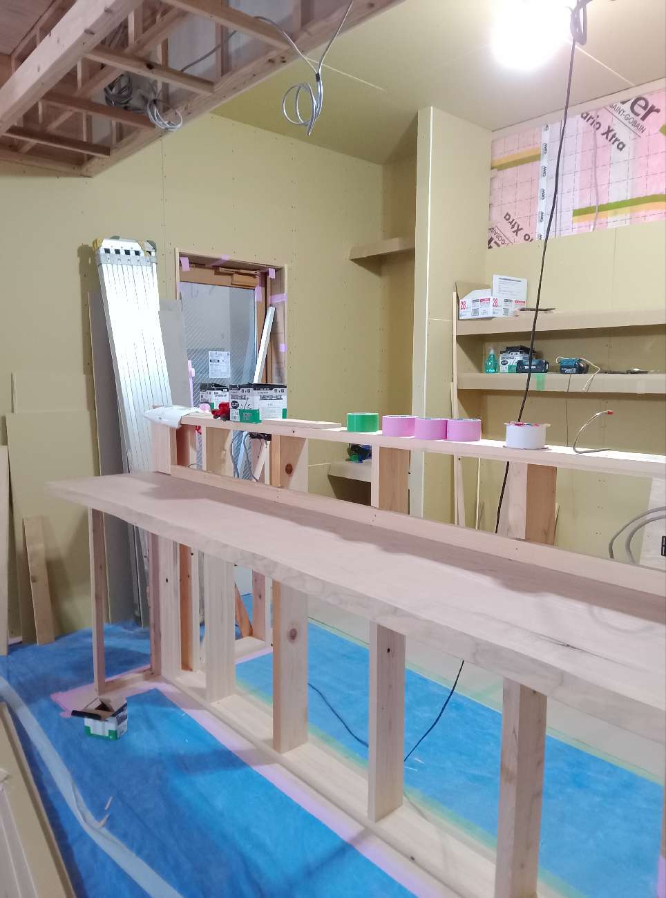 階段の手すり壁や、各所のカウンター下地、アール壁(こちらは洋風)の下地も取り付けられました。k保木大工さんが、こちらにも応援に来てくれています👍